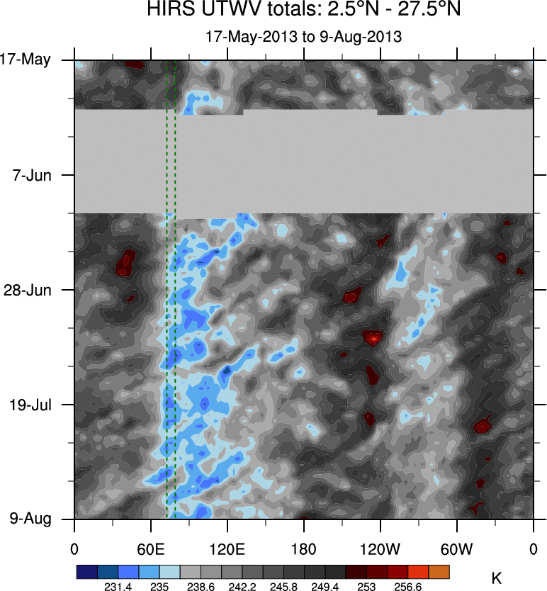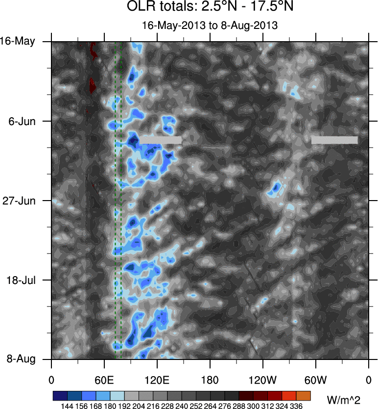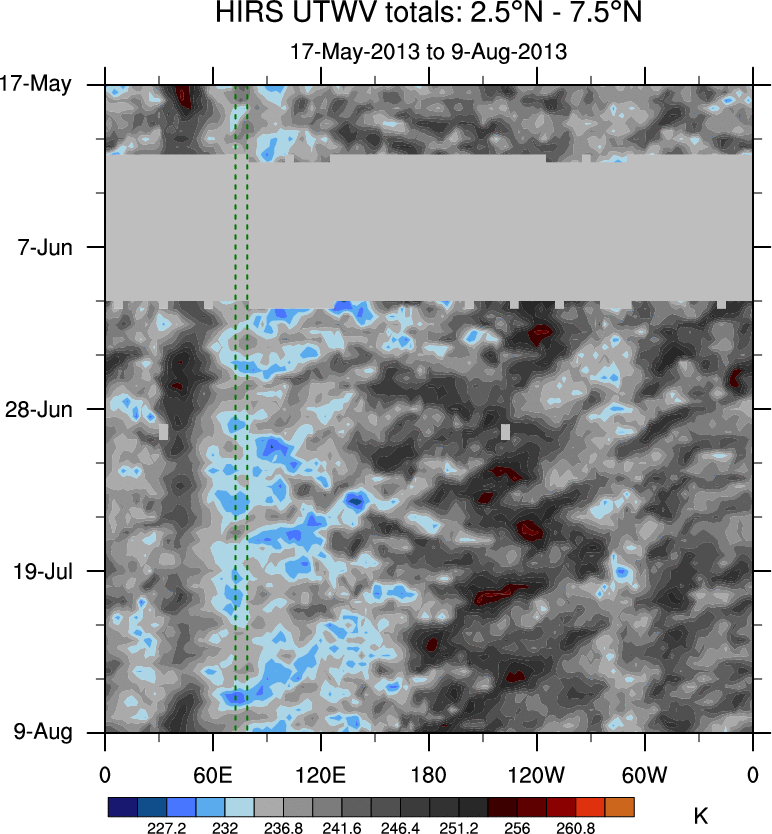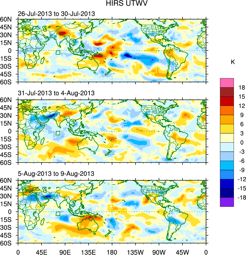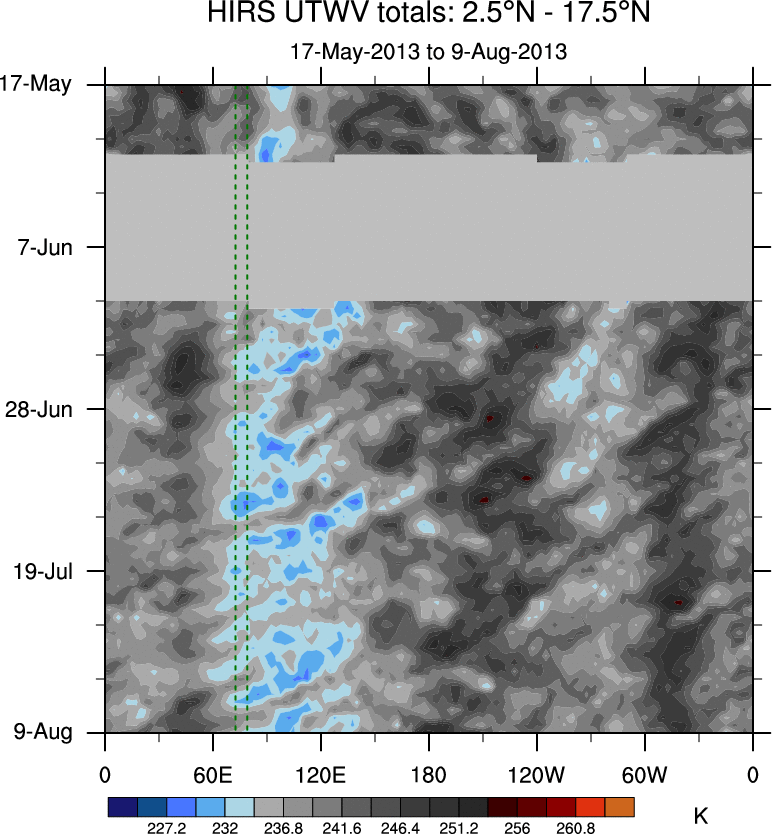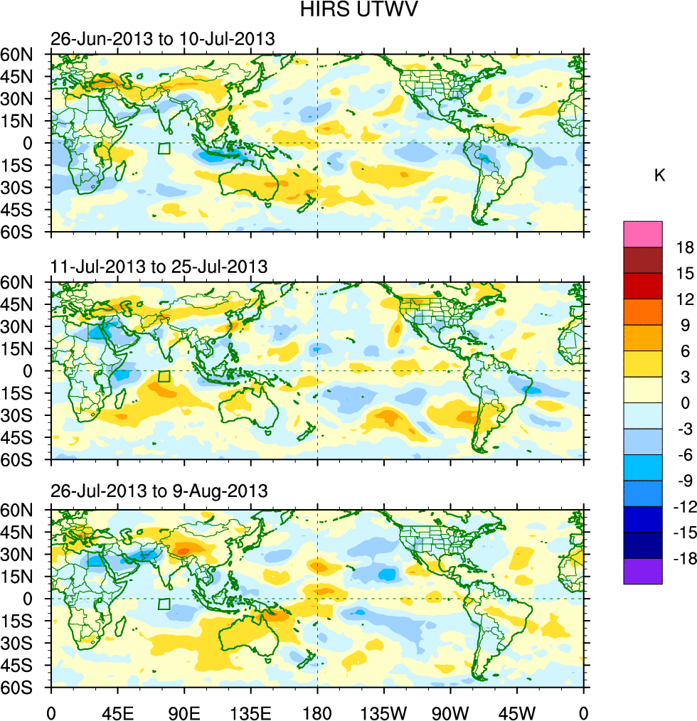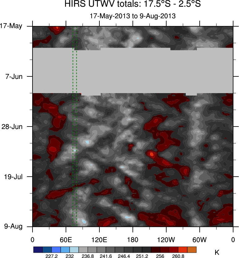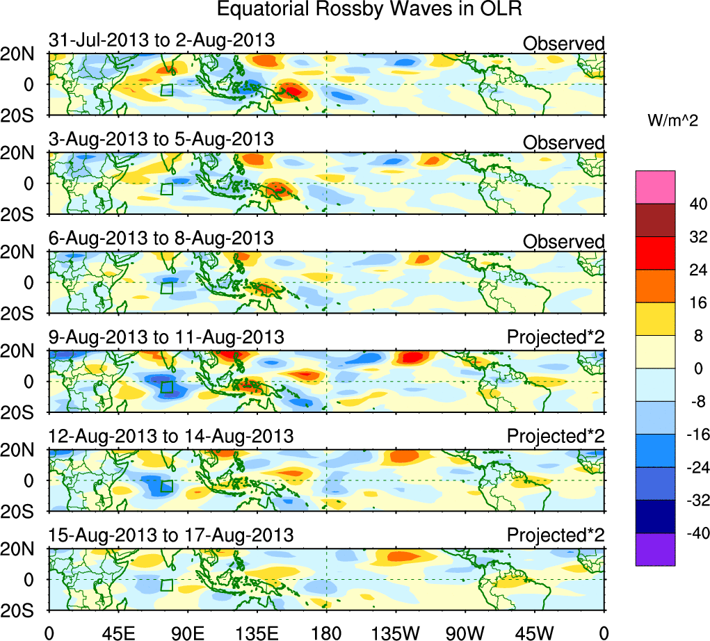 To identify tropical waves in near real-time, the OLR and UTWV data are filtered following Wheeler & Weickmann (2001 MWR). The daily anomalies are calculated using the first 3 harmonics of the seasonal cycle for 1979–2009. Missing values are then filled using linear interpolation in space and time. The most recent 365 days of anomalies are padded with 659 days of zeroes, and the result is filtered for each wave type.