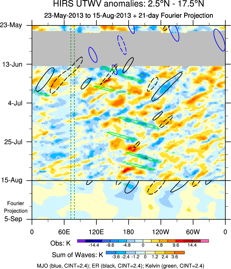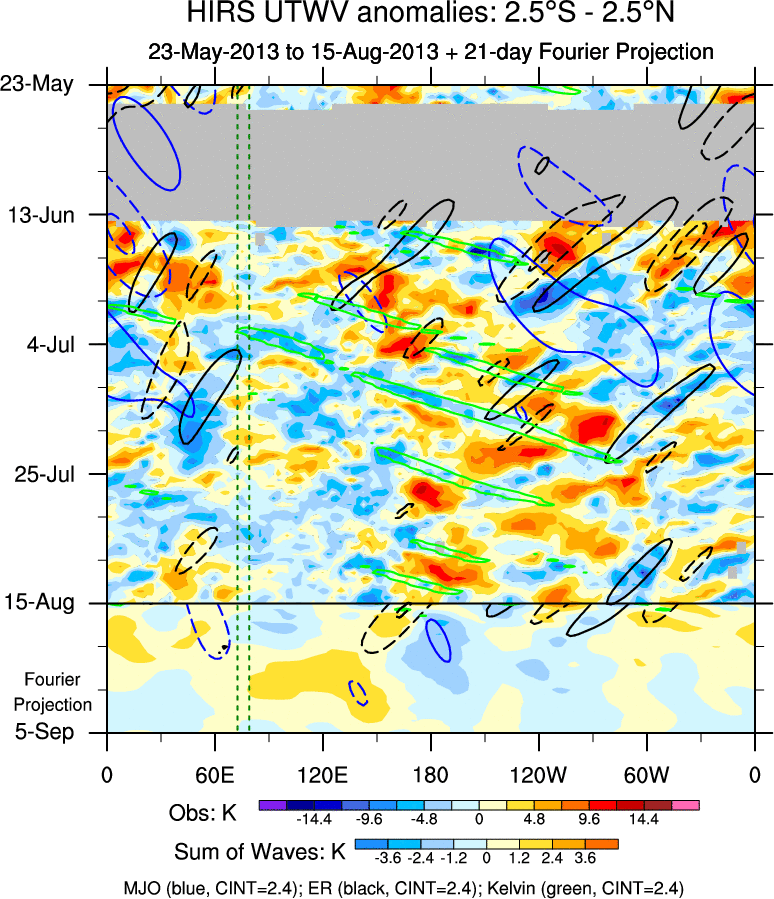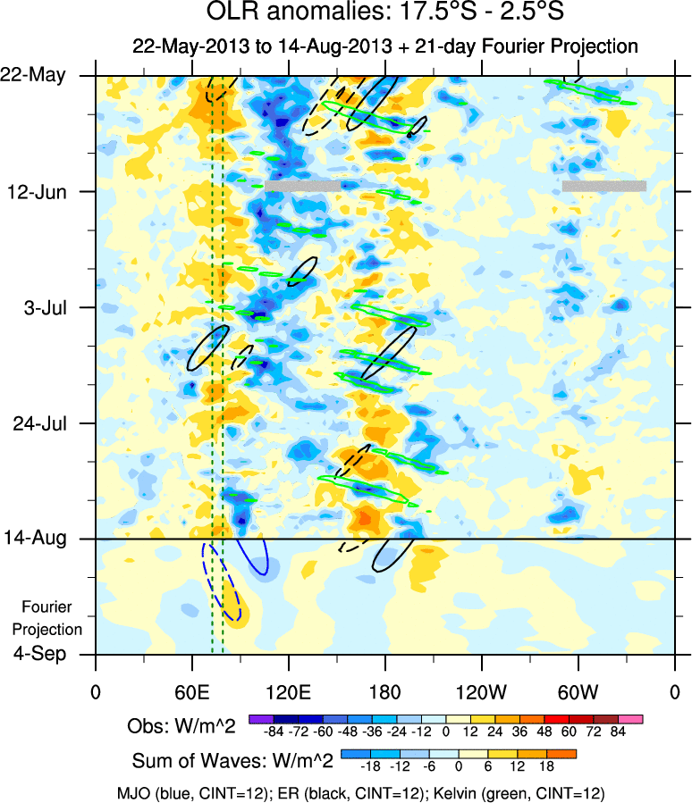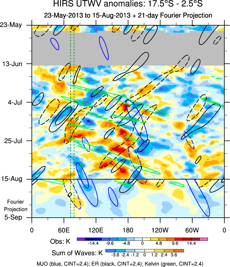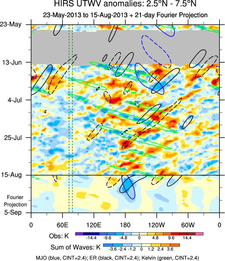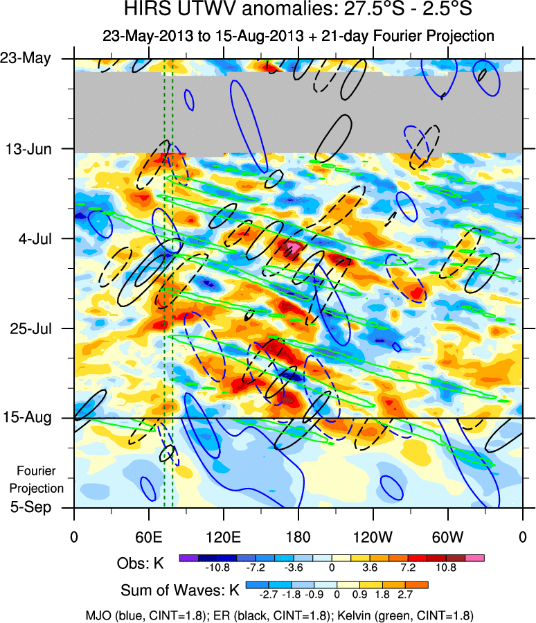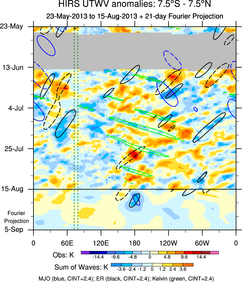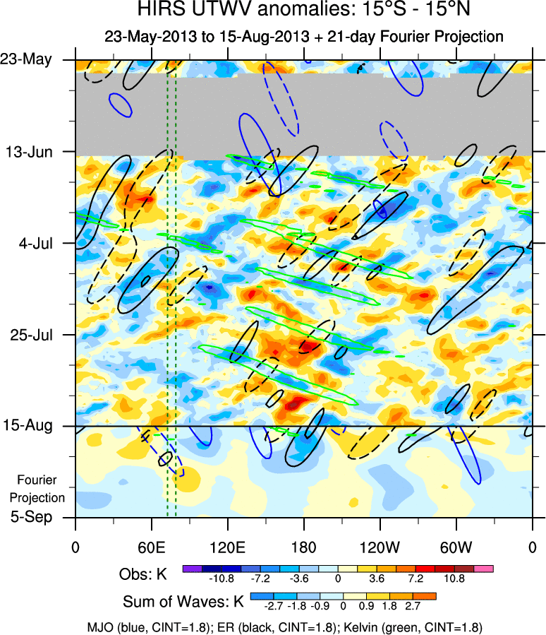 To identify tropical waves in near real-time, the OLR and UTWV data are filtered following Wheeler & Weickmann (2001 MWR). The daily anomalies are calculated using the first 3 harmonics of the seasonal cycle for 1979–2009. Missing values are then filled using linear interpolation in space and time. The most recent 365 days of anomalies are padded with 659 days of zeroes, and the result is filtered for each wave type.
