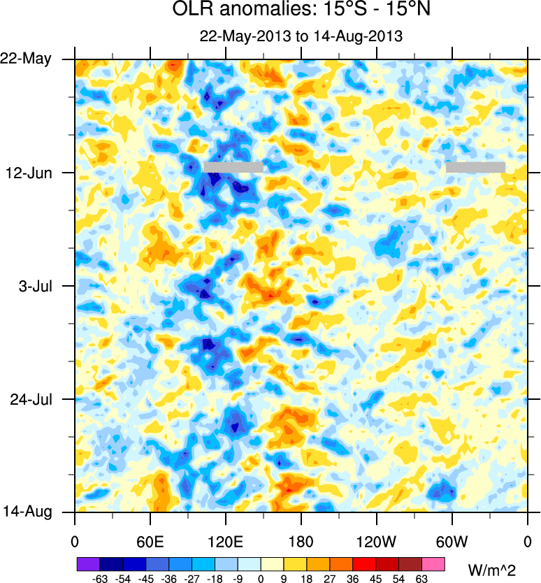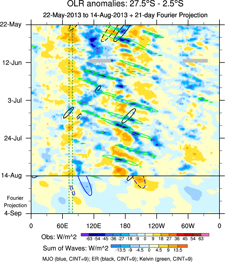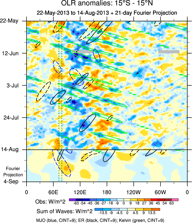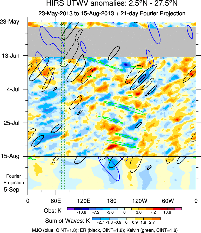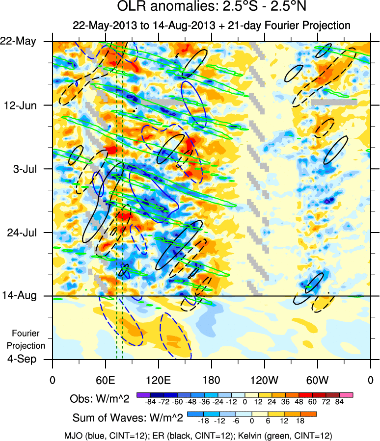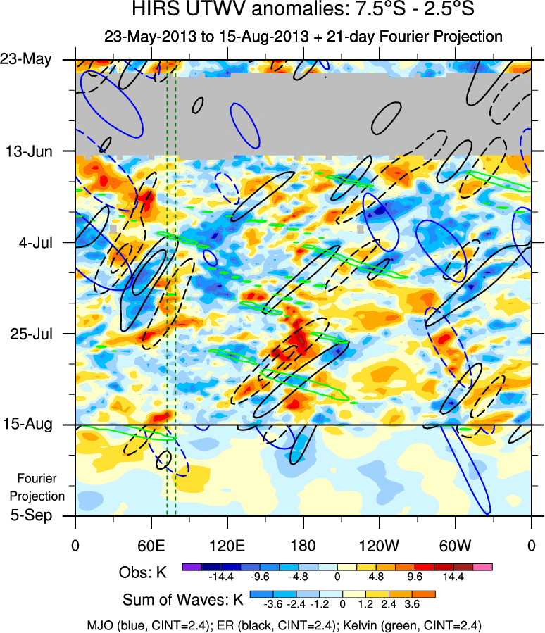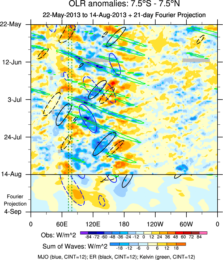 To identify tropical waves in near real-time, the OLR and UTWV data are filtered following Wheeler & Weickmann (2001 MWR). The daily anomalies are calculated using the first 3 harmonics of the seasonal cycle for 1979–2009. Missing values are then filled using linear interpolation in space and time. The most recent 365 days of anomalies are padded with 659 days of zeroes, and the result is filtered for each wave type.