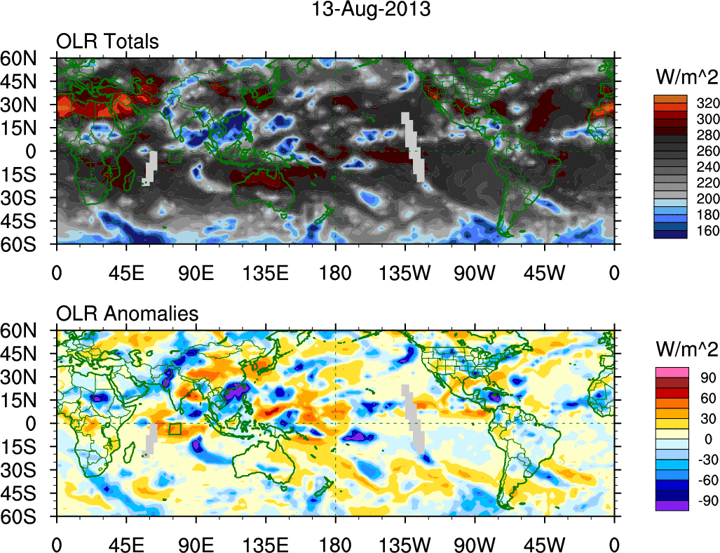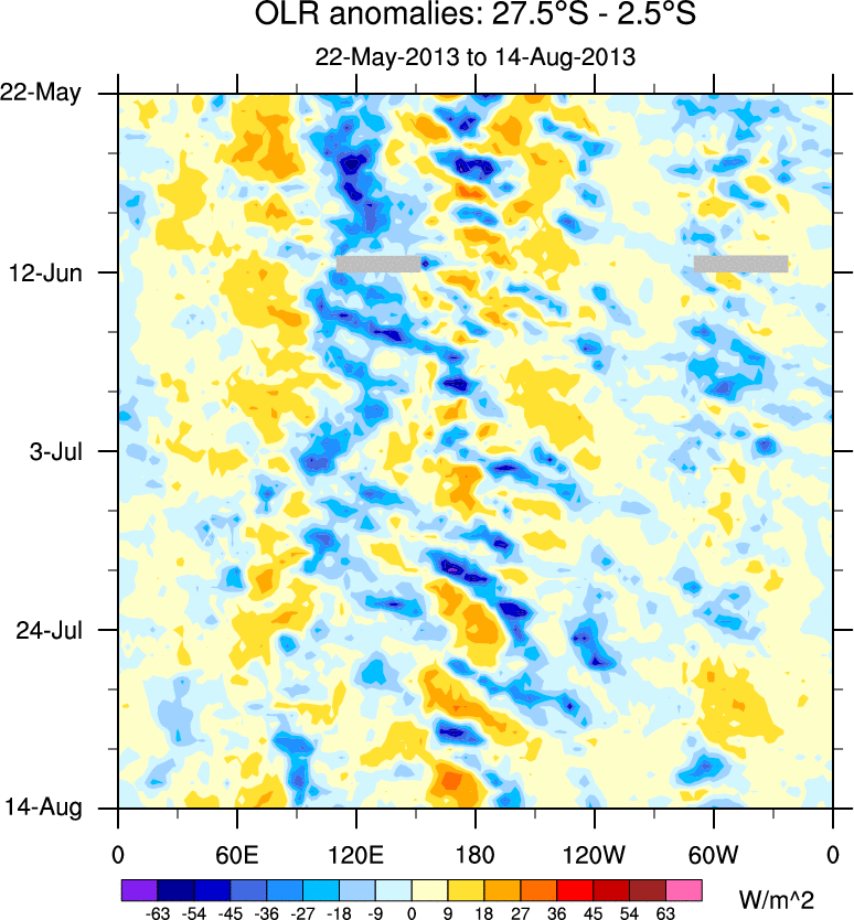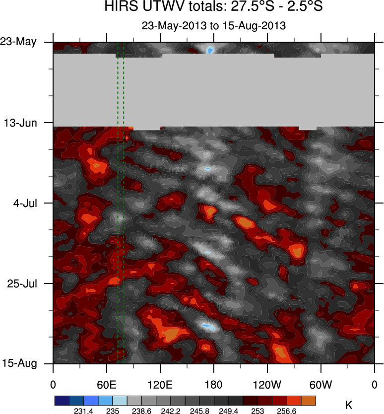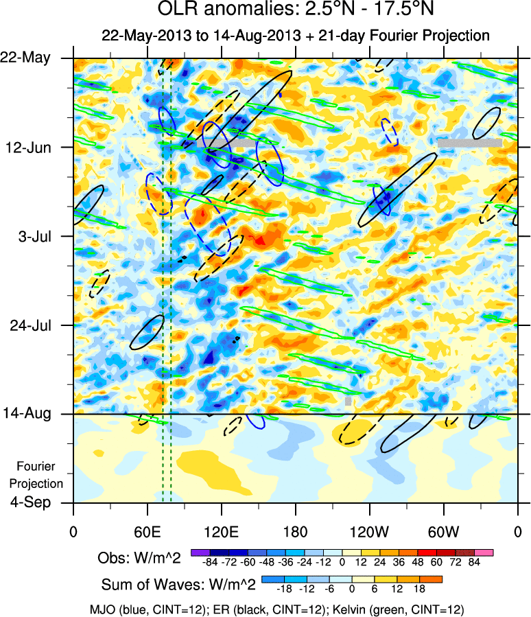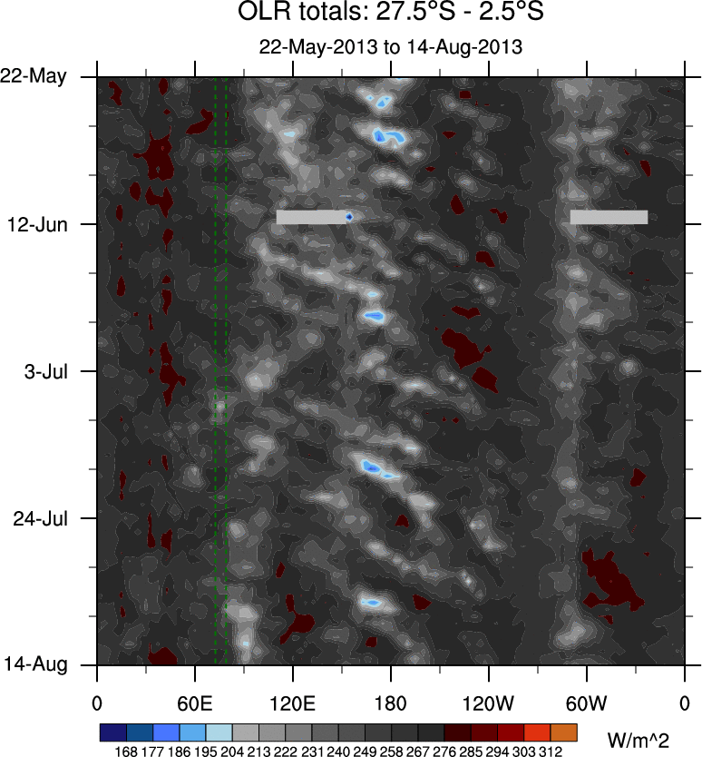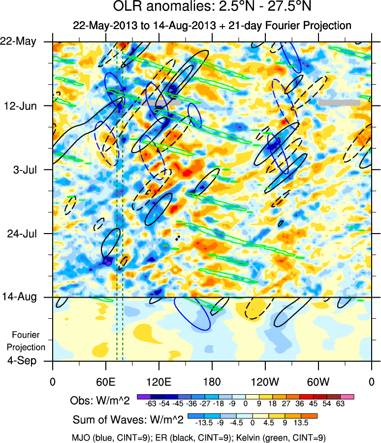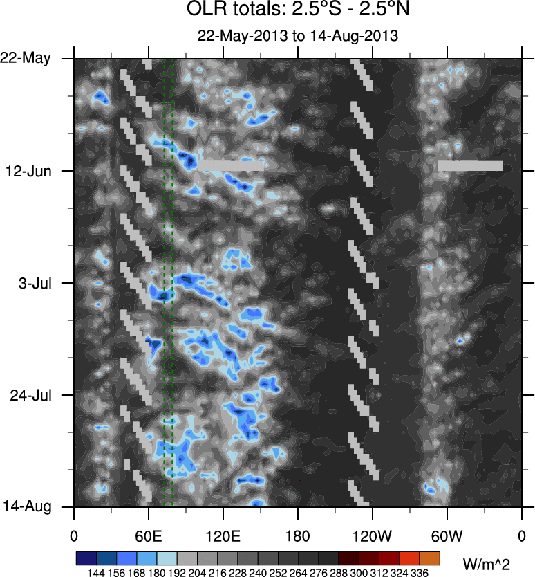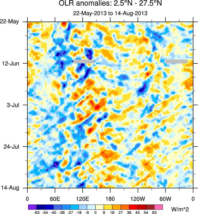 To identify tropical waves in near real-time, the OLR and UTWV data are filtered following Wheeler & Weickmann (2001 MWR). The daily anomalies are calculated using the first 3 harmonics of the seasonal cycle for 1979–2009. Missing values are then filled using linear interpolation in space and time. The most recent 365 days of anomalies are padded with 659 days of zeroes, and the result is filtered for each wave type.