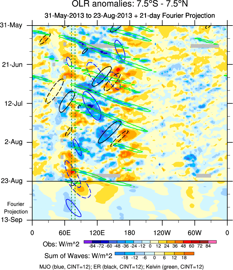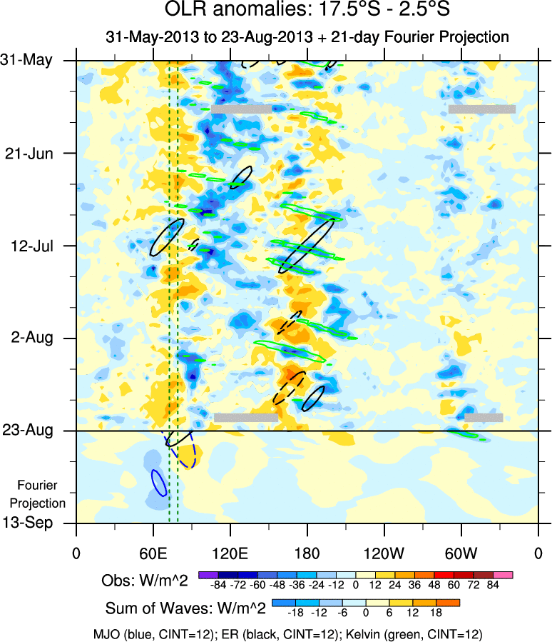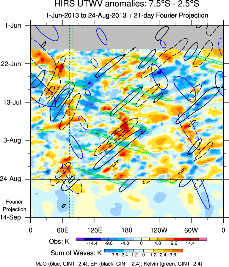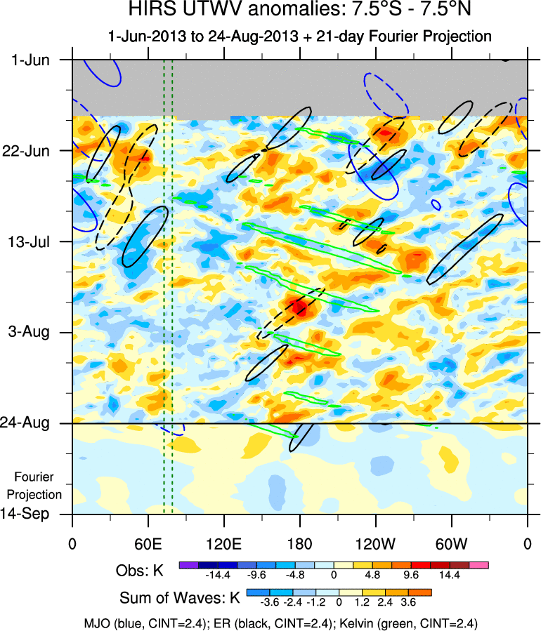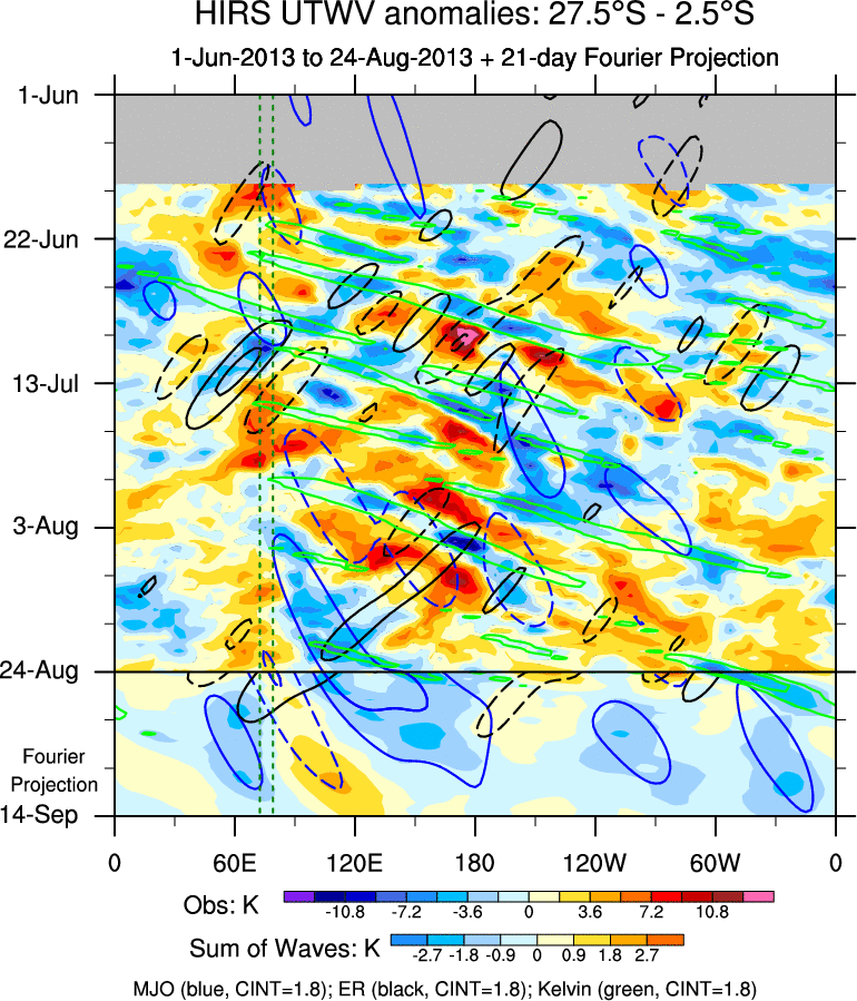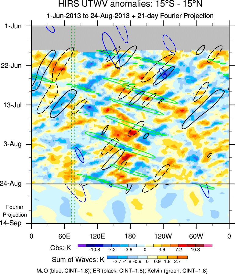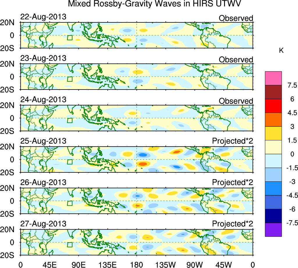 To identify tropical waves in near real-time, the OLR and UTWV data are filtered following Wheeler & Weickmann (2001 MWR). The daily anomalies are calculated using the first 3 harmonics of the seasonal cycle for 1979–2009. Missing values are then filled using linear interpolation in space and time. The most recent 365 days of anomalies are padded with 659 days of zeroes, and the result is filtered for each wave type.