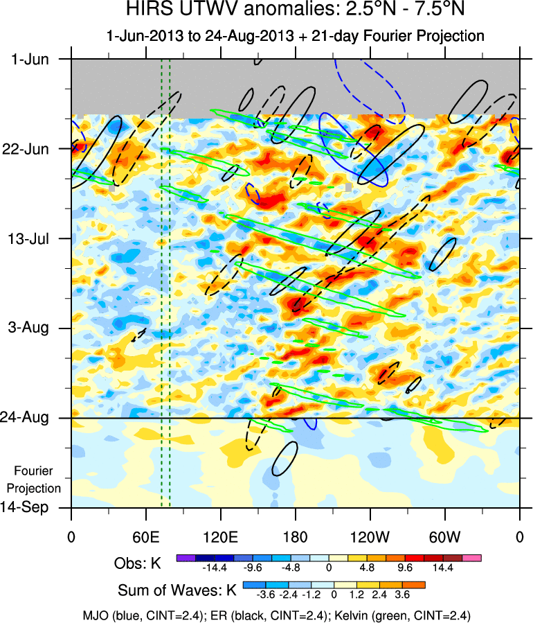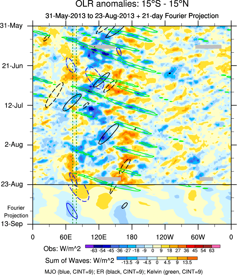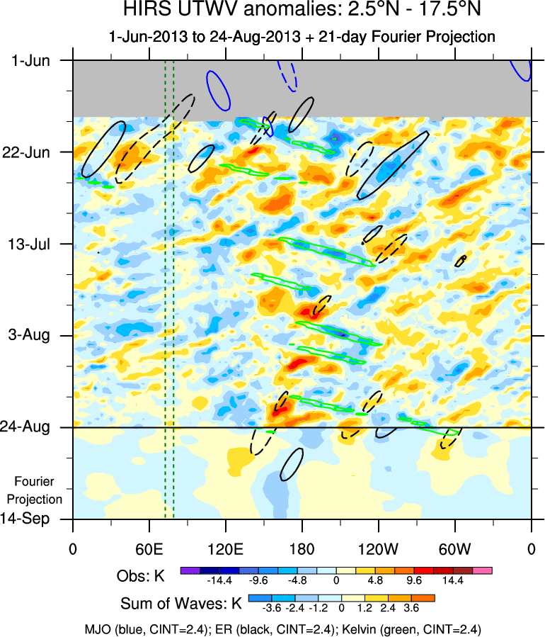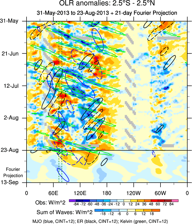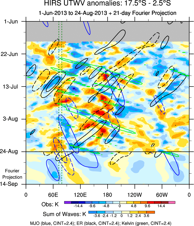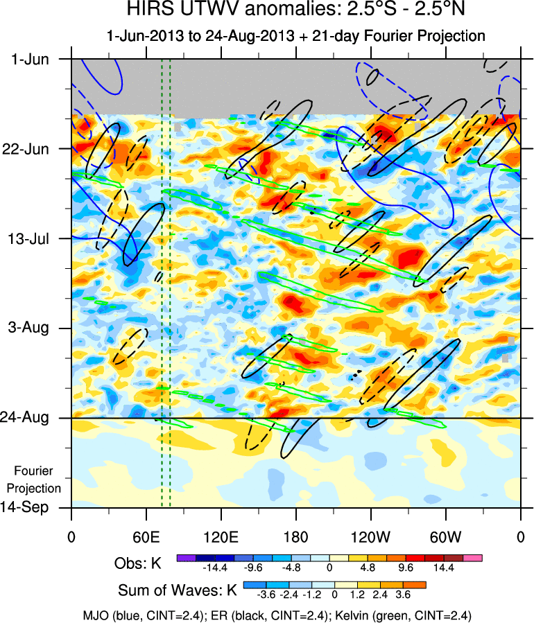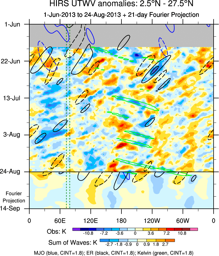 To identify tropical waves in near real-time, the OLR and UTWV data are filtered following Wheeler & Weickmann (2001 MWR). The daily anomalies are calculated using the first 3 harmonics of the seasonal cycle for 1979–2009. Missing values are then filled using linear interpolation in space and time. The most recent 365 days of anomalies are padded with 659 days of zeroes, and the result is filtered for each wave type.