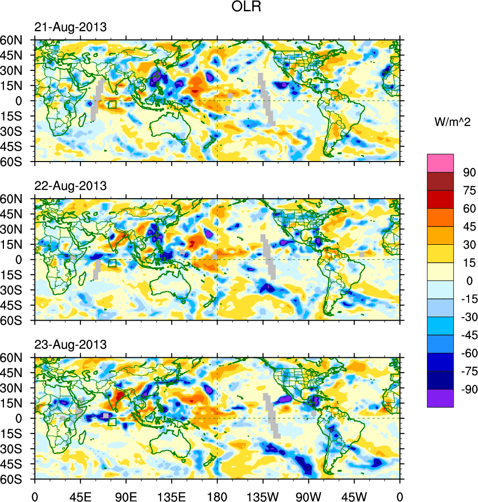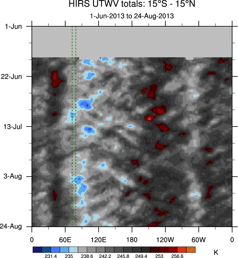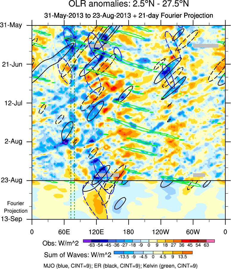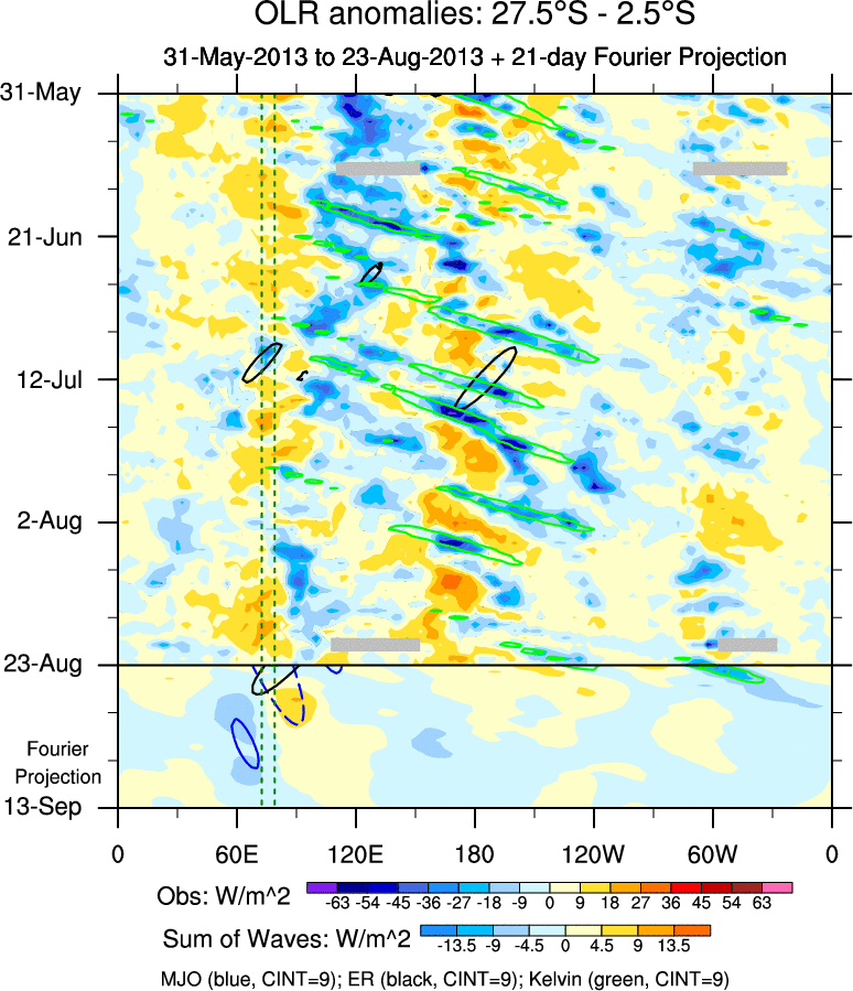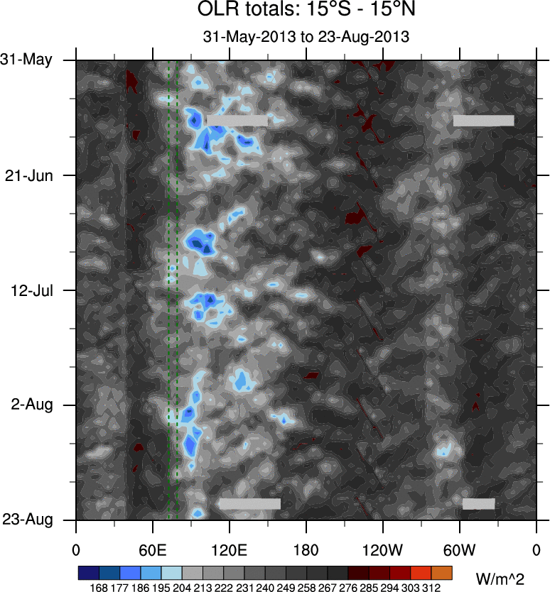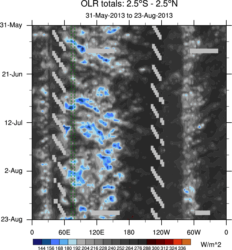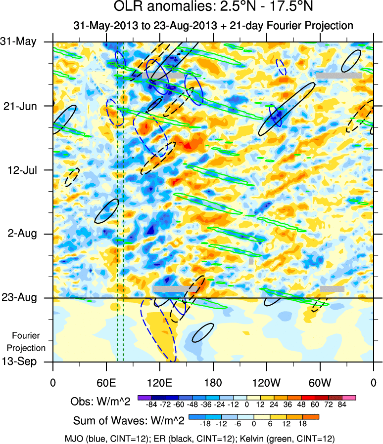 To identify tropical waves in near real-time, the OLR and UTWV data are filtered following Wheeler & Weickmann (2001 MWR). The daily anomalies are calculated using the first 3 harmonics of the seasonal cycle for 1979–2009. Missing values are then filled using linear interpolation in space and time. The most recent 365 days of anomalies are padded with 659 days of zeroes, and the result is filtered for each wave type.