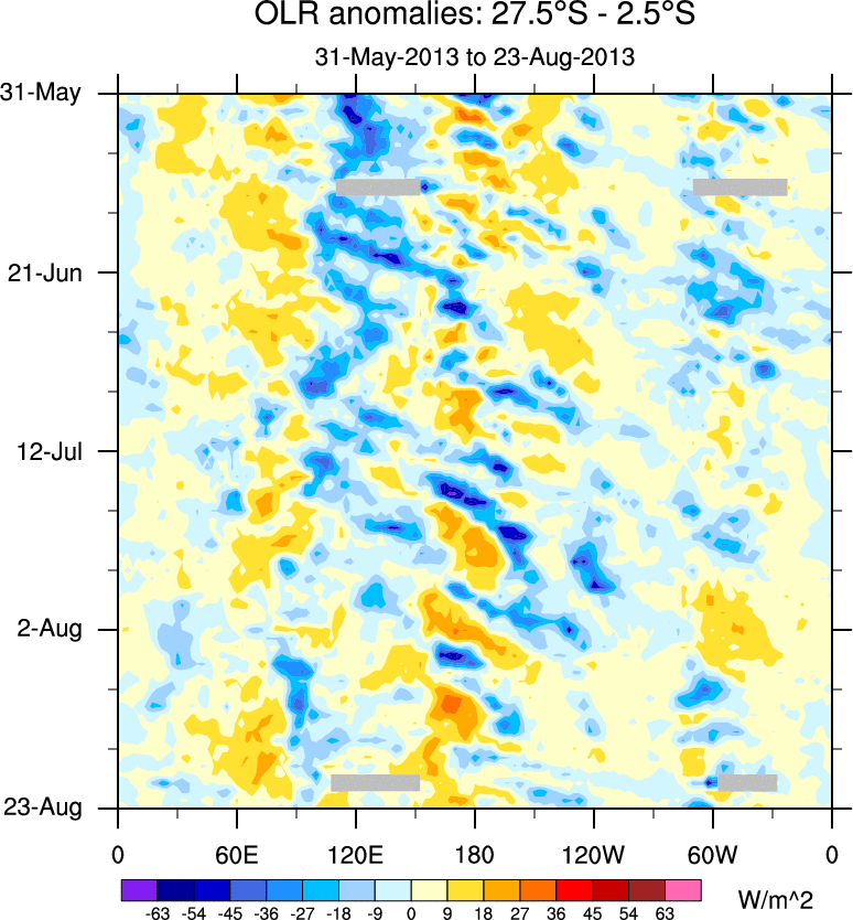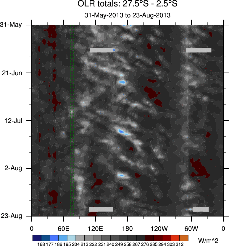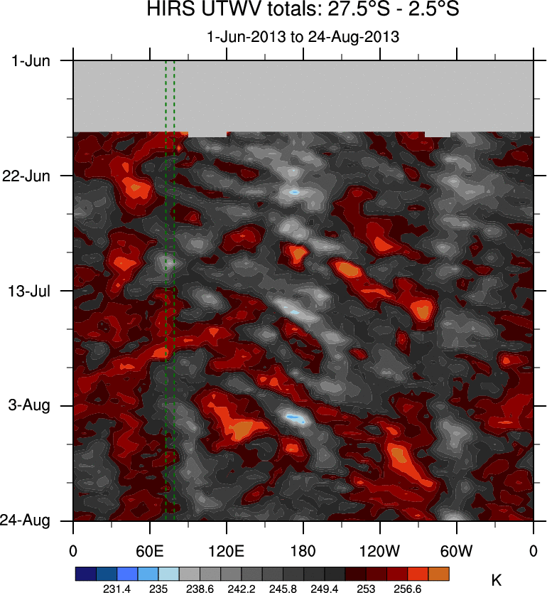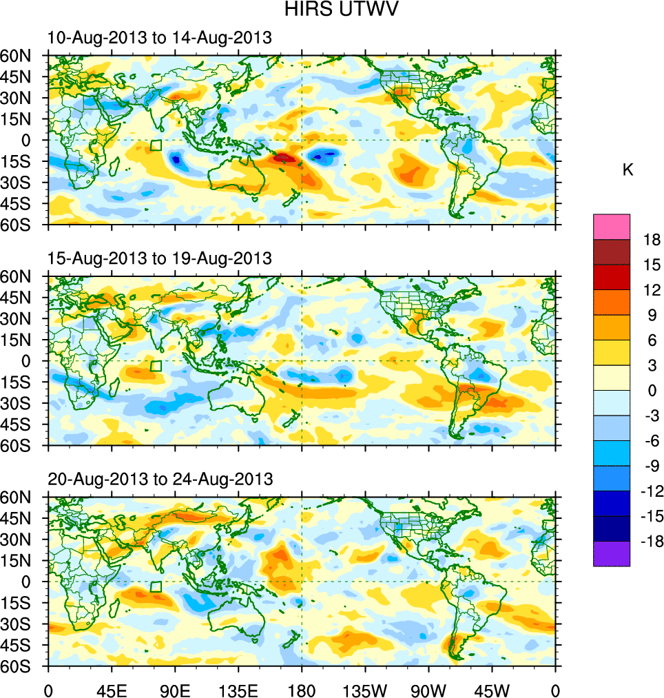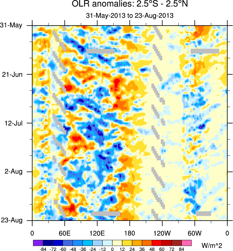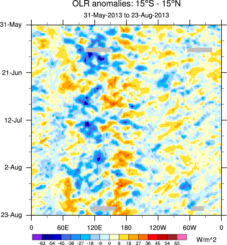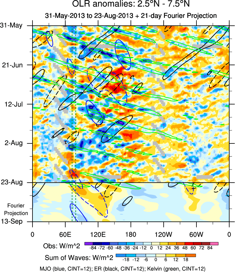 To identify tropical waves in near real-time, the OLR and UTWV data are filtered following Wheeler & Weickmann (2001 MWR). The daily anomalies are calculated using the first 3 harmonics of the seasonal cycle for 1979–2009. Missing values are then filled using linear interpolation in space and time. The most recent 365 days of anomalies are padded with 659 days of zeroes, and the result is filtered for each wave type.