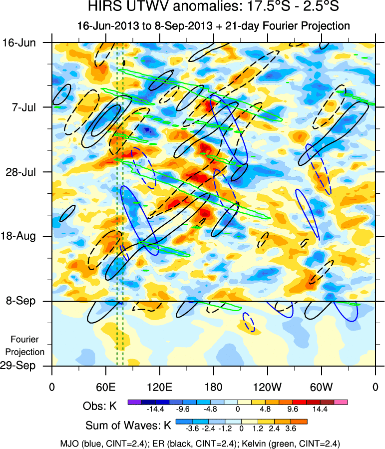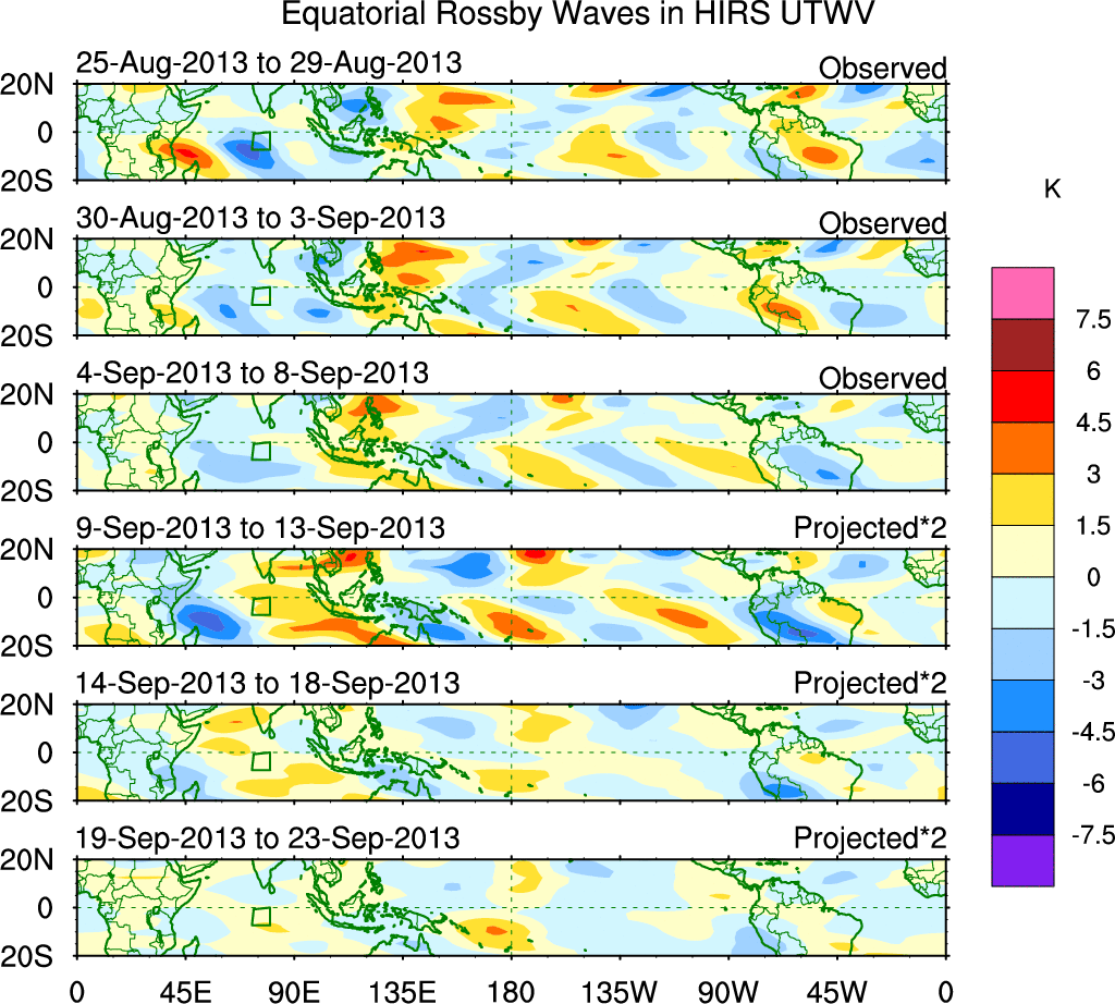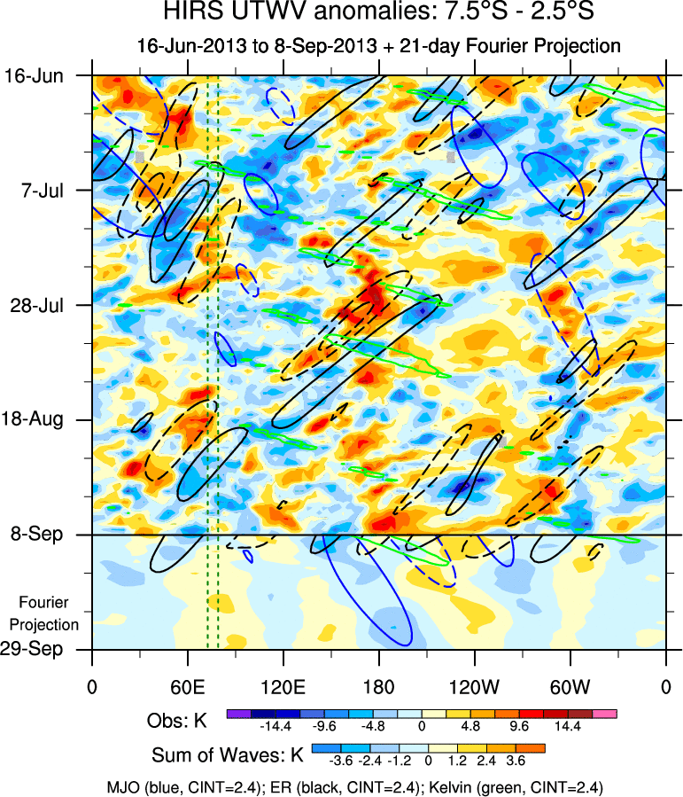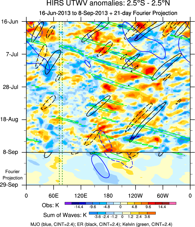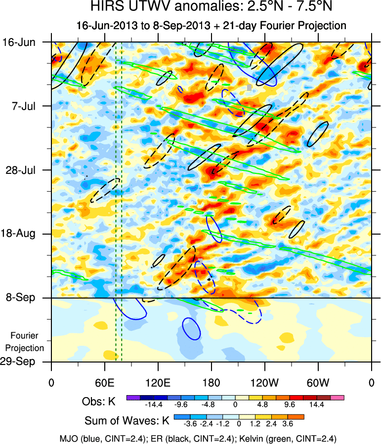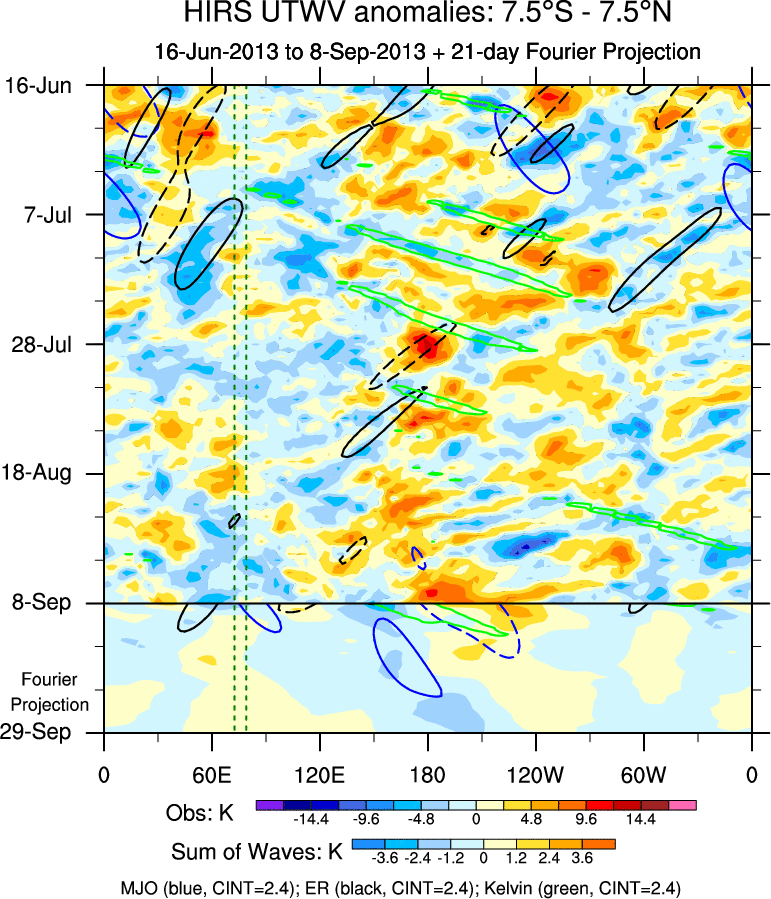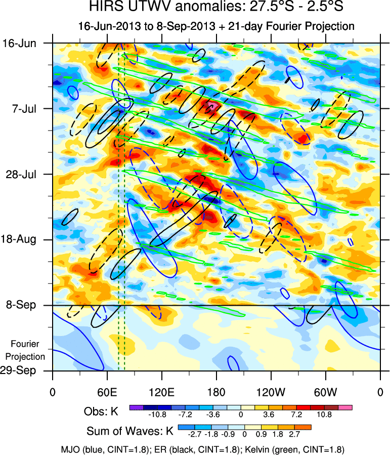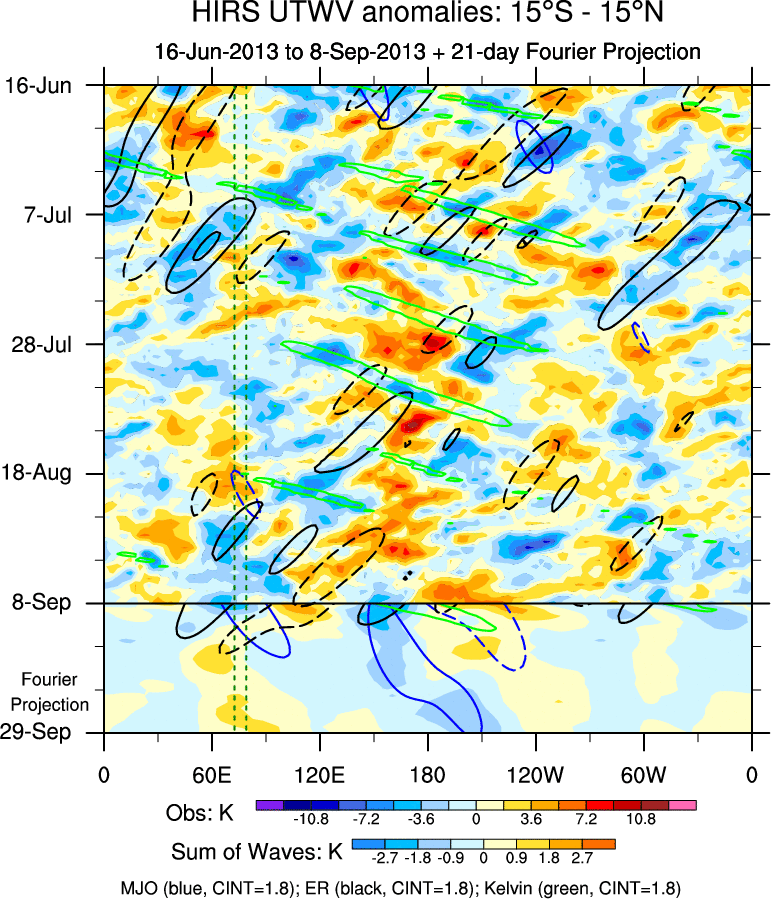 To identify tropical waves in near real-time, the OLR and UTWV data are filtered following Wheeler & Weickmann (2001 MWR). The daily anomalies are calculated using the first 3 harmonics of the seasonal cycle for 1979–2009. Missing values are then filled using linear interpolation in space and time. The most recent 365 days of anomalies are padded with 659 days of zeroes, and the result is filtered for each wave type.