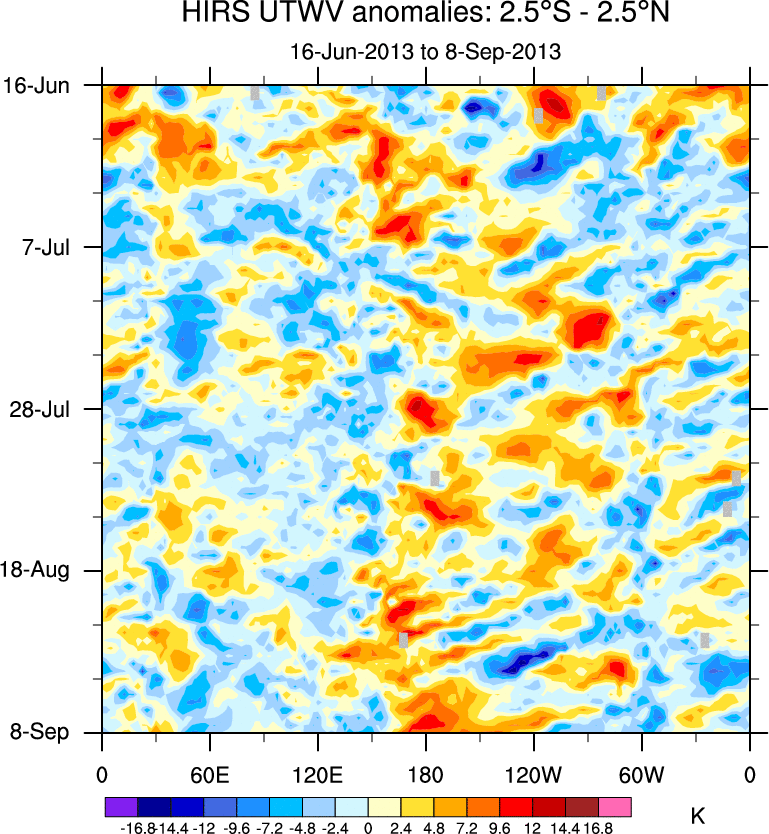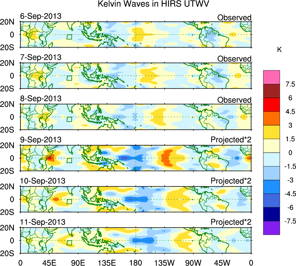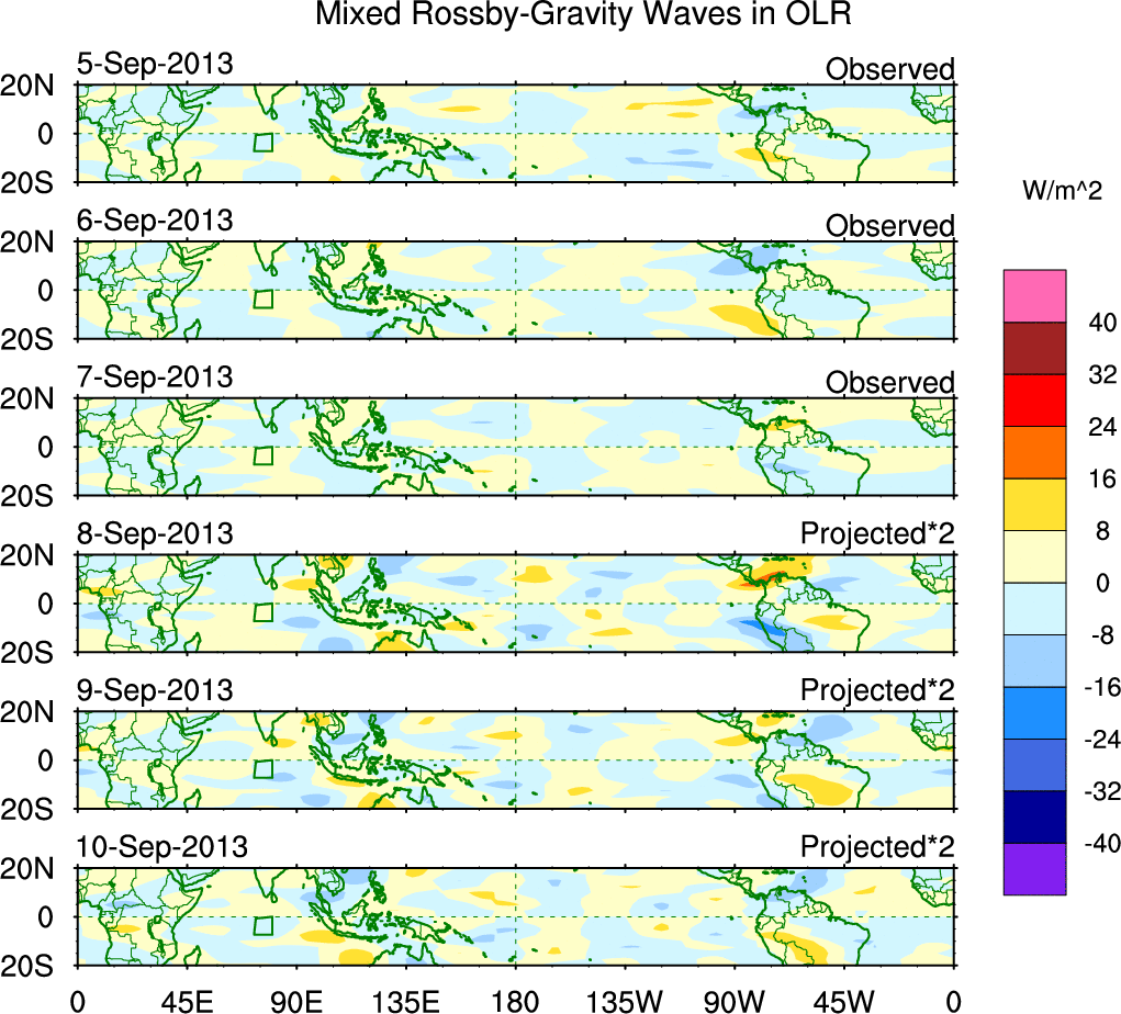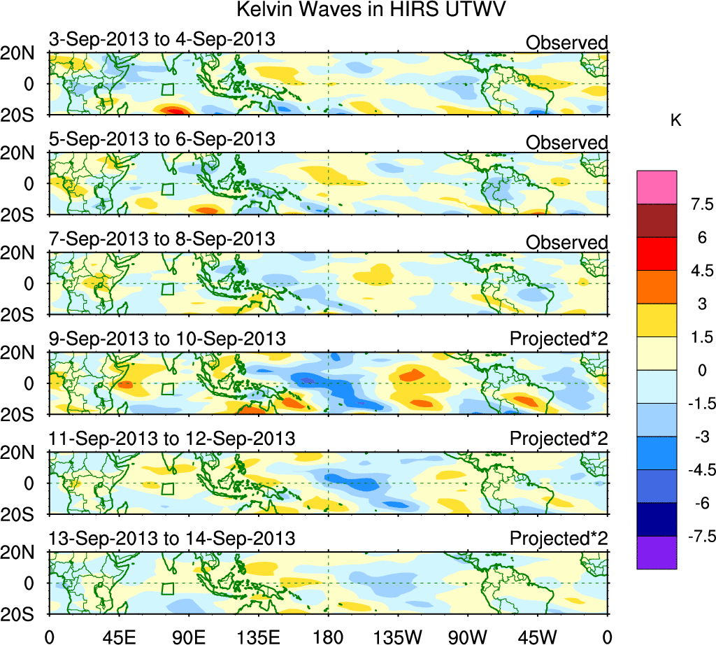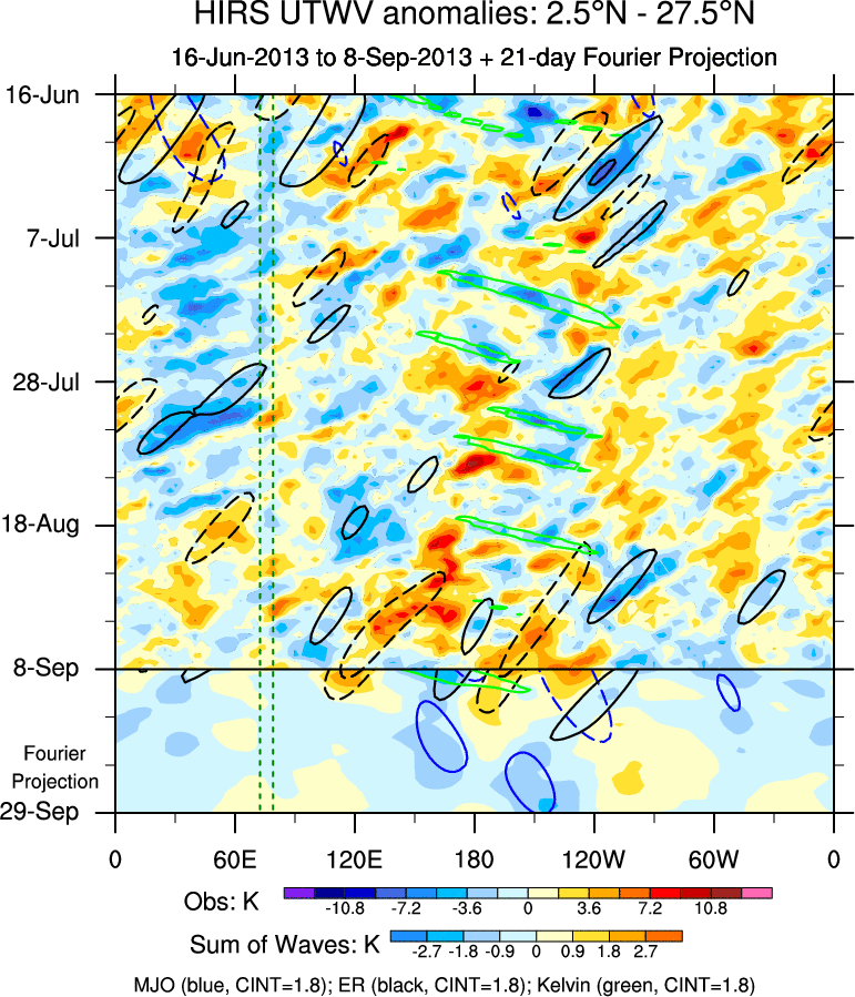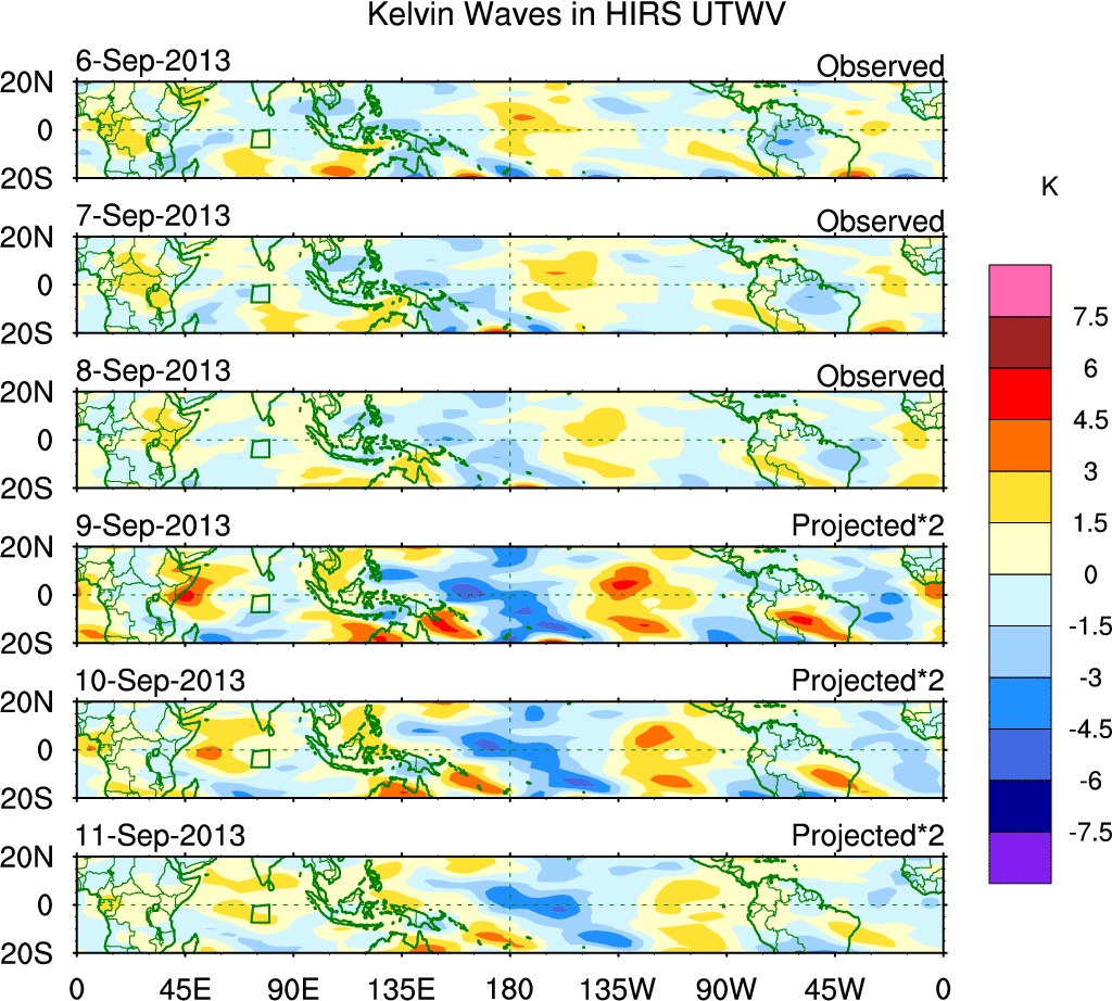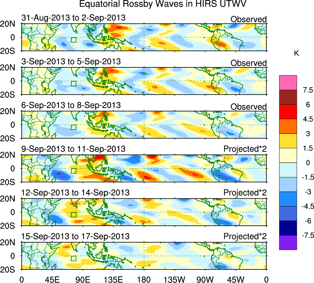 To identify tropical waves in near real-time, the OLR and UTWV data are filtered following Wheeler & Weickmann (2001 MWR). The daily anomalies are calculated using the first 3 harmonics of the seasonal cycle for 1979–2009. Missing values are then filled using linear interpolation in space and time. The most recent 365 days of anomalies are padded with 659 days of zeroes, and the result is filtered for each wave type.