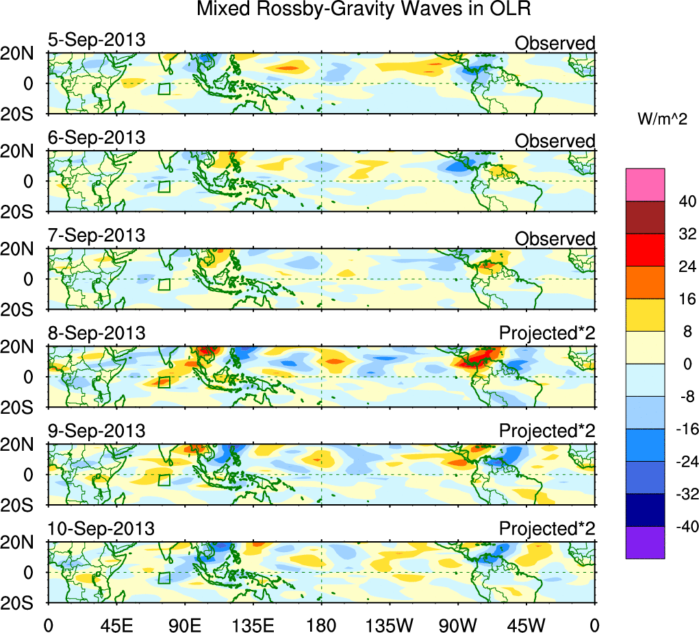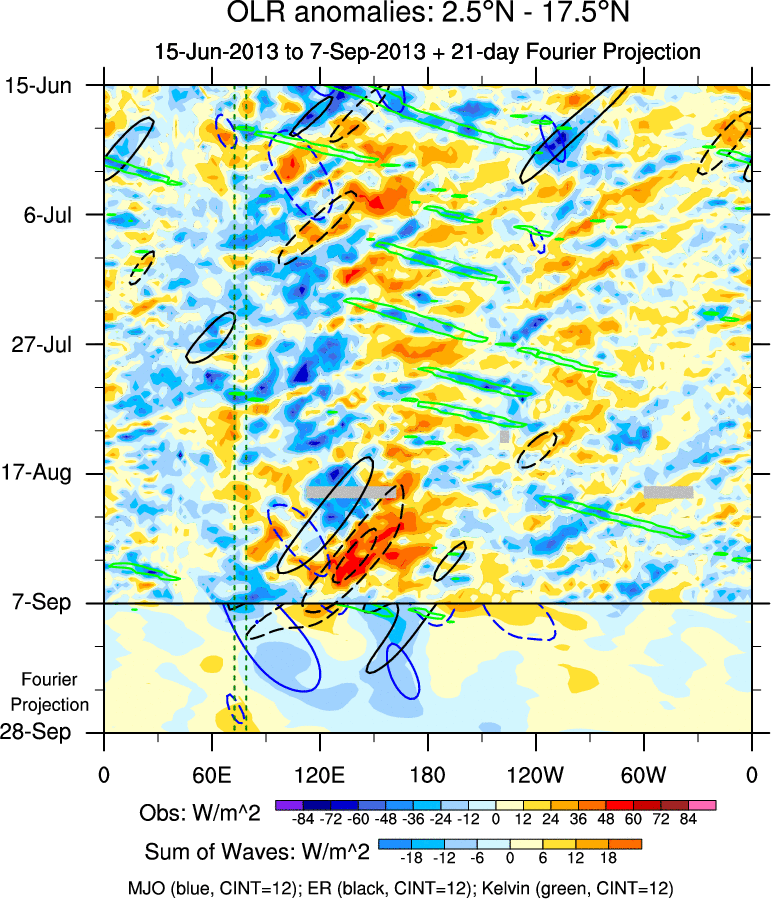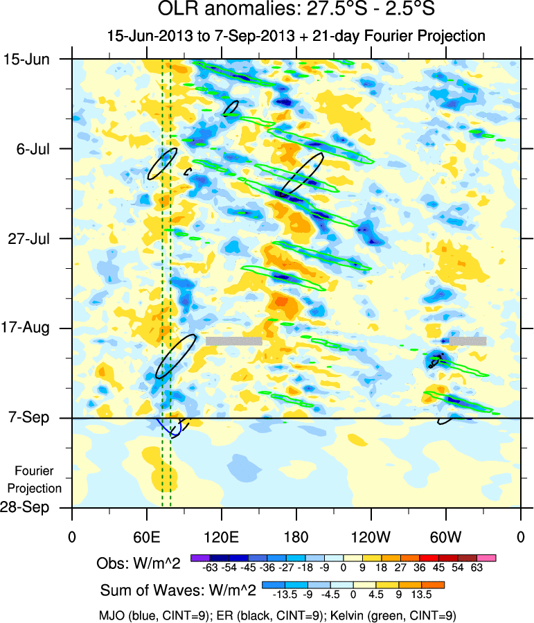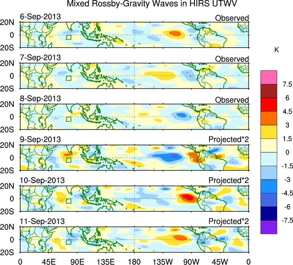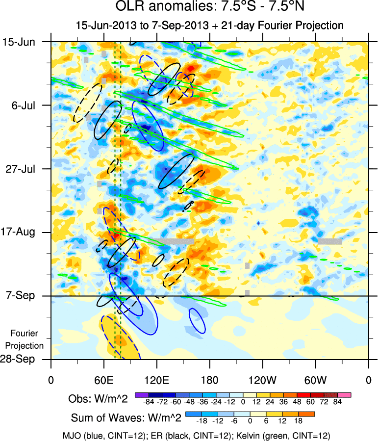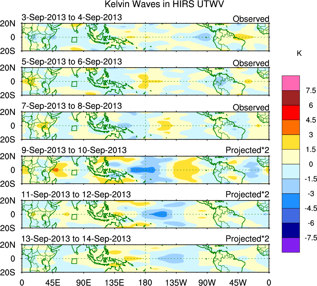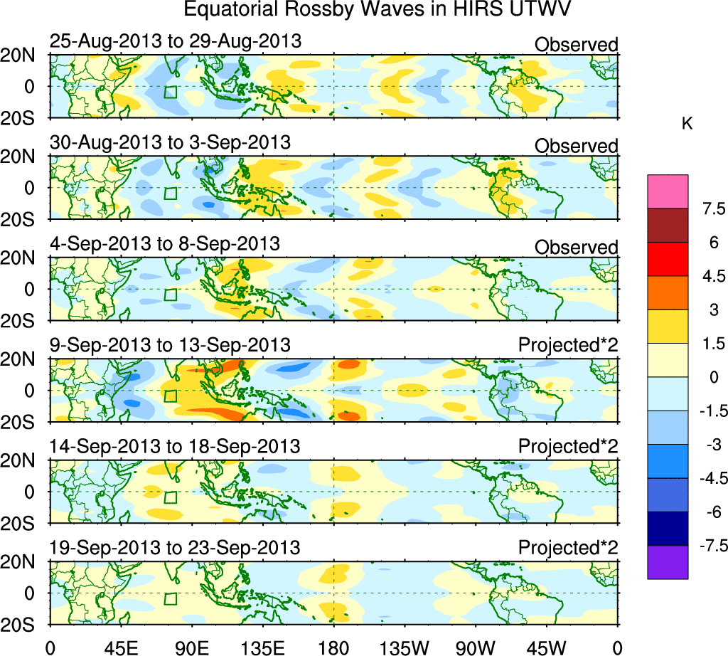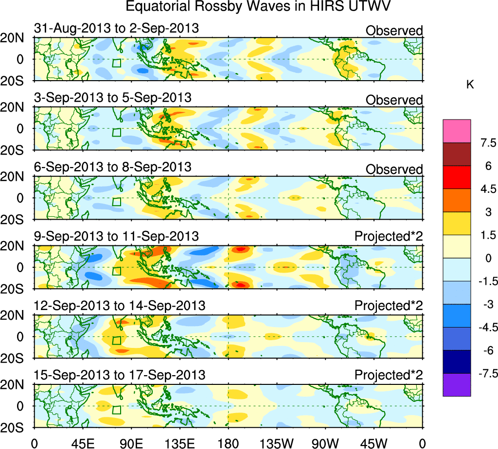 To identify tropical waves in near real-time, the OLR and UTWV data are filtered following Wheeler & Weickmann (2001 MWR). The daily anomalies are calculated using the first 3 harmonics of the seasonal cycle for 1979–2009. Missing values are then filled using linear interpolation in space and time. The most recent 365 days of anomalies are padded with 659 days of zeroes, and the result is filtered for each wave type.