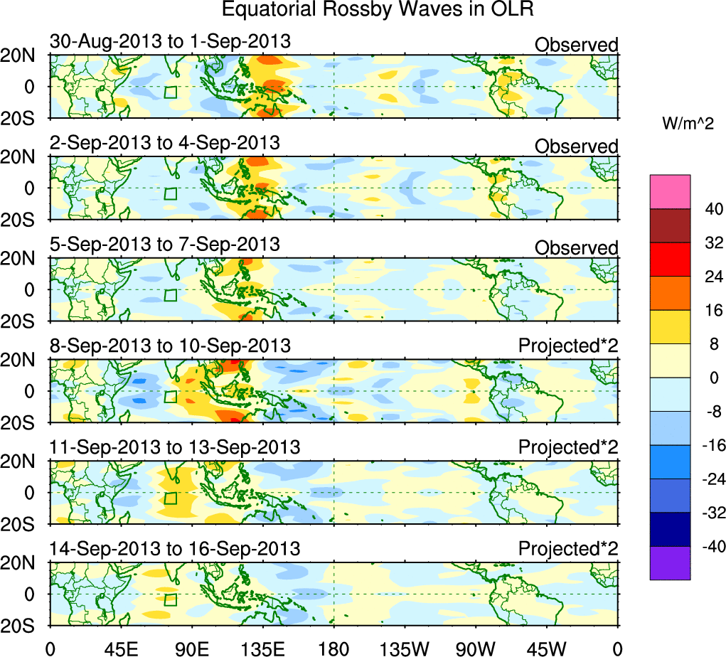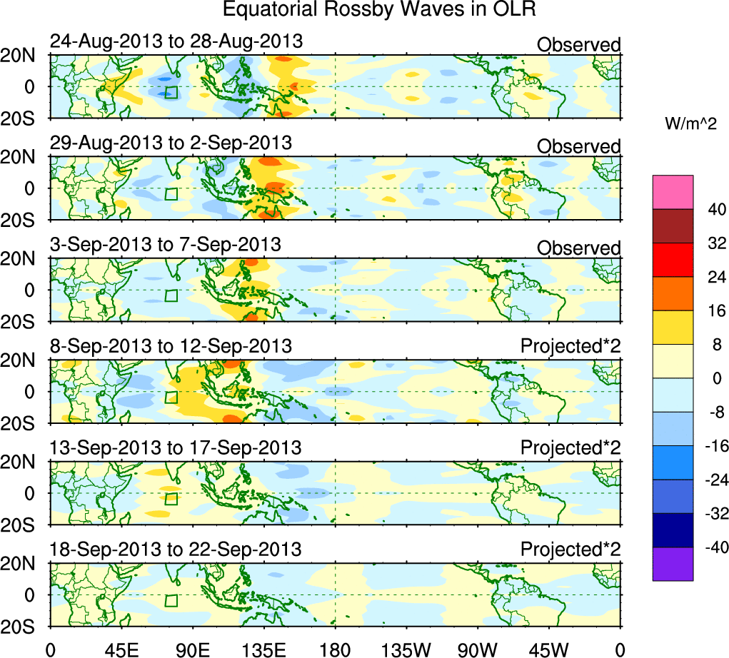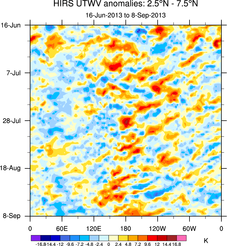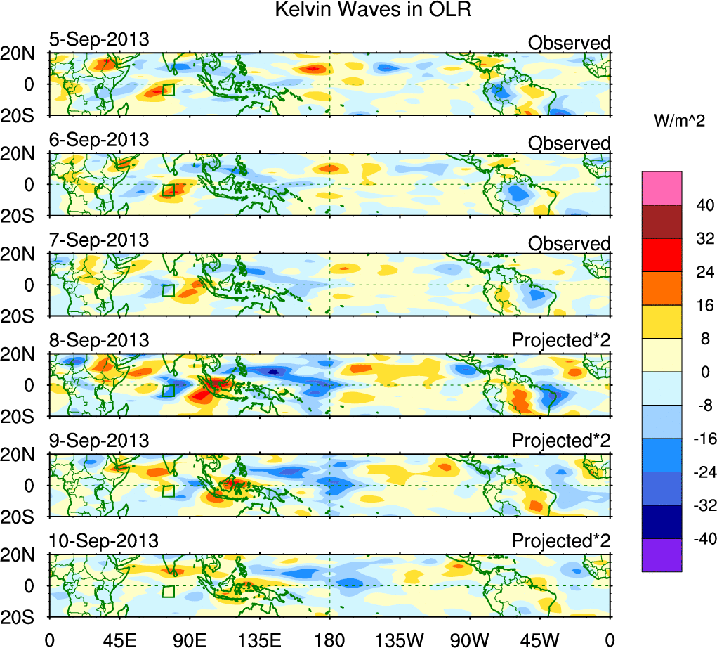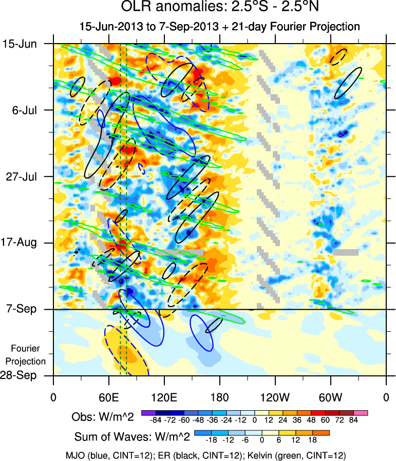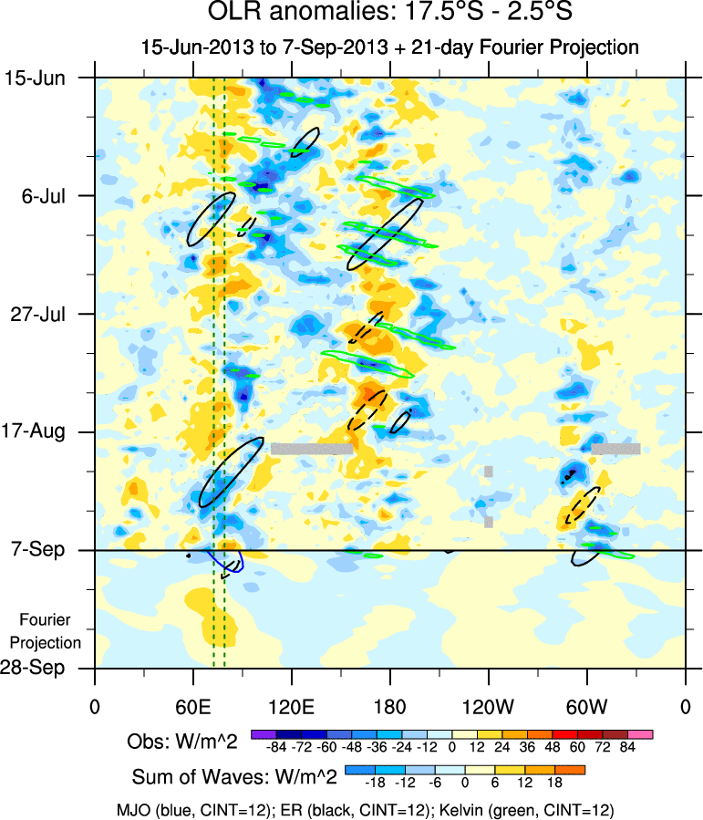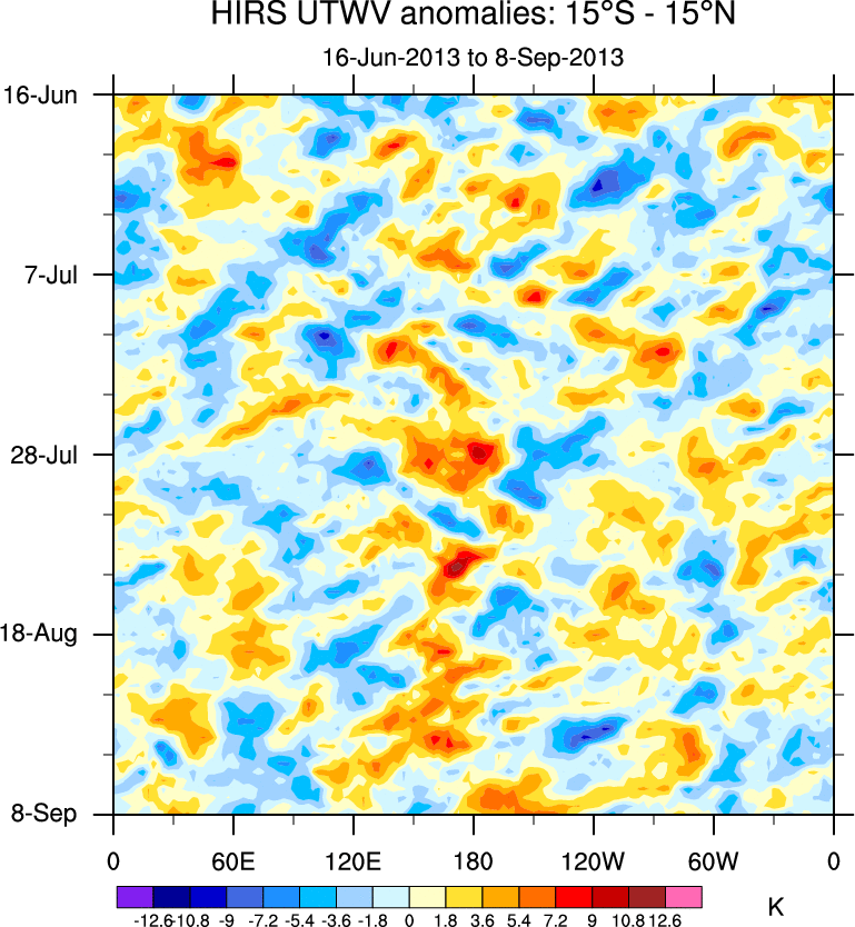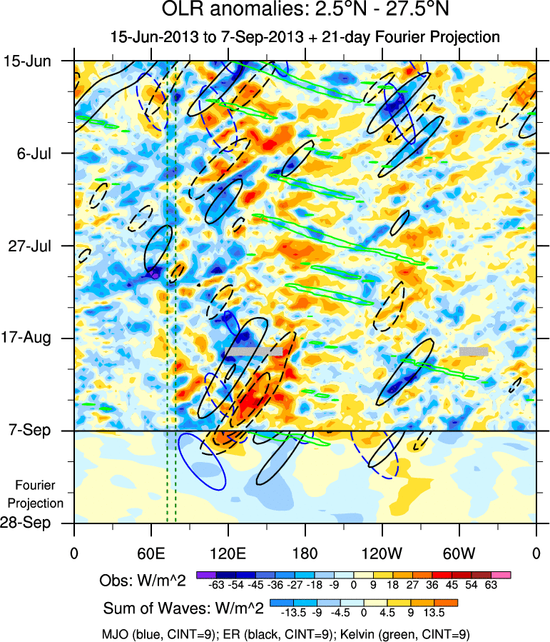 To identify tropical waves in near real-time, the OLR and UTWV data are filtered following Wheeler & Weickmann (2001 MWR). The daily anomalies are calculated using the first 3 harmonics of the seasonal cycle for 1979–2009. Missing values are then filled using linear interpolation in space and time. The most recent 365 days of anomalies are padded with 659 days of zeroes, and the result is filtered for each wave type.