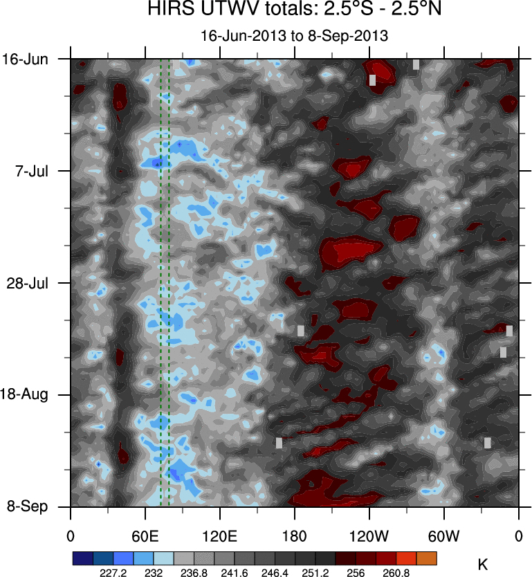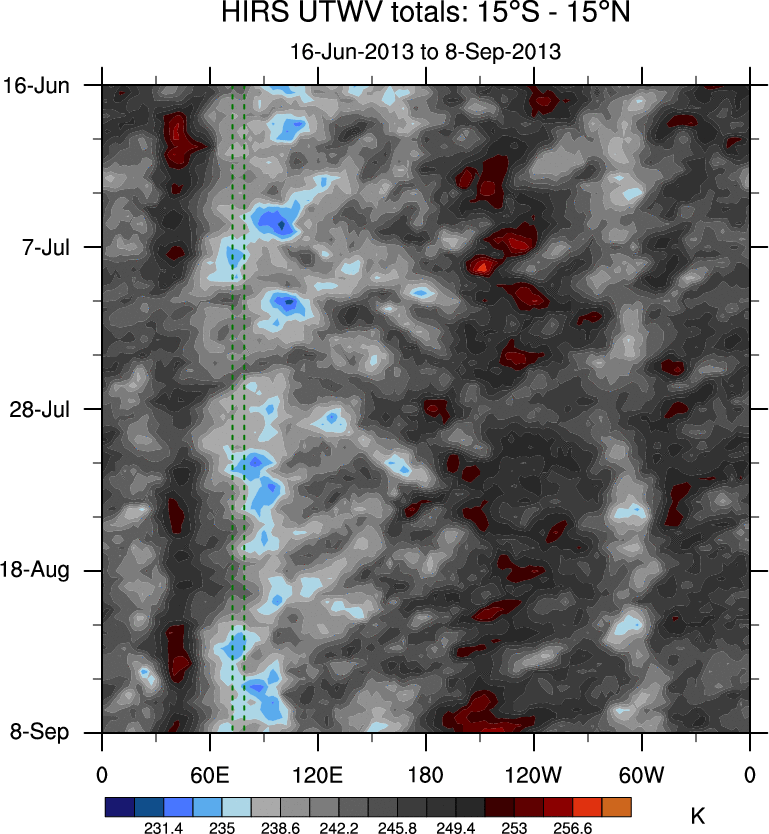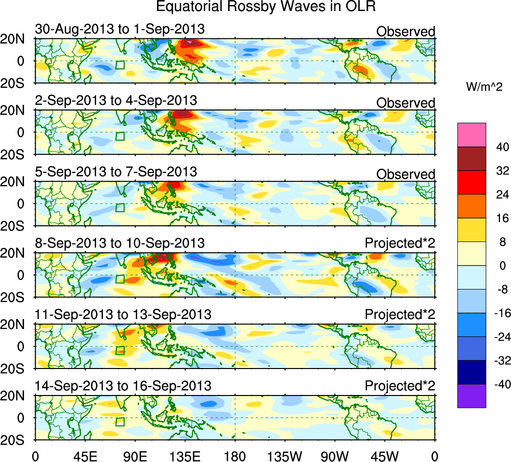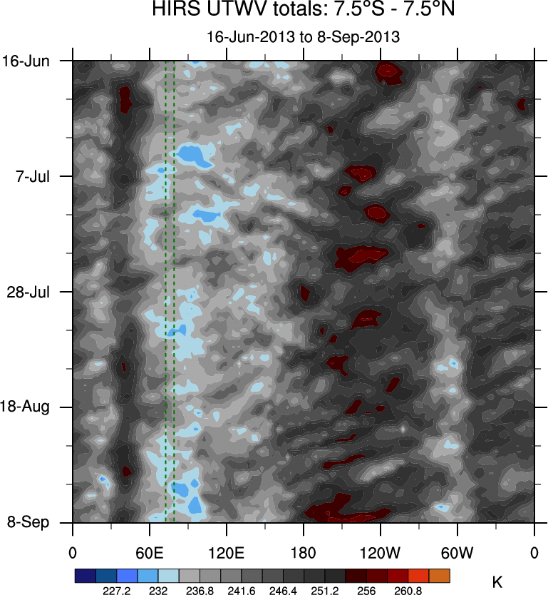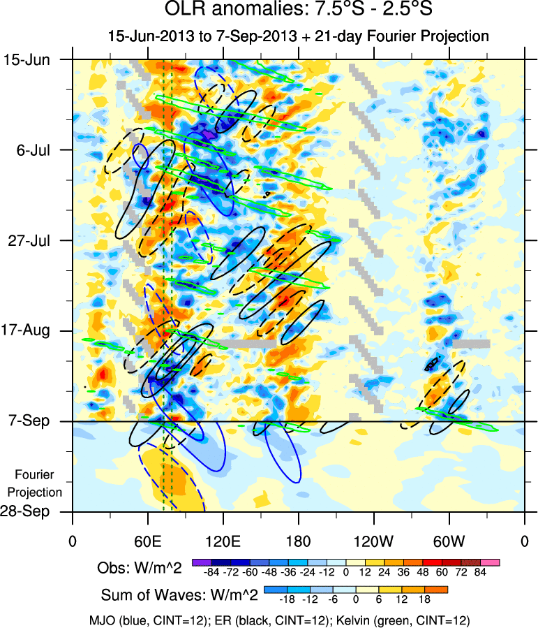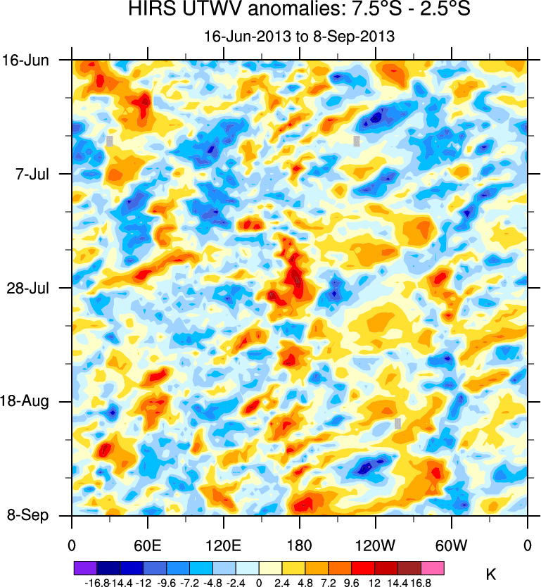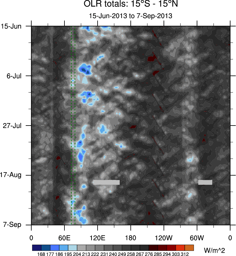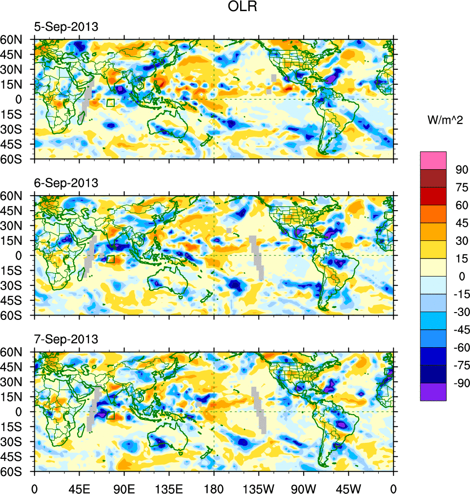 To identify tropical waves in near real-time, the OLR and UTWV data are filtered following Wheeler & Weickmann (2001 MWR). The daily anomalies are calculated using the first 3 harmonics of the seasonal cycle for 1979–2009. Missing values are then filled using linear interpolation in space and time. The most recent 365 days of anomalies are padded with 659 days of zeroes, and the result is filtered for each wave type.