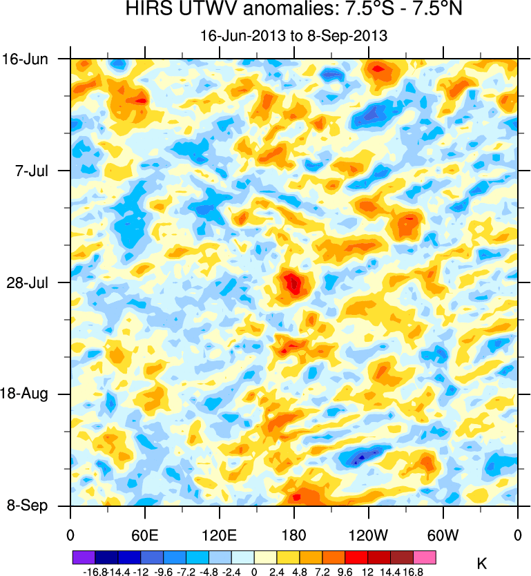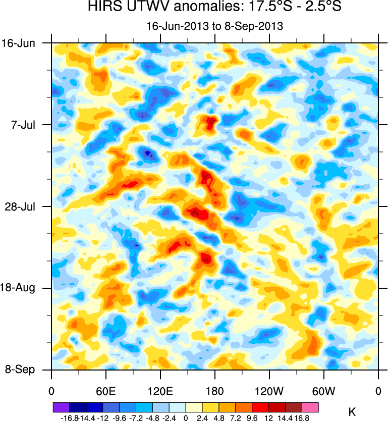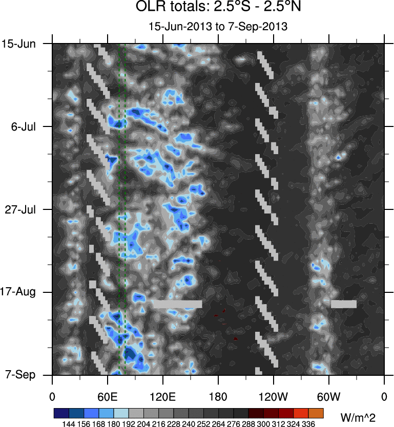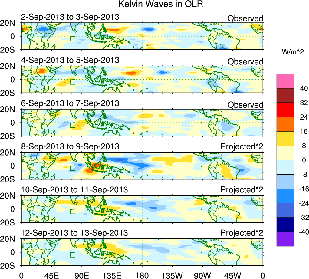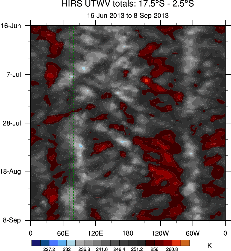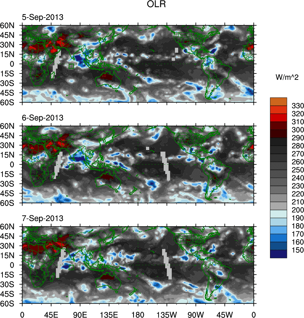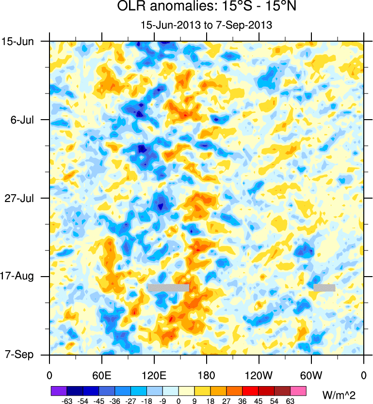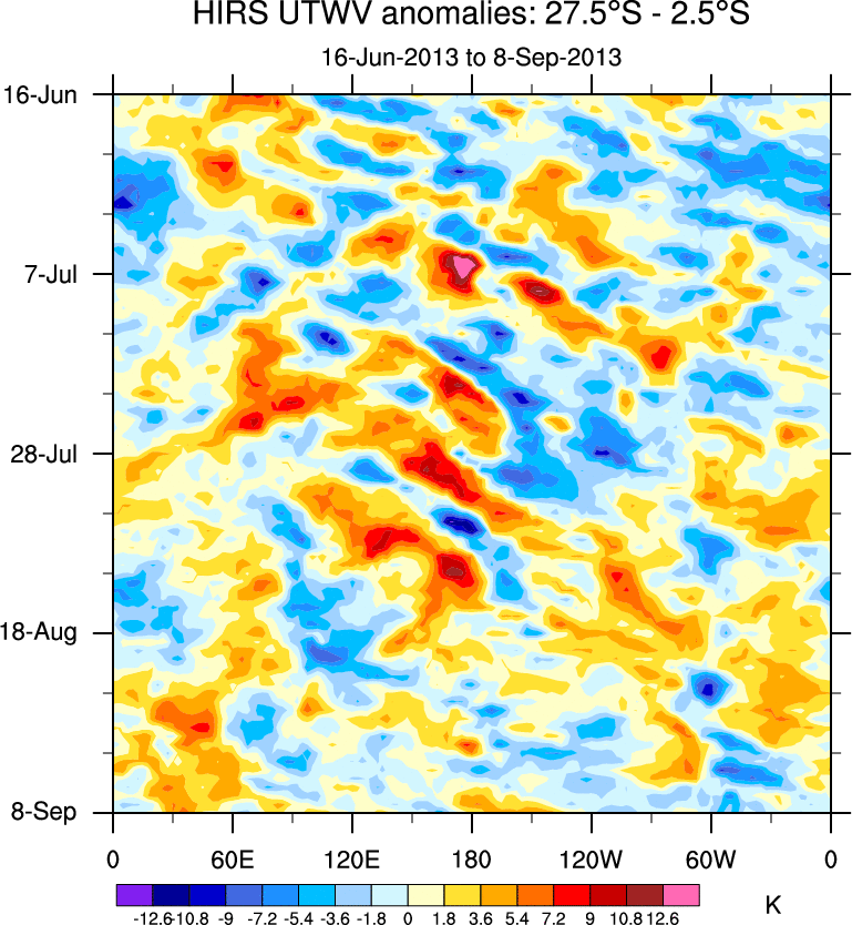 To identify tropical waves in near real-time, the OLR and UTWV data are filtered following Wheeler & Weickmann (2001 MWR). The daily anomalies are calculated using the first 3 harmonics of the seasonal cycle for 1979–2009. Missing values are then filled using linear interpolation in space and time. The most recent 365 days of anomalies are padded with 659 days of zeroes, and the result is filtered for each wave type.
