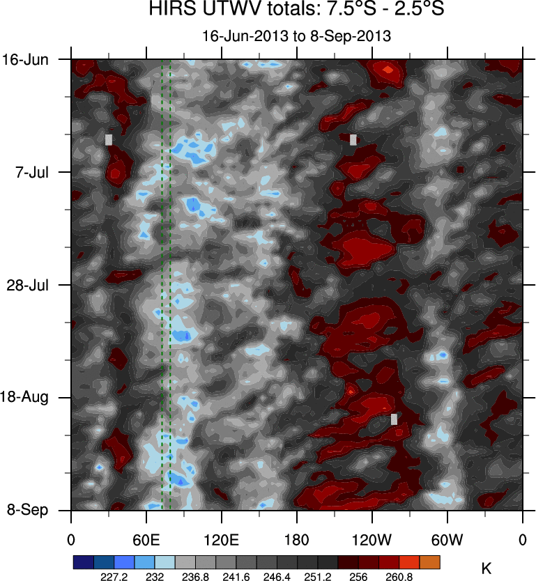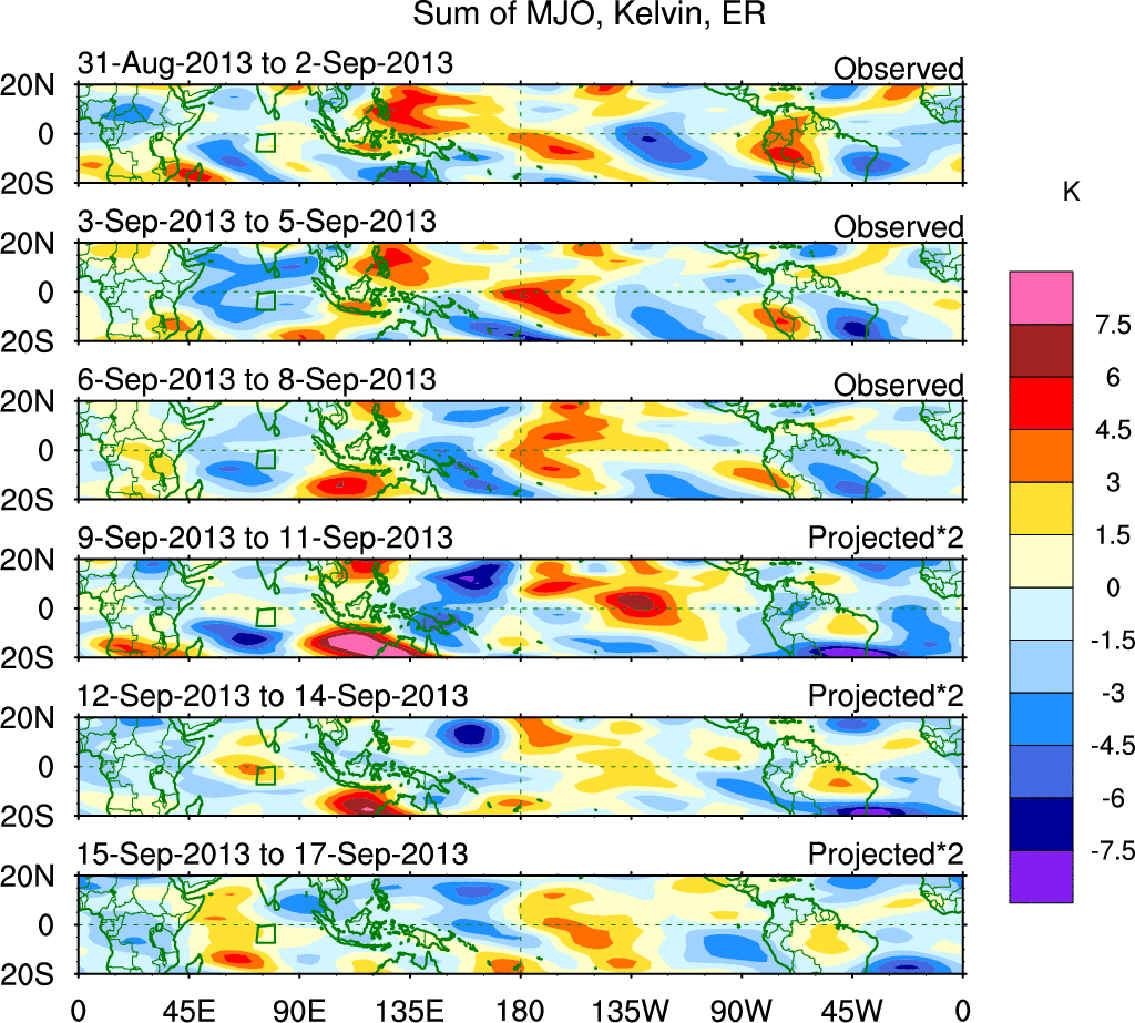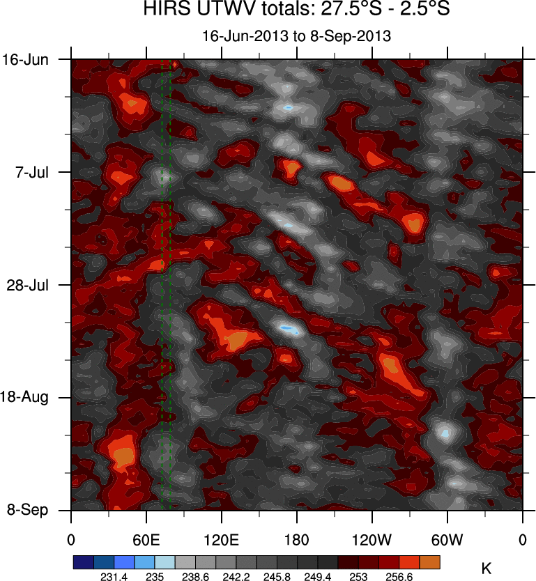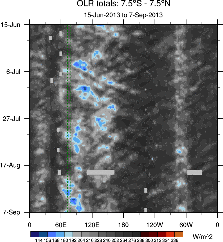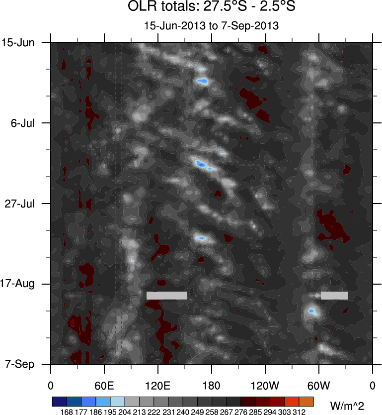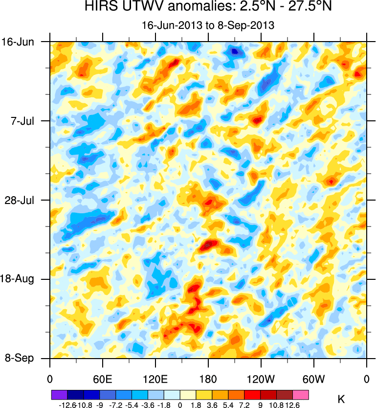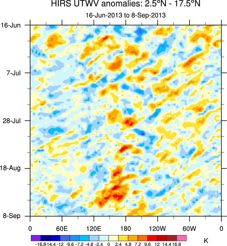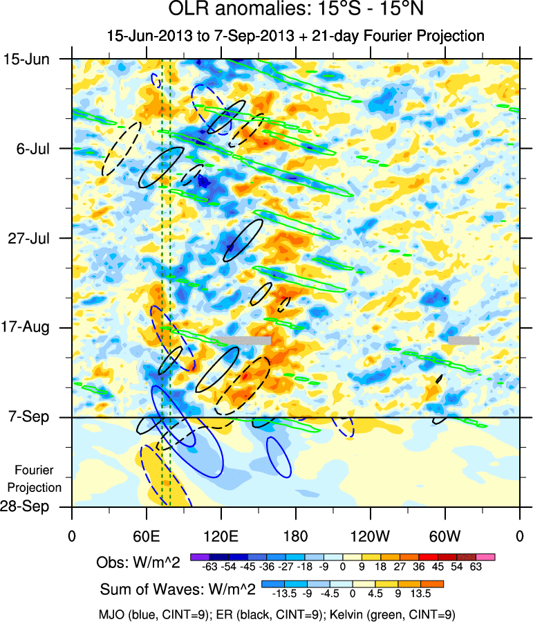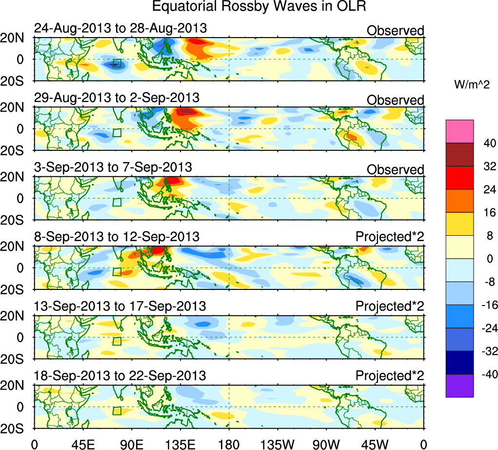 To identify tropical waves in near real-time, the OLR and UTWV data are filtered following Wheeler & Weickmann (2001 MWR). The daily anomalies are calculated using the first 3 harmonics of the seasonal cycle for 1979–2009. Missing values are then filled using linear interpolation in space and time. The most recent 365 days of anomalies are padded with 659 days of zeroes, and the result is filtered for each wave type.