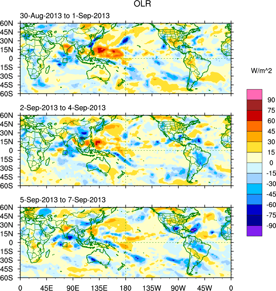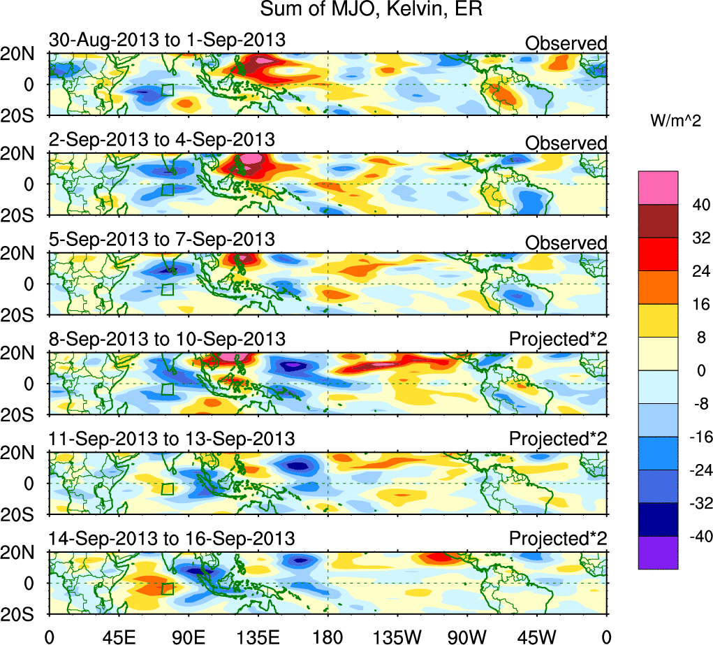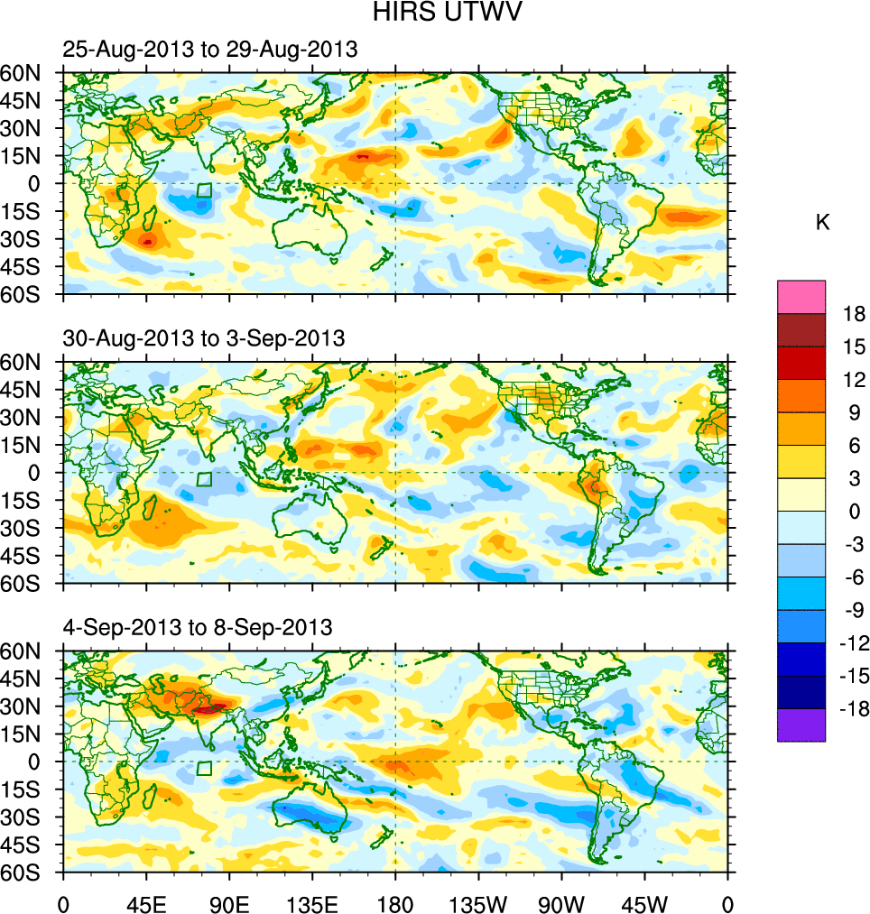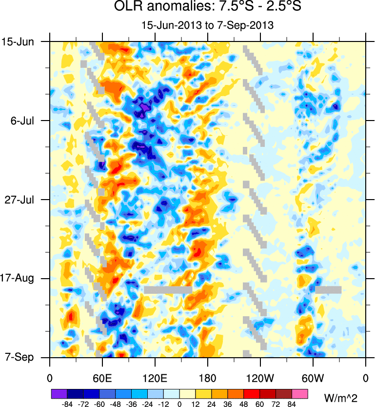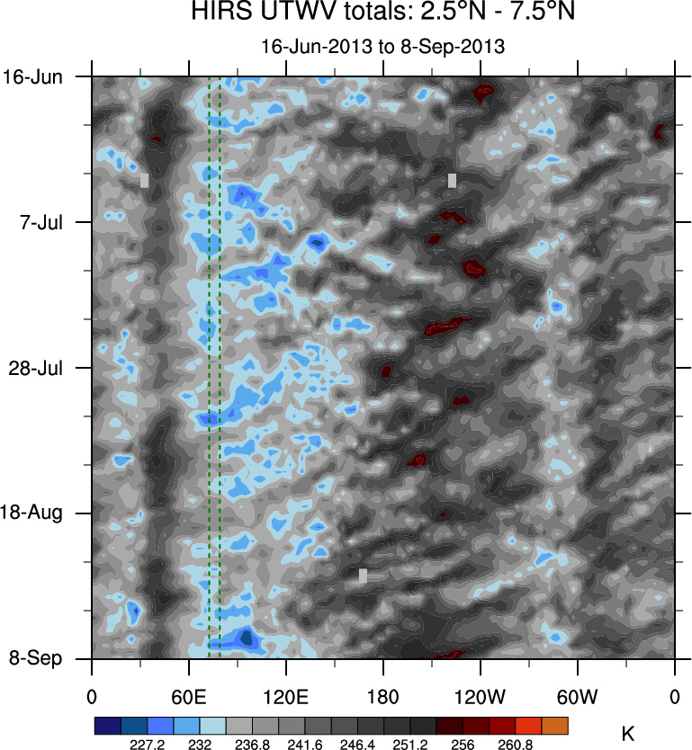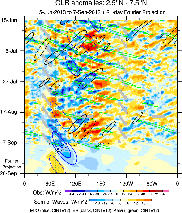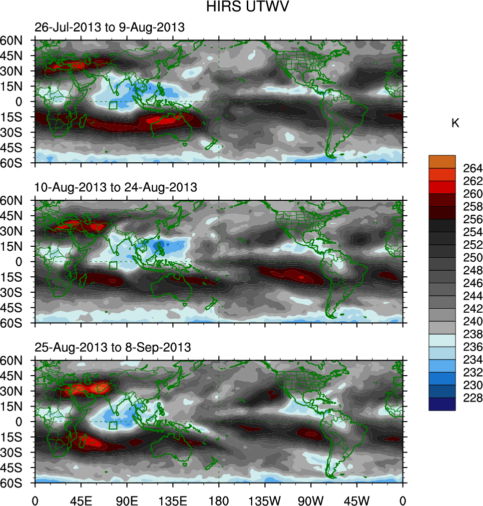 To identify tropical waves in near real-time, the OLR and UTWV data are filtered following Wheeler & Weickmann (2001 MWR). The daily anomalies are calculated using the first 3 harmonics of the seasonal cycle for 1979–2009. Missing values are then filled using linear interpolation in space and time. The most recent 365 days of anomalies are padded with 659 days of zeroes, and the result is filtered for each wave type.