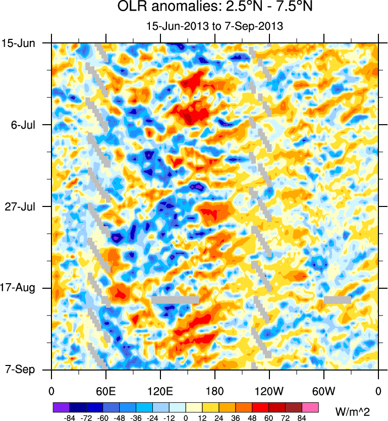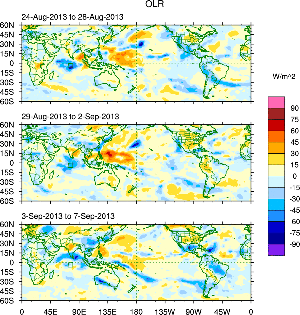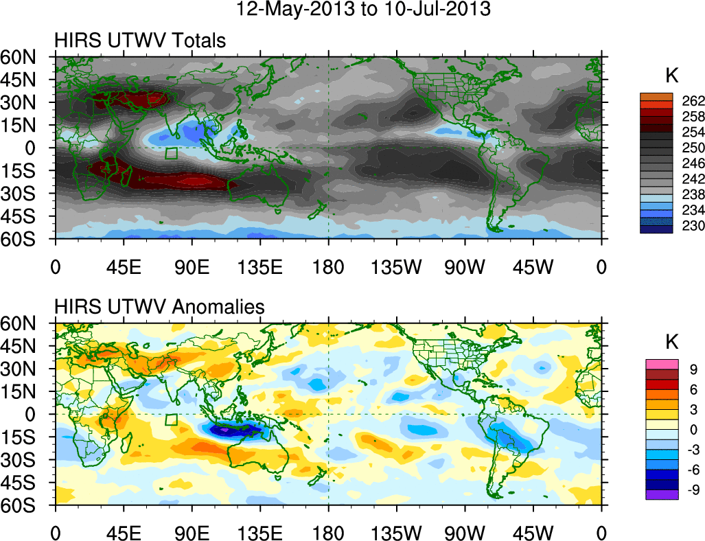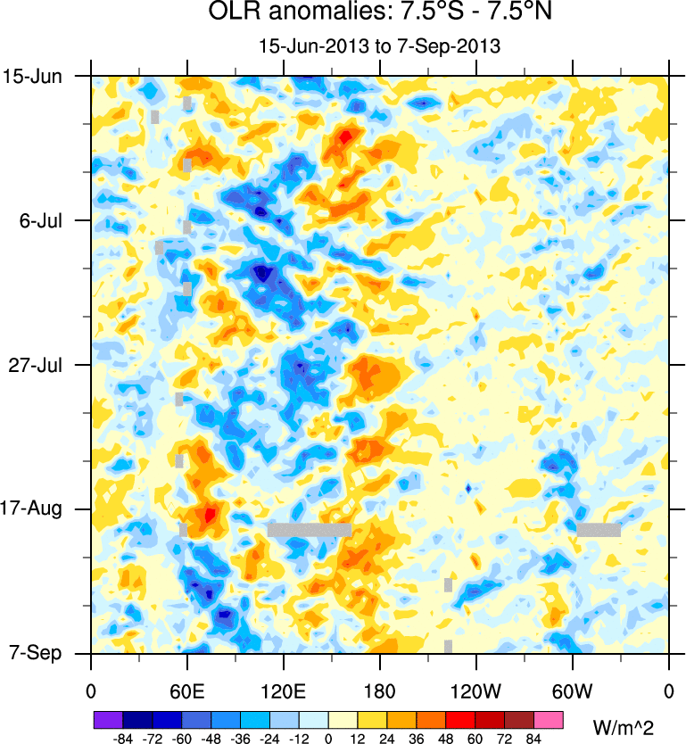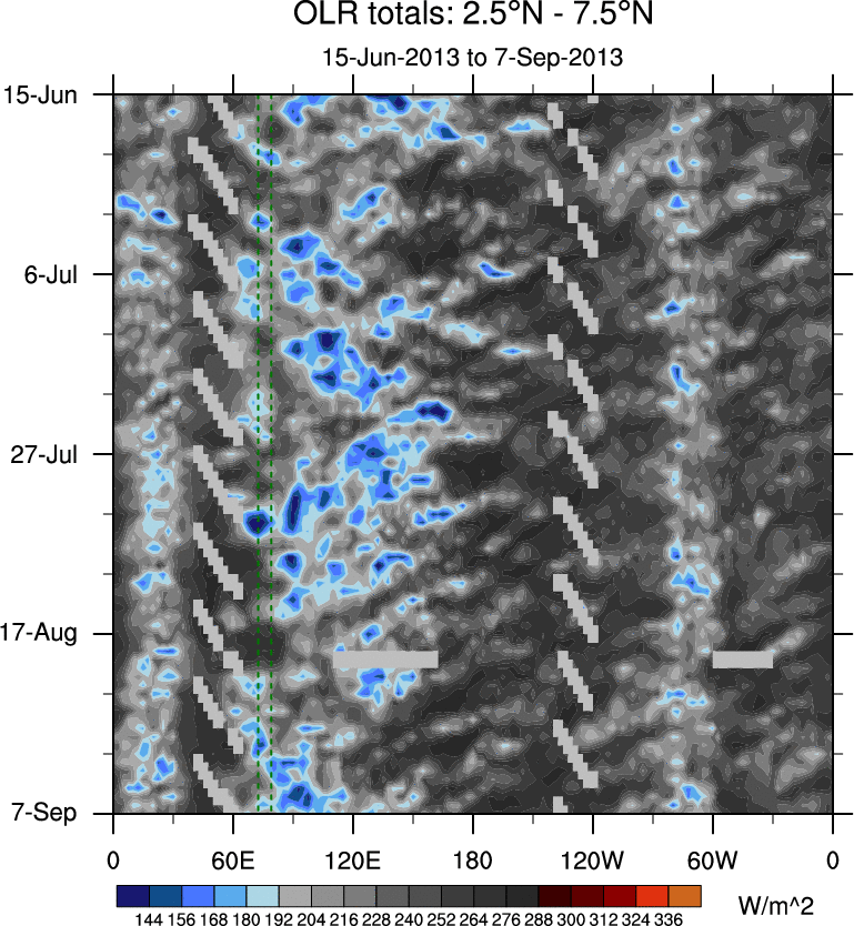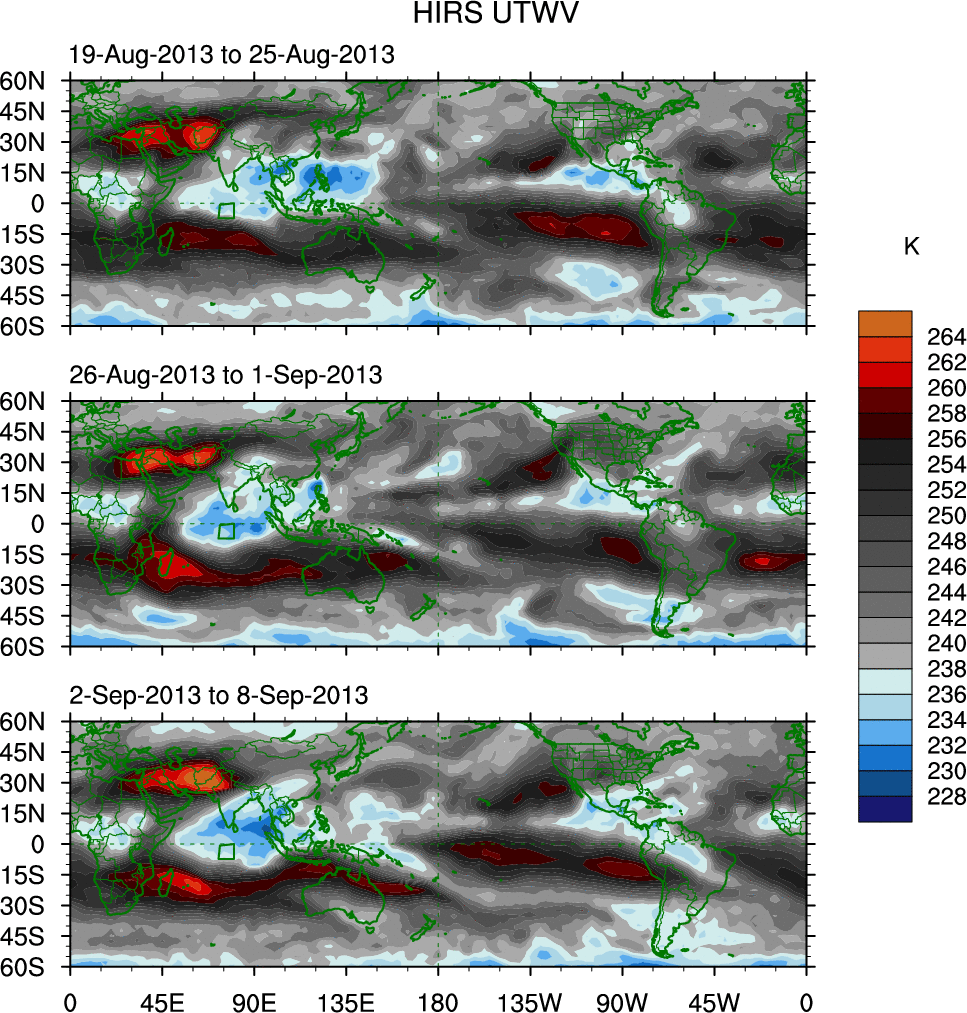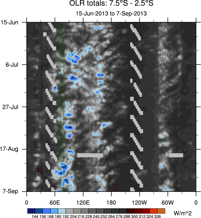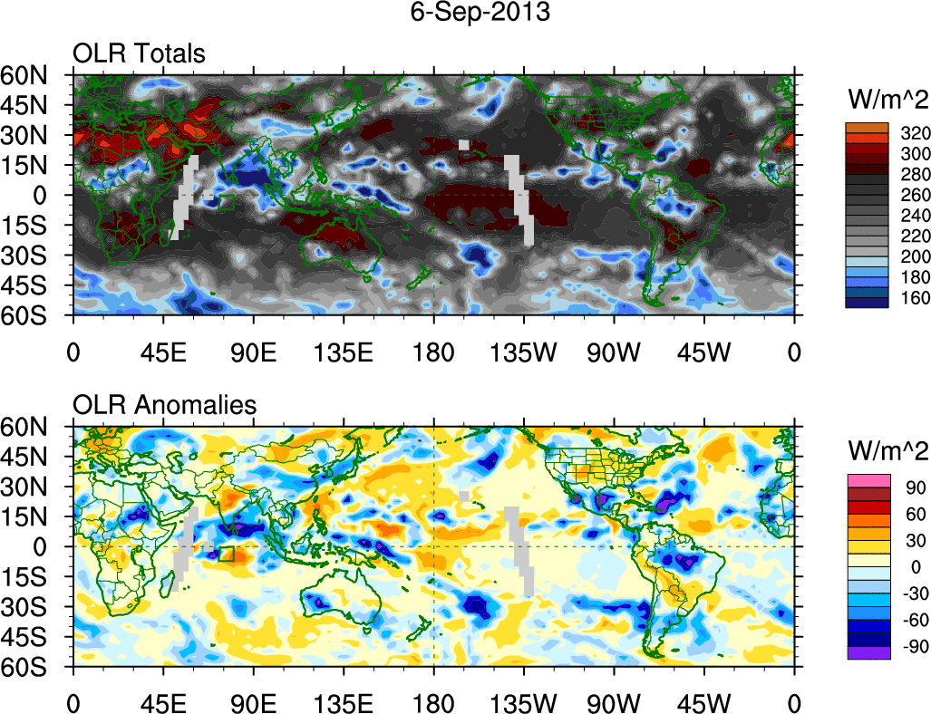 To identify tropical waves in near real-time, the OLR and UTWV data are filtered following Wheeler & Weickmann (2001 MWR). The daily anomalies are calculated using the first 3 harmonics of the seasonal cycle for 1979–2009. Missing values are then filled using linear interpolation in space and time. The most recent 365 days of anomalies are padded with 659 days of zeroes, and the result is filtered for each wave type.