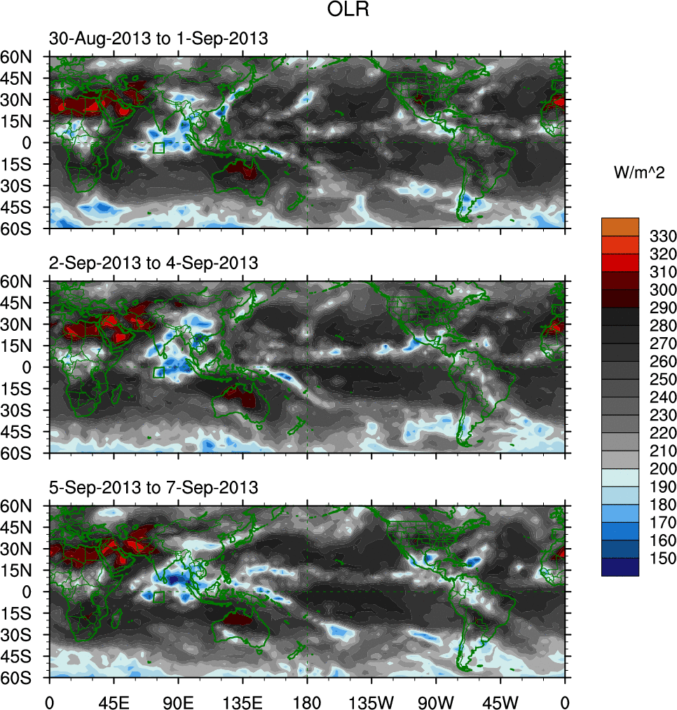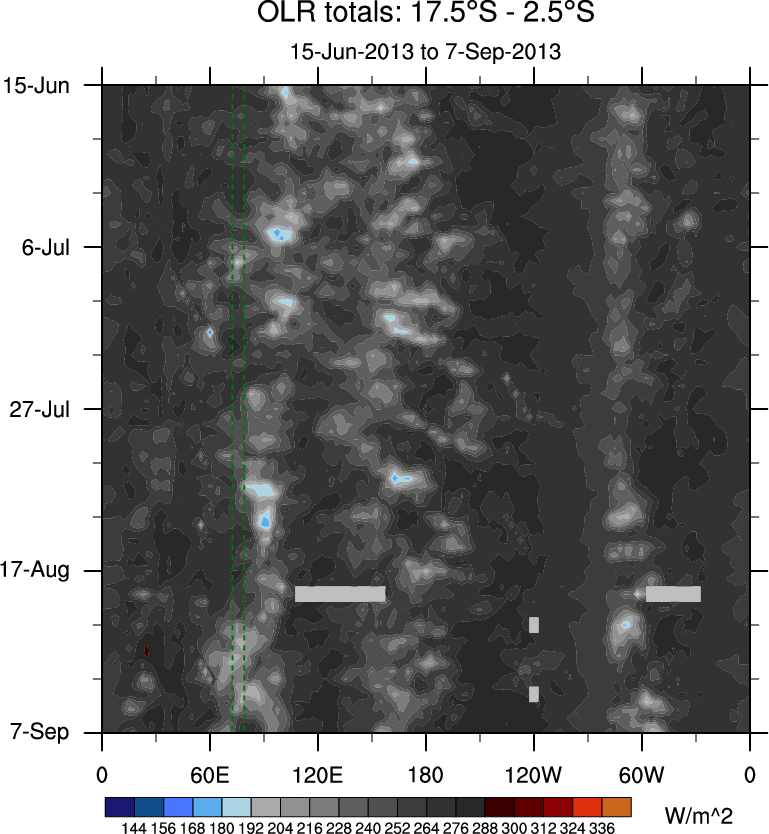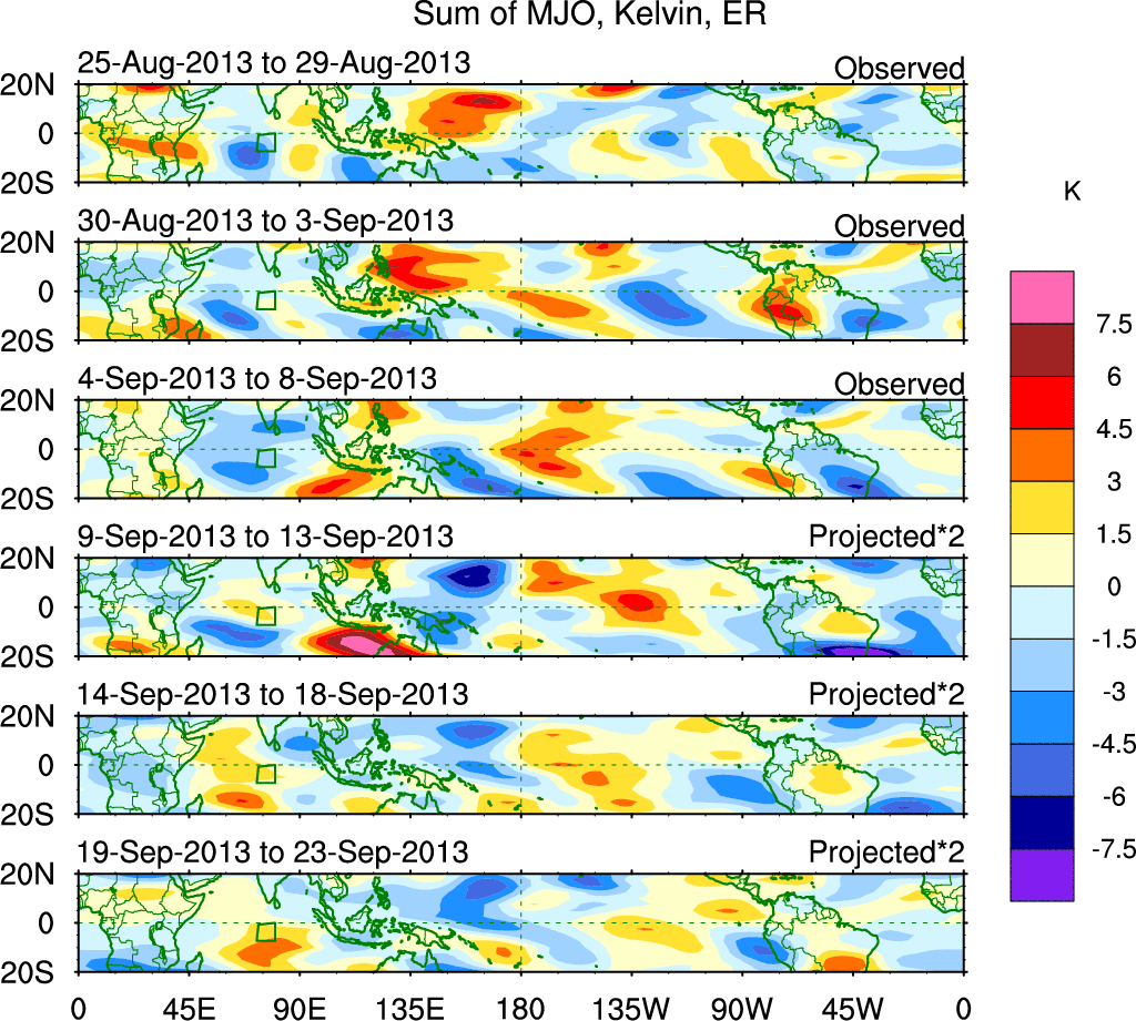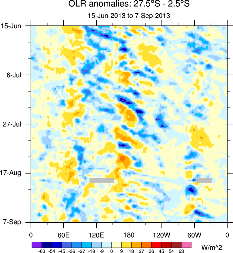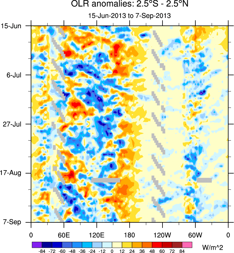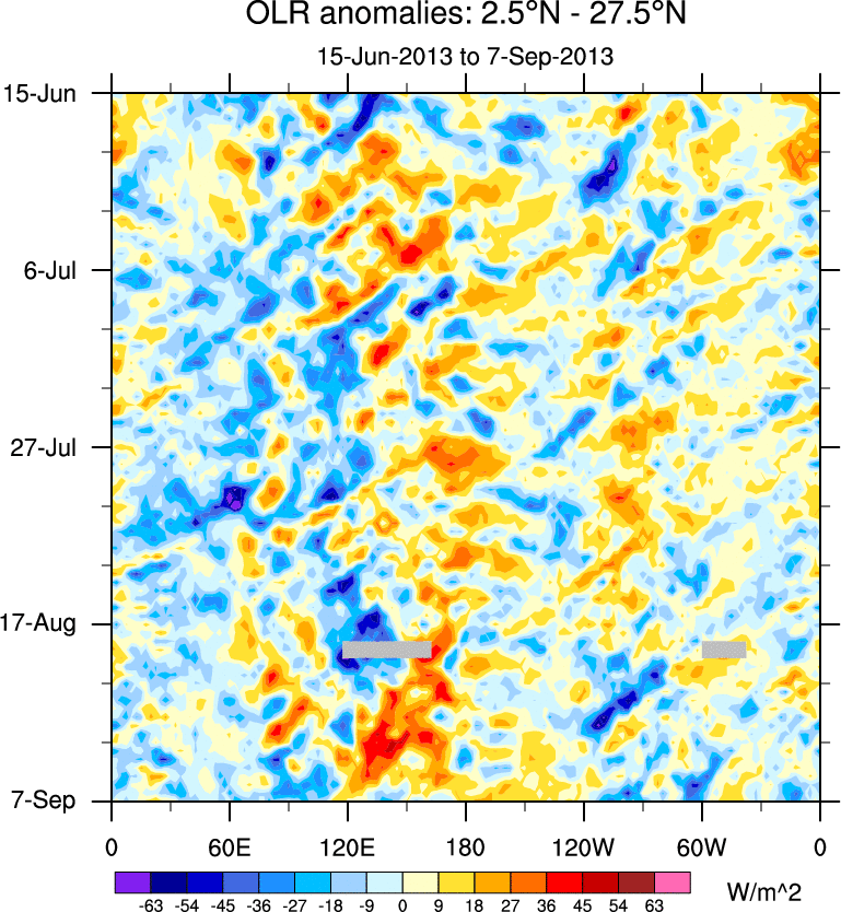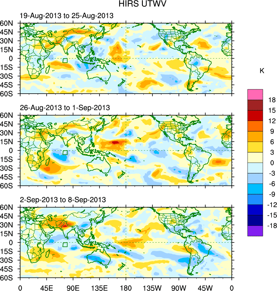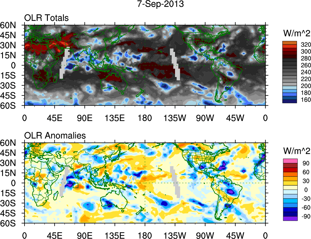 To identify tropical waves in near real-time, the OLR and UTWV data are filtered following Wheeler & Weickmann (2001 MWR). The daily anomalies are calculated using the first 3 harmonics of the seasonal cycle for 1979–2009. Missing values are then filled using linear interpolation in space and time. The most recent 365 days of anomalies are padded with 659 days of zeroes, and the result is filtered for each wave type.