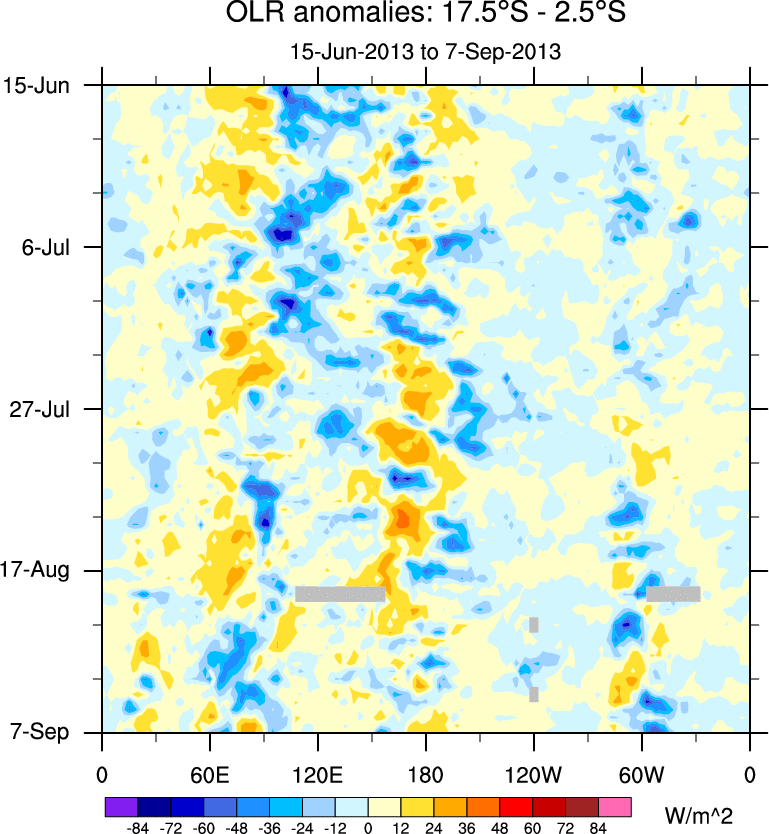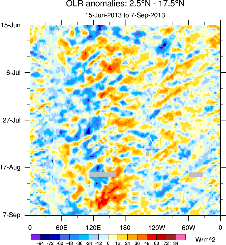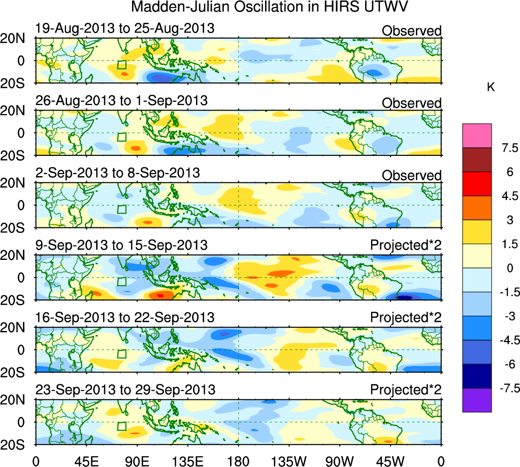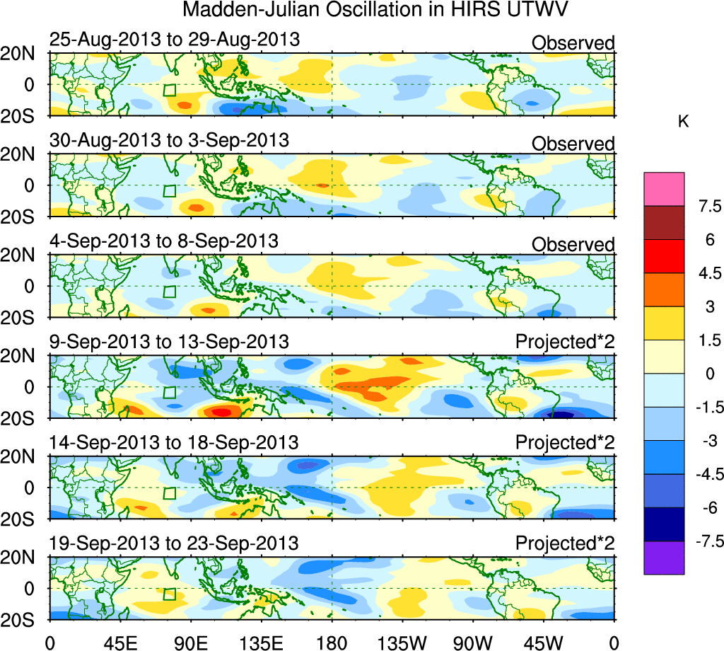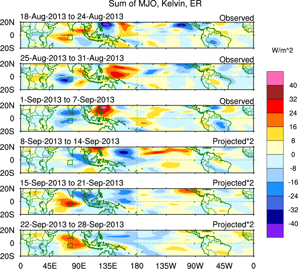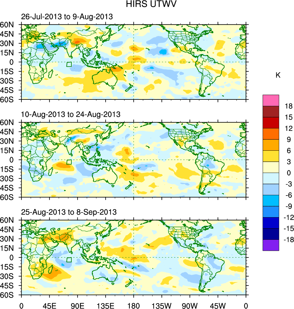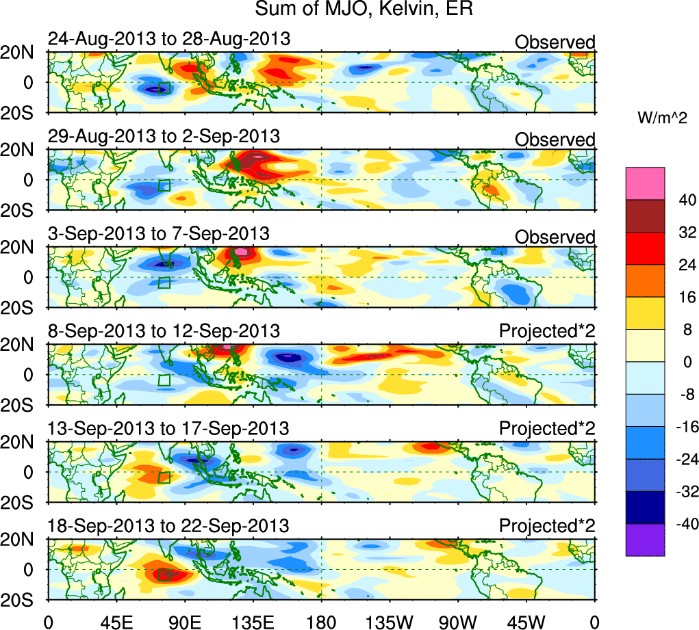 To identify tropical waves in near real-time, the OLR and UTWV data are filtered following Wheeler & Weickmann (2001 MWR). The daily anomalies are calculated using the first 3 harmonics of the seasonal cycle for 1979–2009. Missing values are then filled using linear interpolation in space and time. The most recent 365 days of anomalies are padded with 659 days of zeroes, and the result is filtered for each wave type.