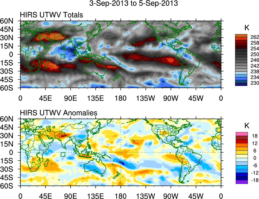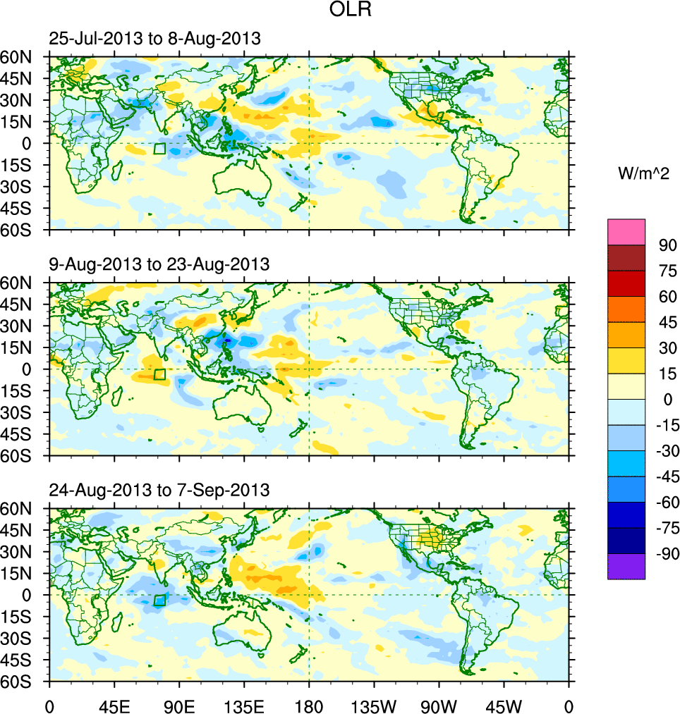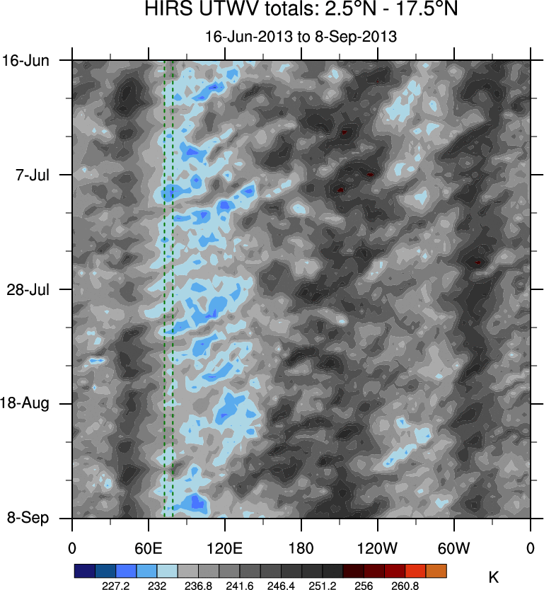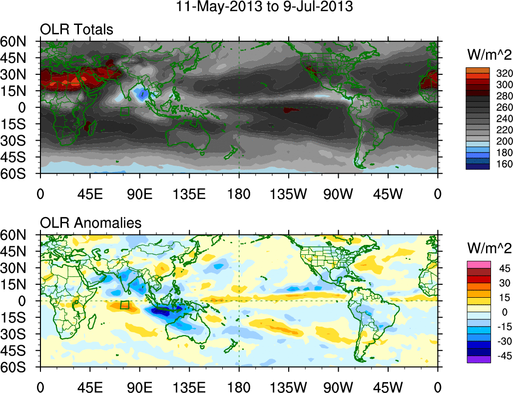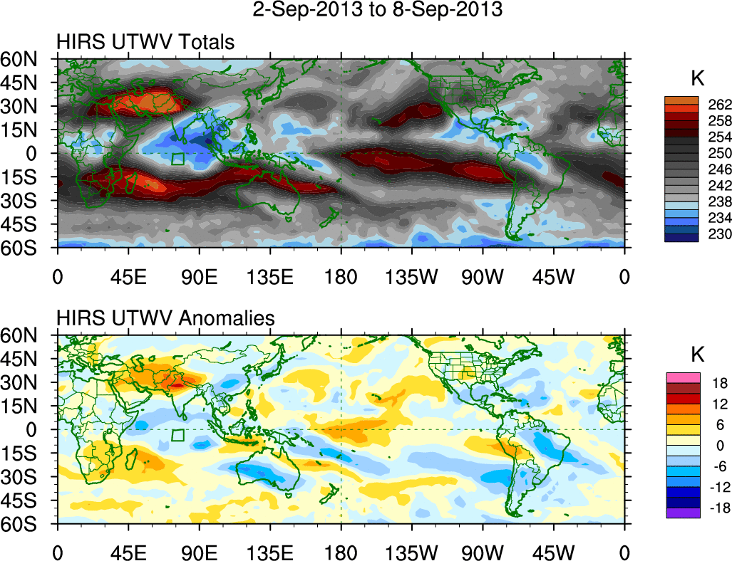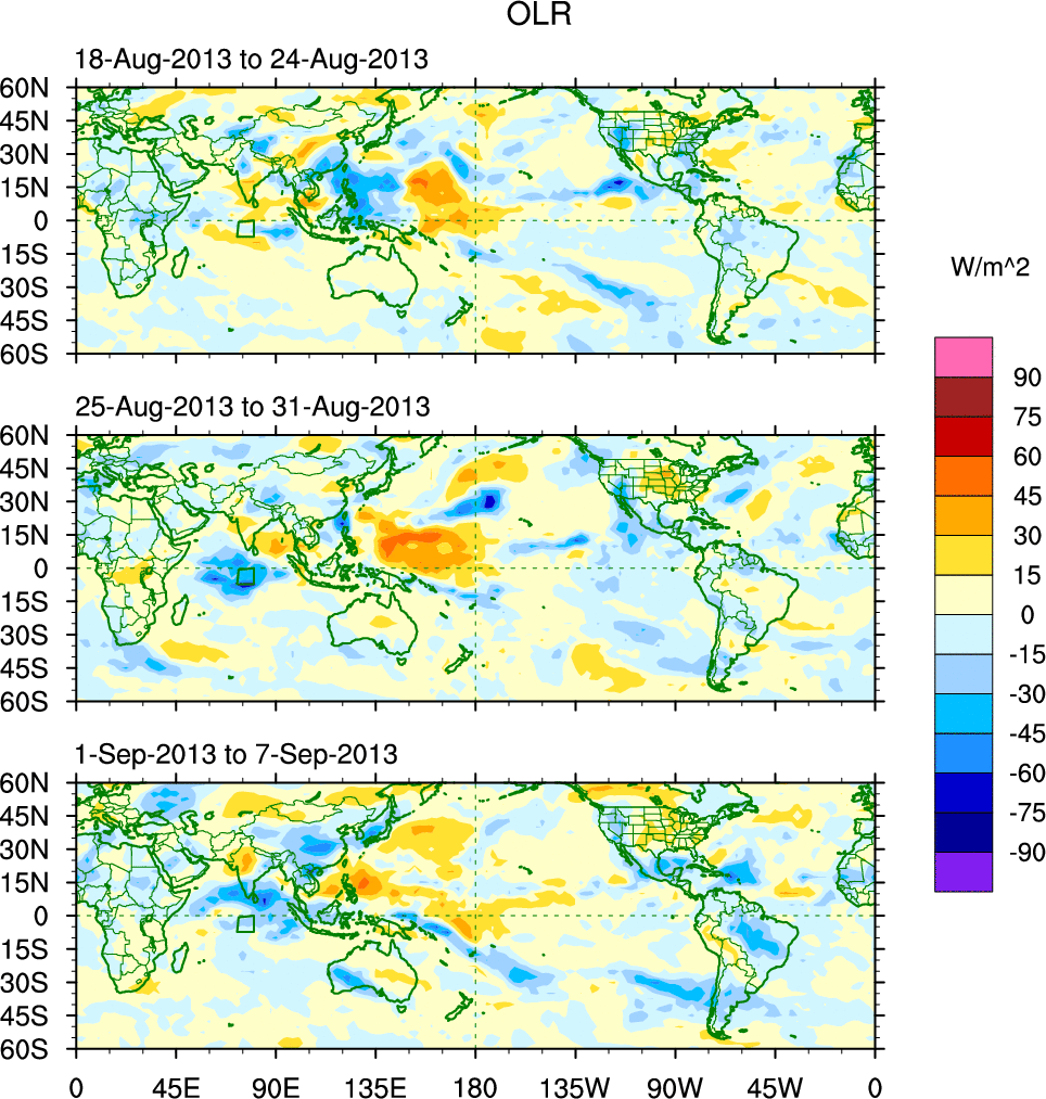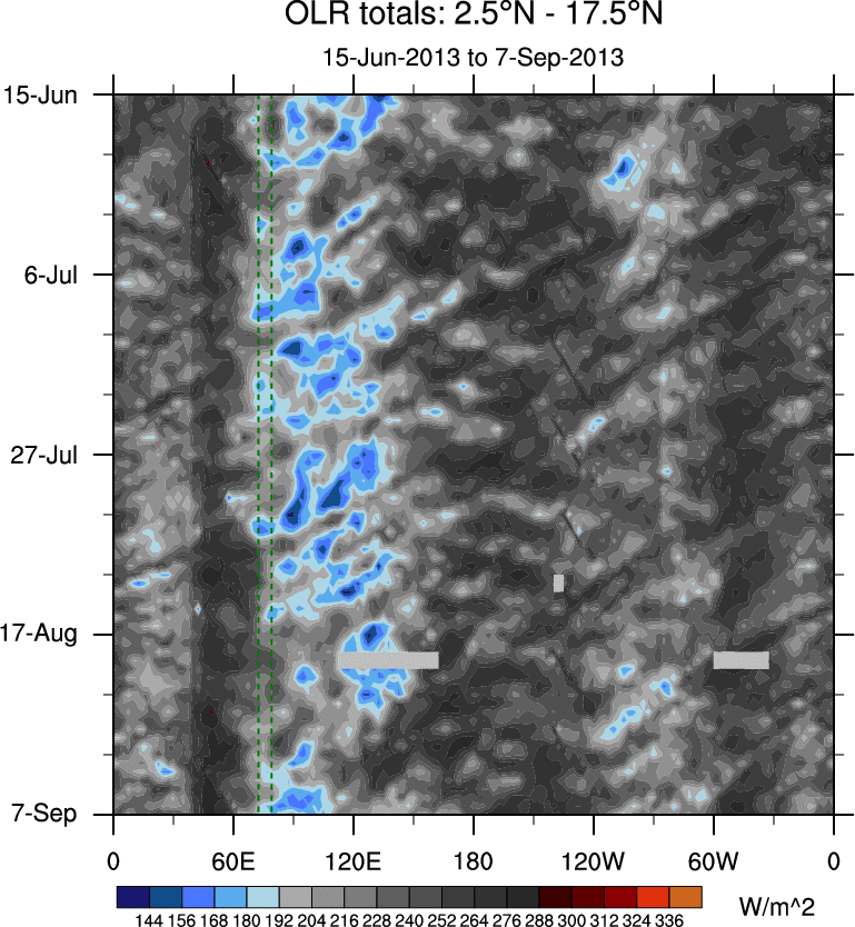 To identify tropical waves in near real-time, the OLR and UTWV data are filtered following Wheeler & Weickmann (2001 MWR). The daily anomalies are calculated using the first 3 harmonics of the seasonal cycle for 1979–2009. Missing values are then filled using linear interpolation in space and time. The most recent 365 days of anomalies are padded with 659 days of zeroes, and the result is filtered for each wave type.