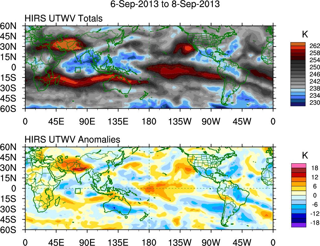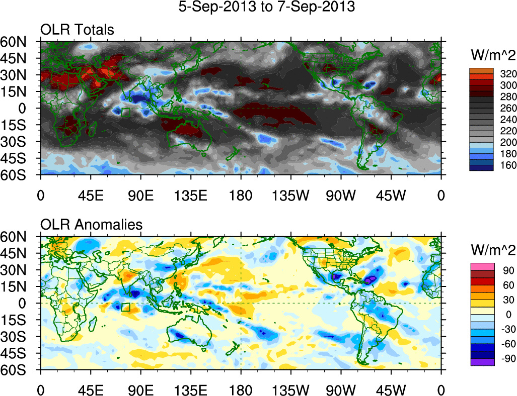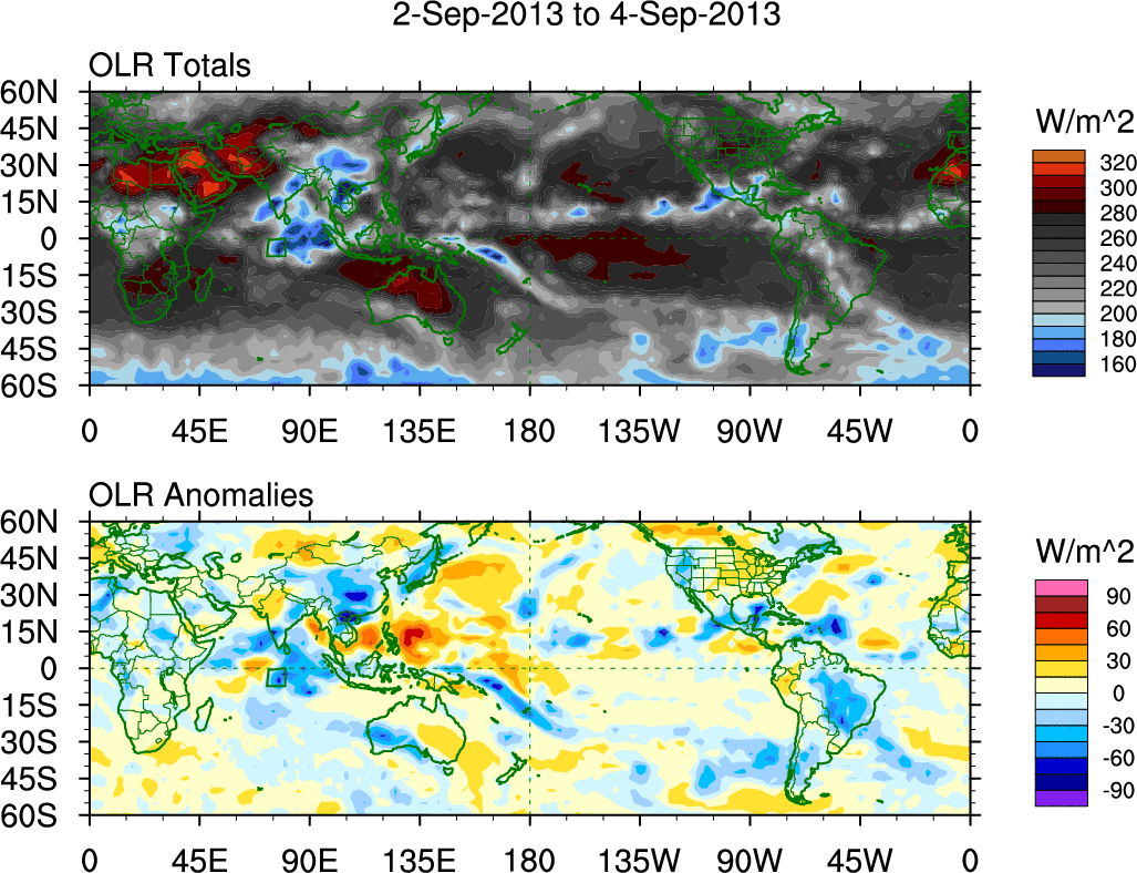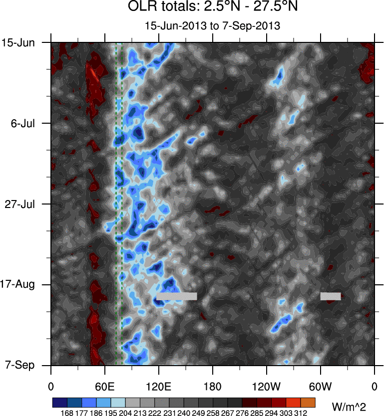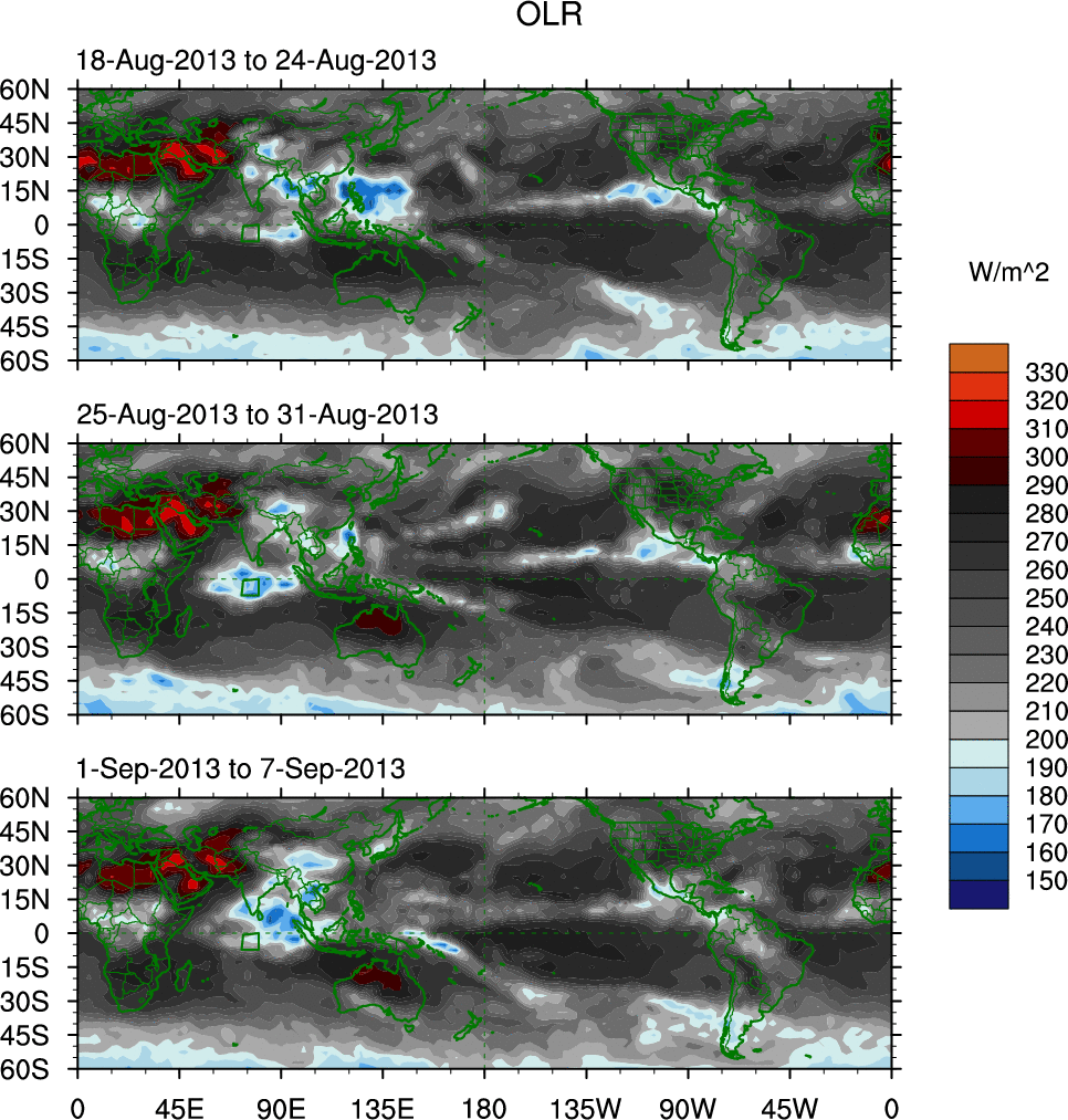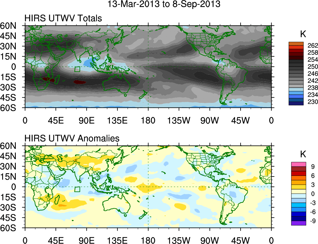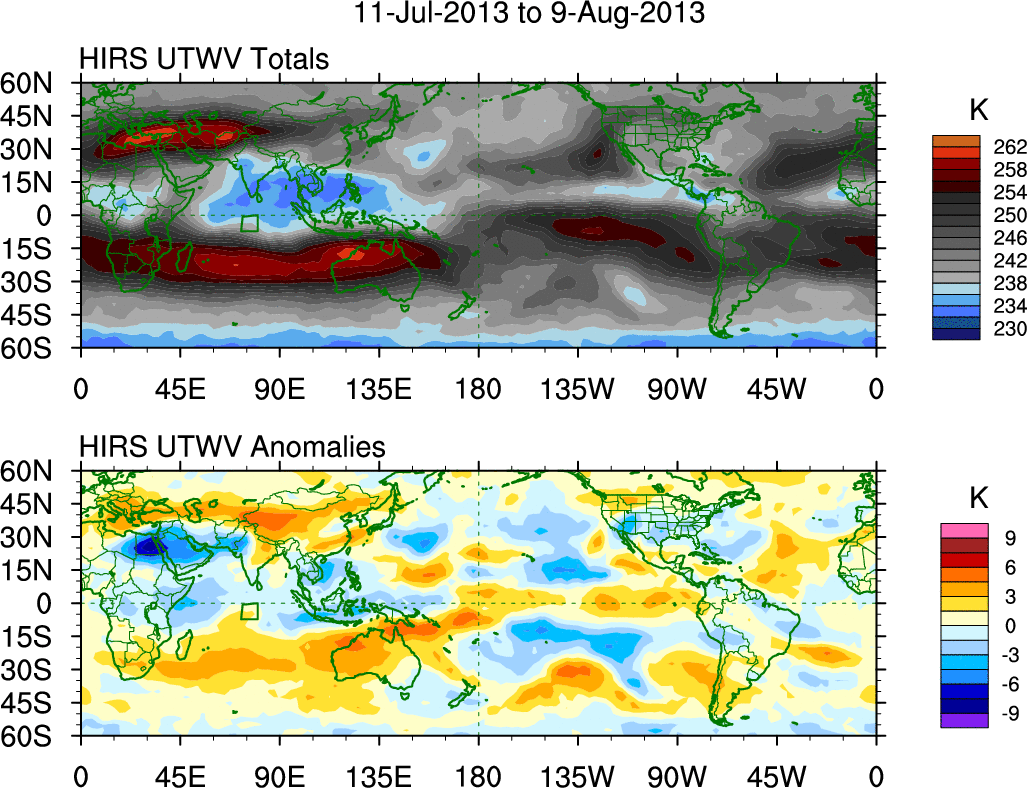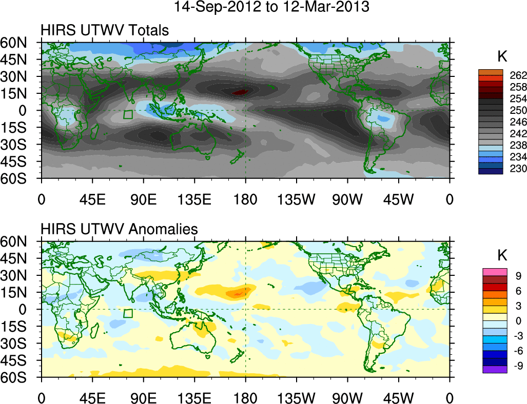 To identify tropical waves in near real-time, the OLR and UTWV data are filtered following Wheeler & Weickmann (2001 MWR). The daily anomalies are calculated using the first 3 harmonics of the seasonal cycle for 1979–2009. Missing values are then filled using linear interpolation in space and time. The most recent 365 days of anomalies are padded with 659 days of zeroes, and the result is filtered for each wave type.