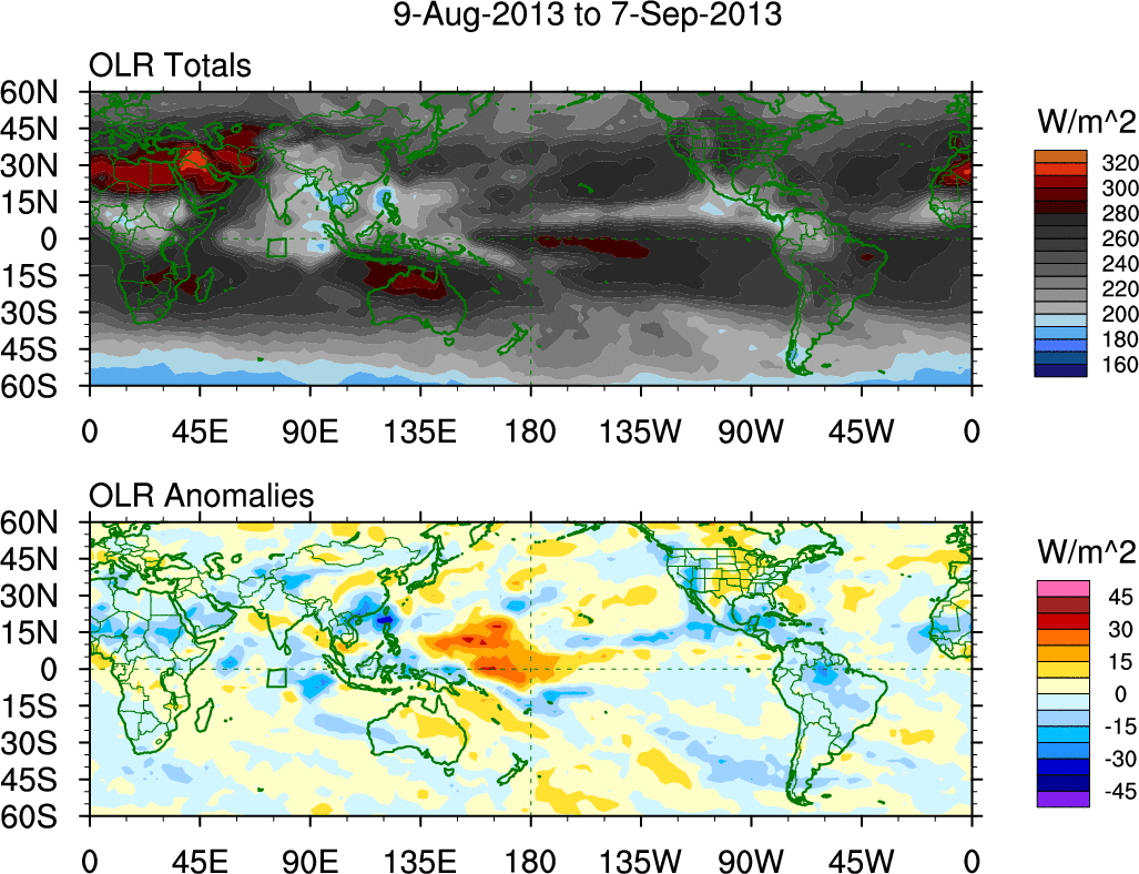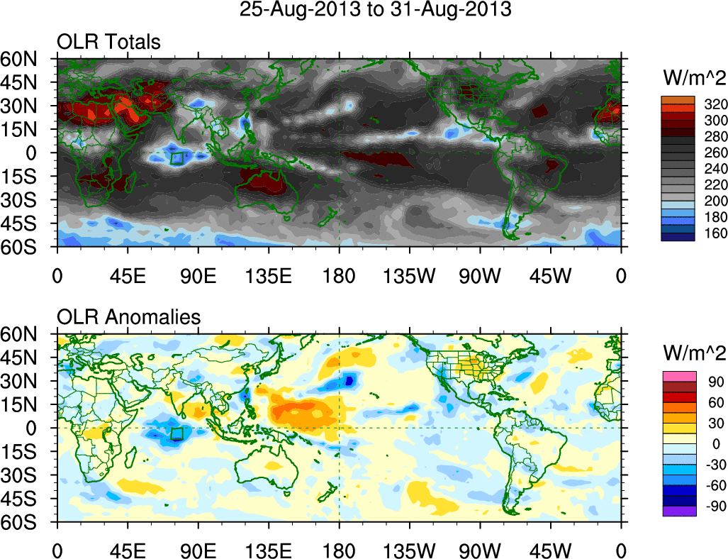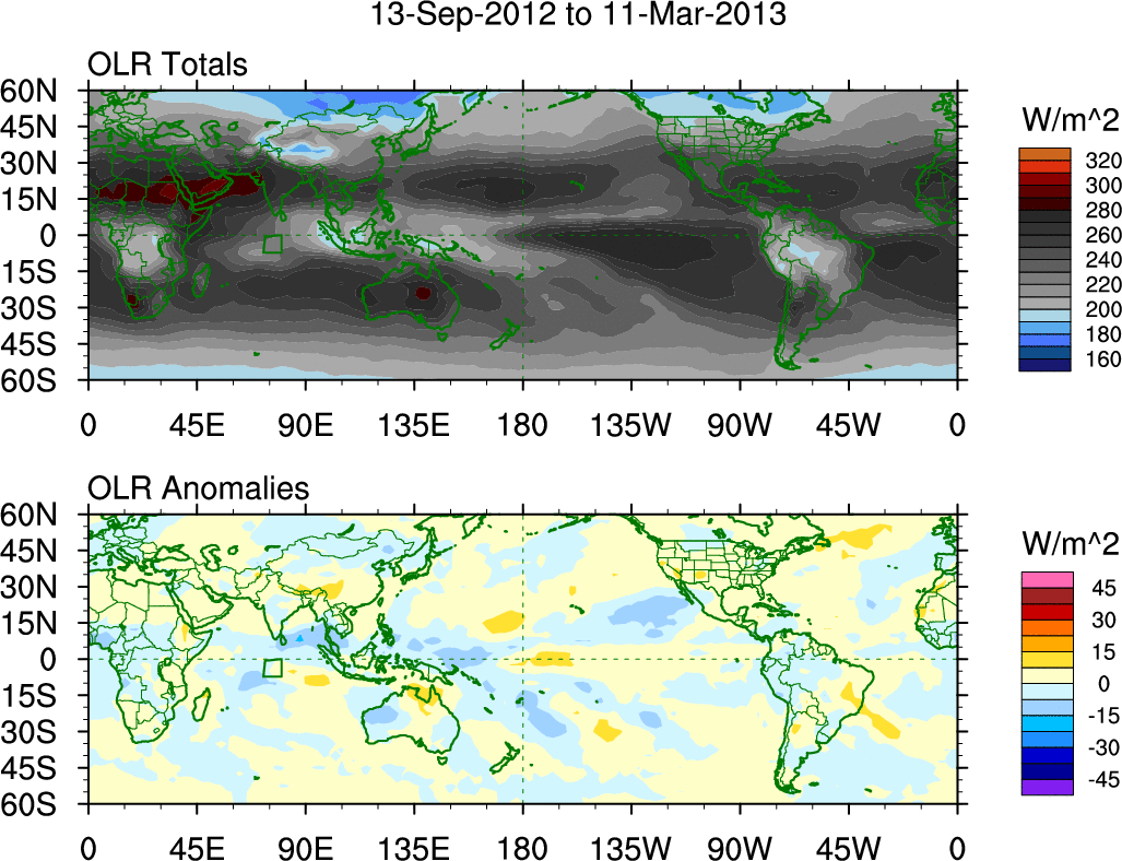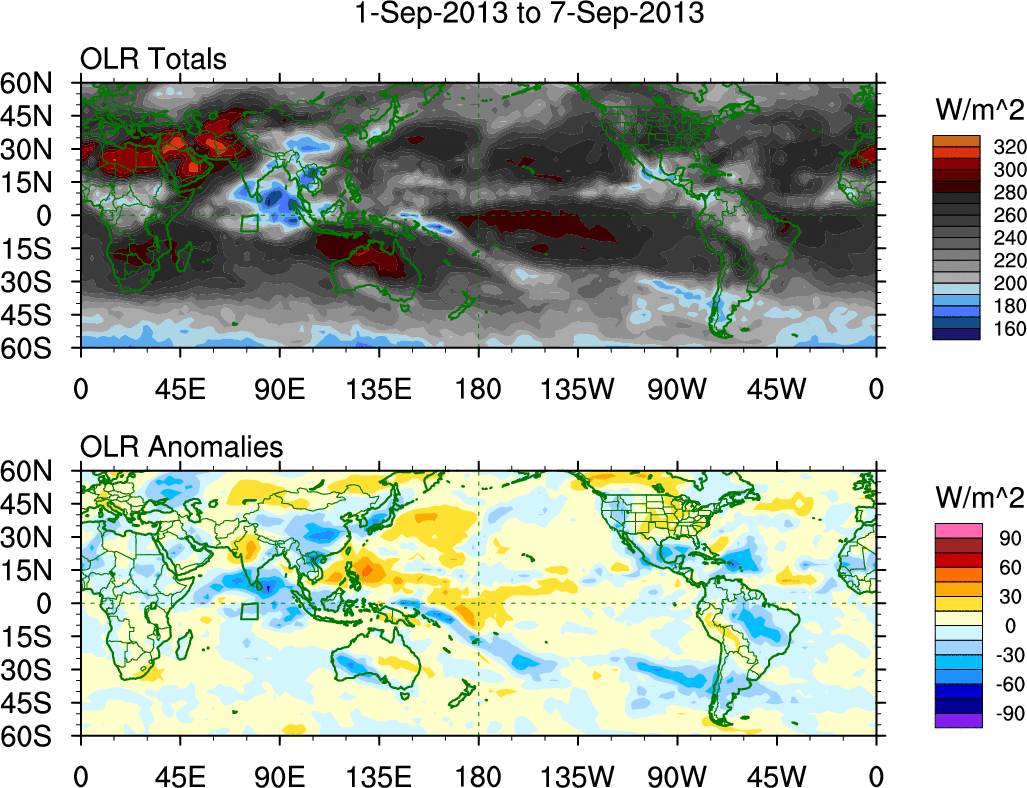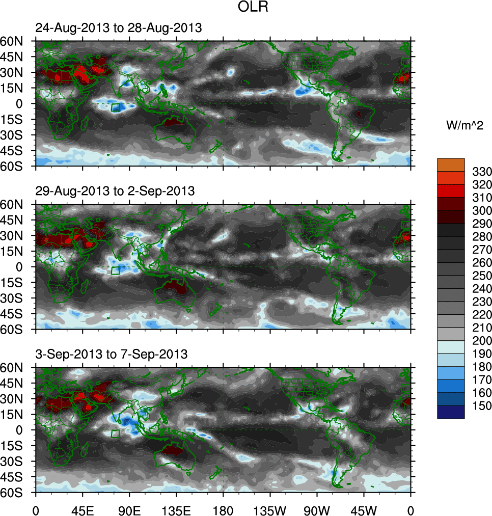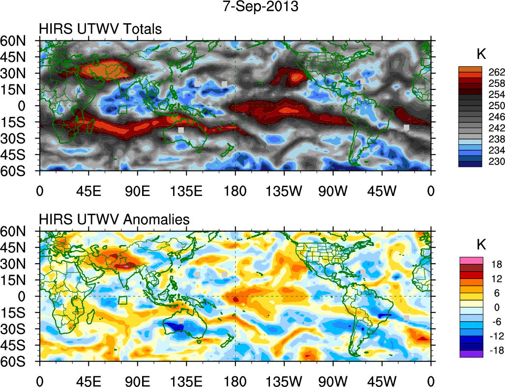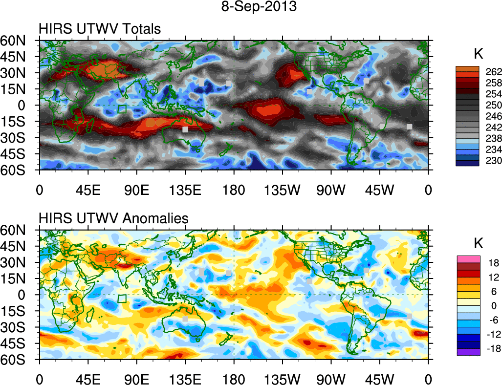 To identify tropical waves in near real-time, the OLR and UTWV data are filtered following Wheeler & Weickmann (2001 MWR). The daily anomalies are calculated using the first 3 harmonics of the seasonal cycle for 1979–2009. Missing values are then filled using linear interpolation in space and time. The most recent 365 days of anomalies are padded with 659 days of zeroes, and the result is filtered for each wave type.