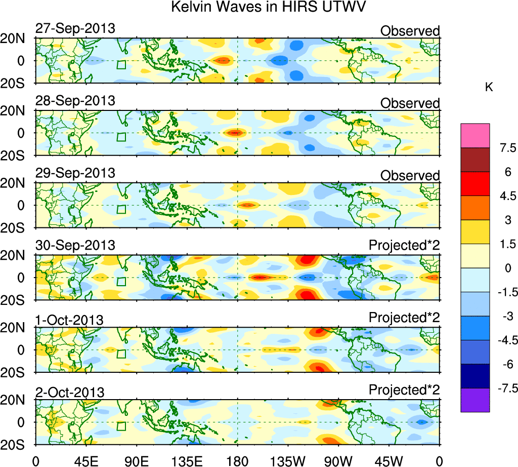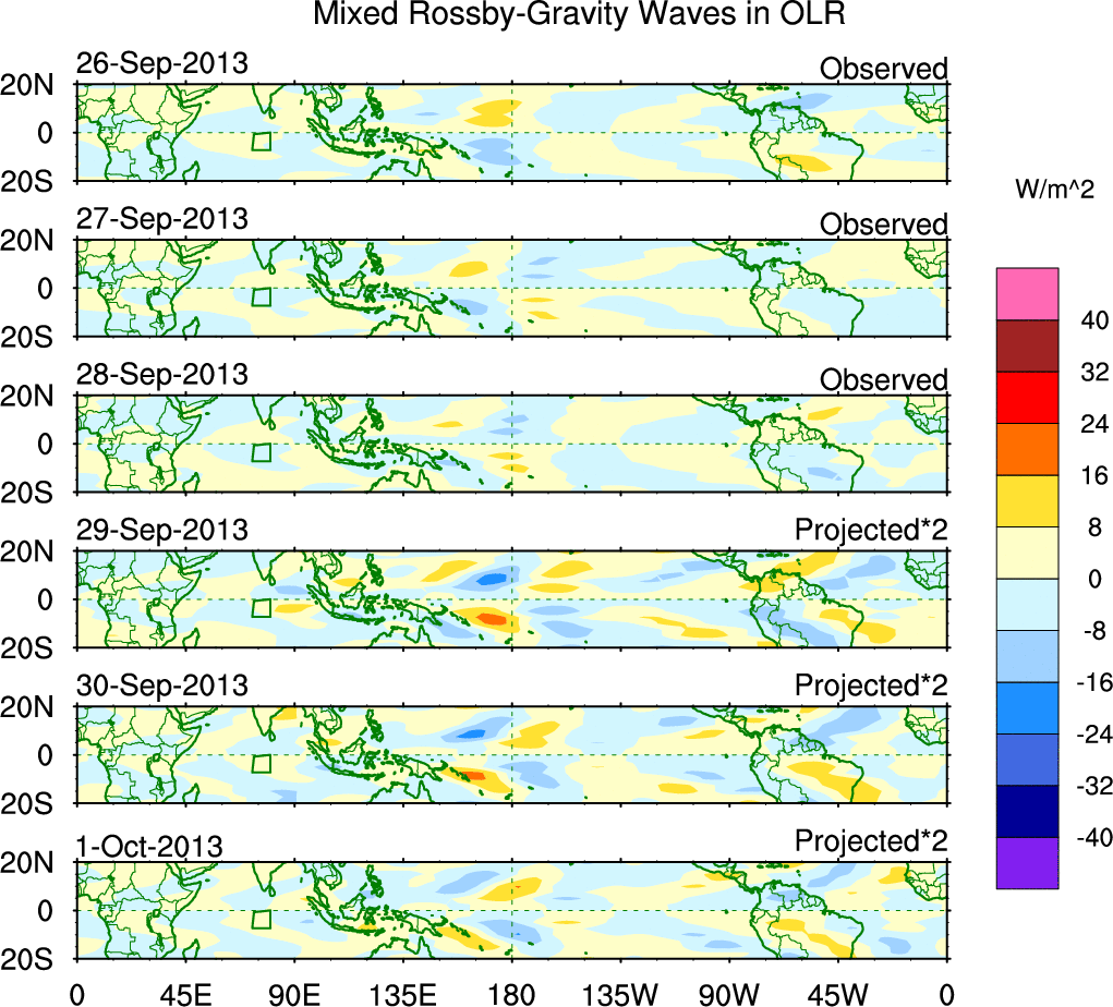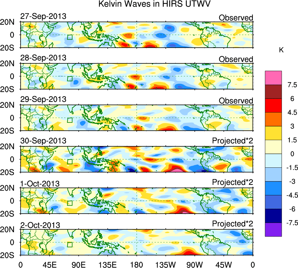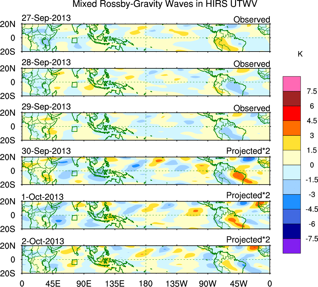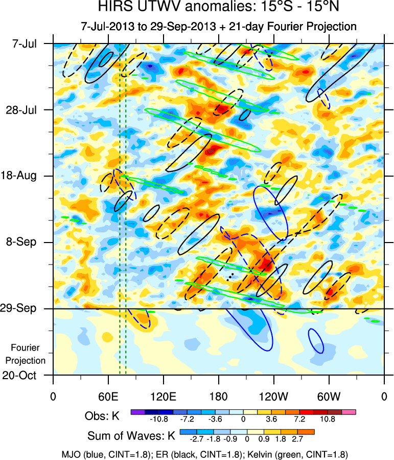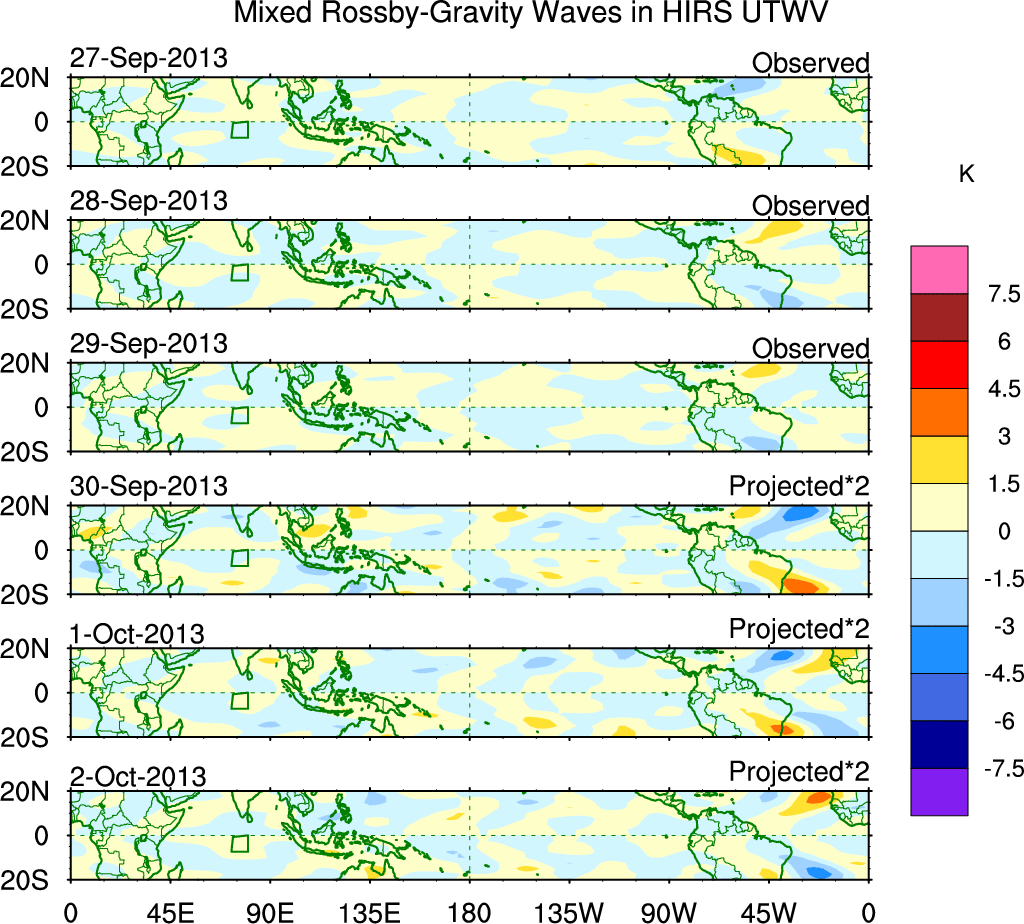 To identify tropical waves in near real-time, the OLR and UTWV data are filtered following Wheeler & Weickmann (2001 MWR). The daily anomalies are calculated using the first 3 harmonics of the seasonal cycle for 1979–2009. Missing values are then filled using linear interpolation in space and time. The most recent 365 days of anomalies are padded with 659 days of zeroes, and the result is filtered for each wave type.