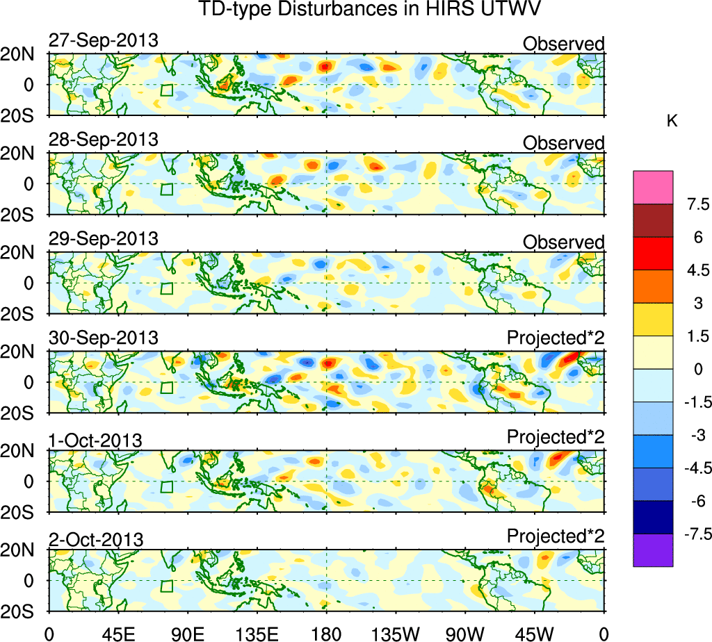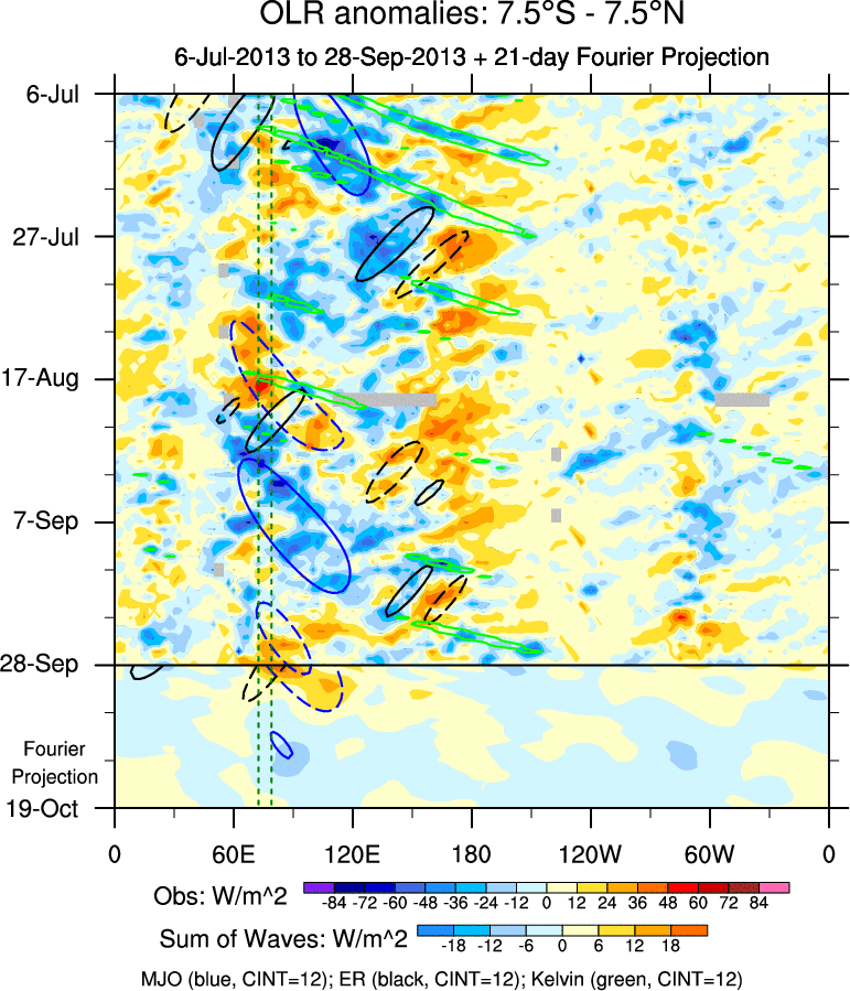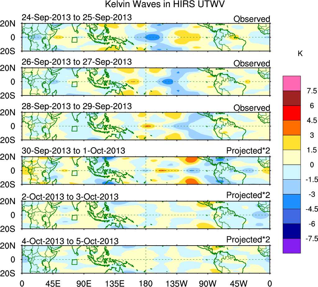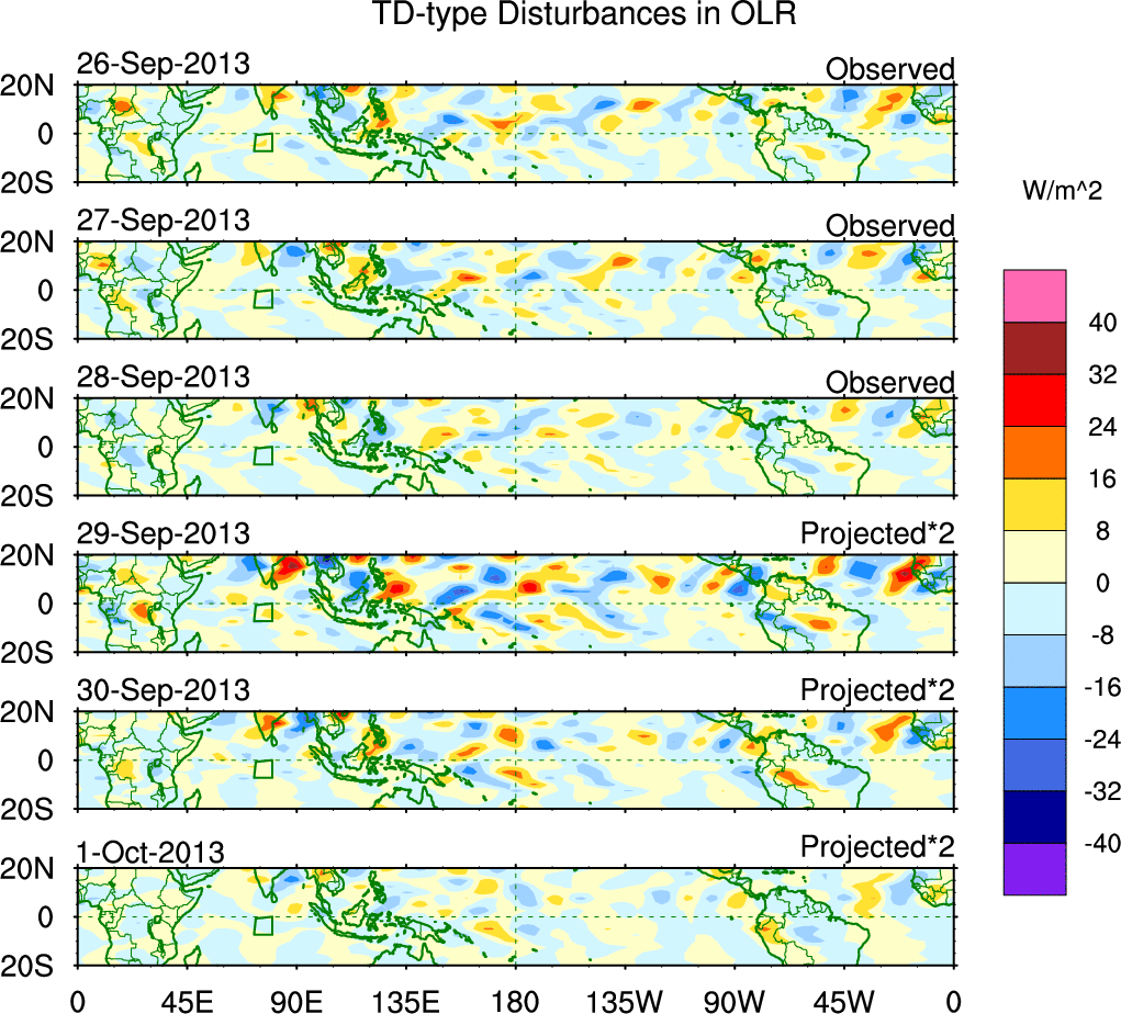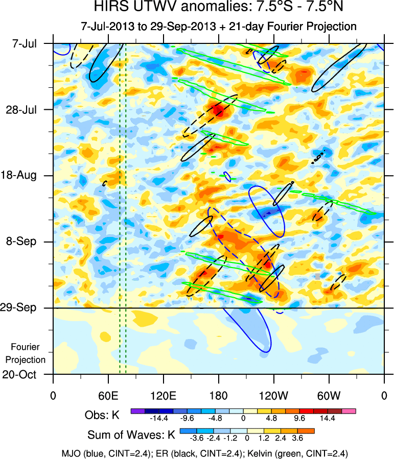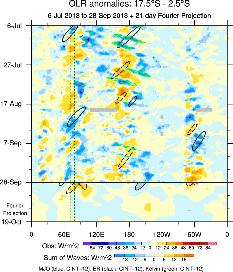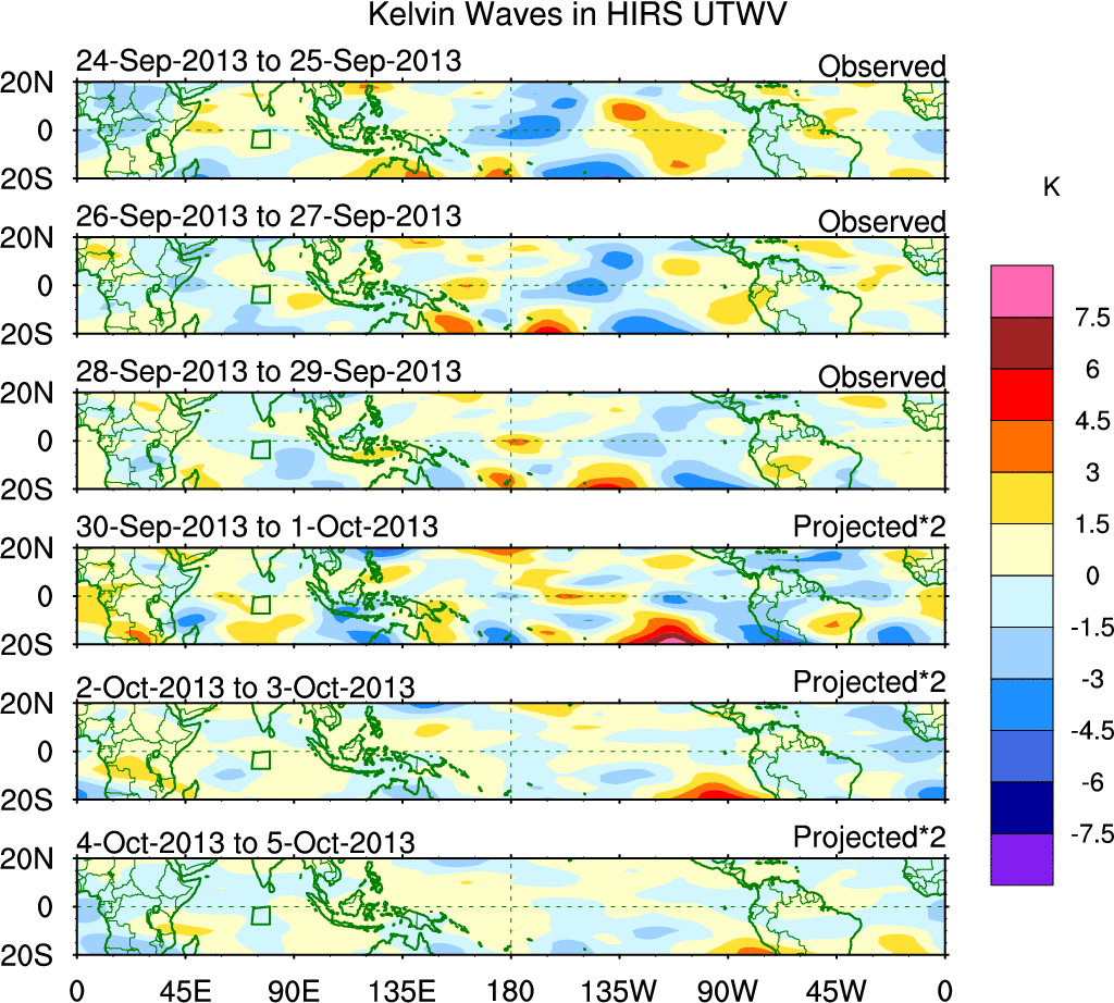 To identify tropical waves in near real-time, the OLR and UTWV data are filtered following Wheeler & Weickmann (2001 MWR). The daily anomalies are calculated using the first 3 harmonics of the seasonal cycle for 1979–2009. Missing values are then filled using linear interpolation in space and time. The most recent 365 days of anomalies are padded with 659 days of zeroes, and the result is filtered for each wave type.