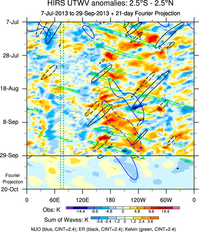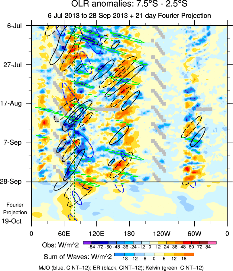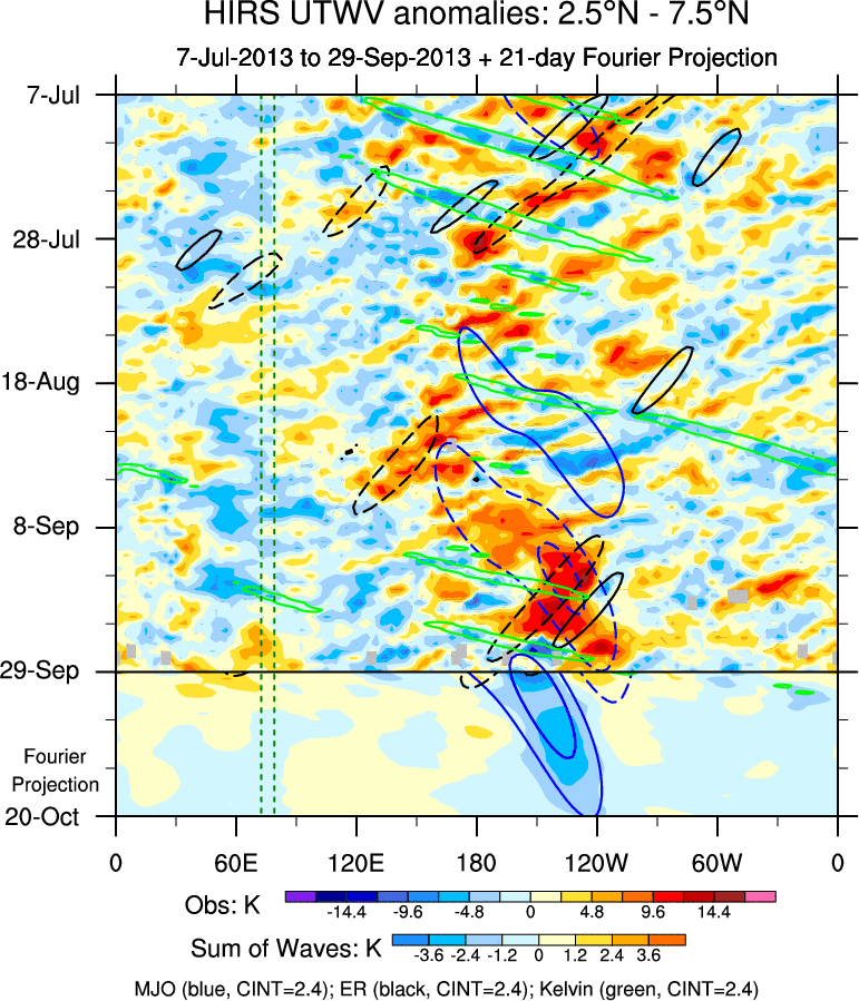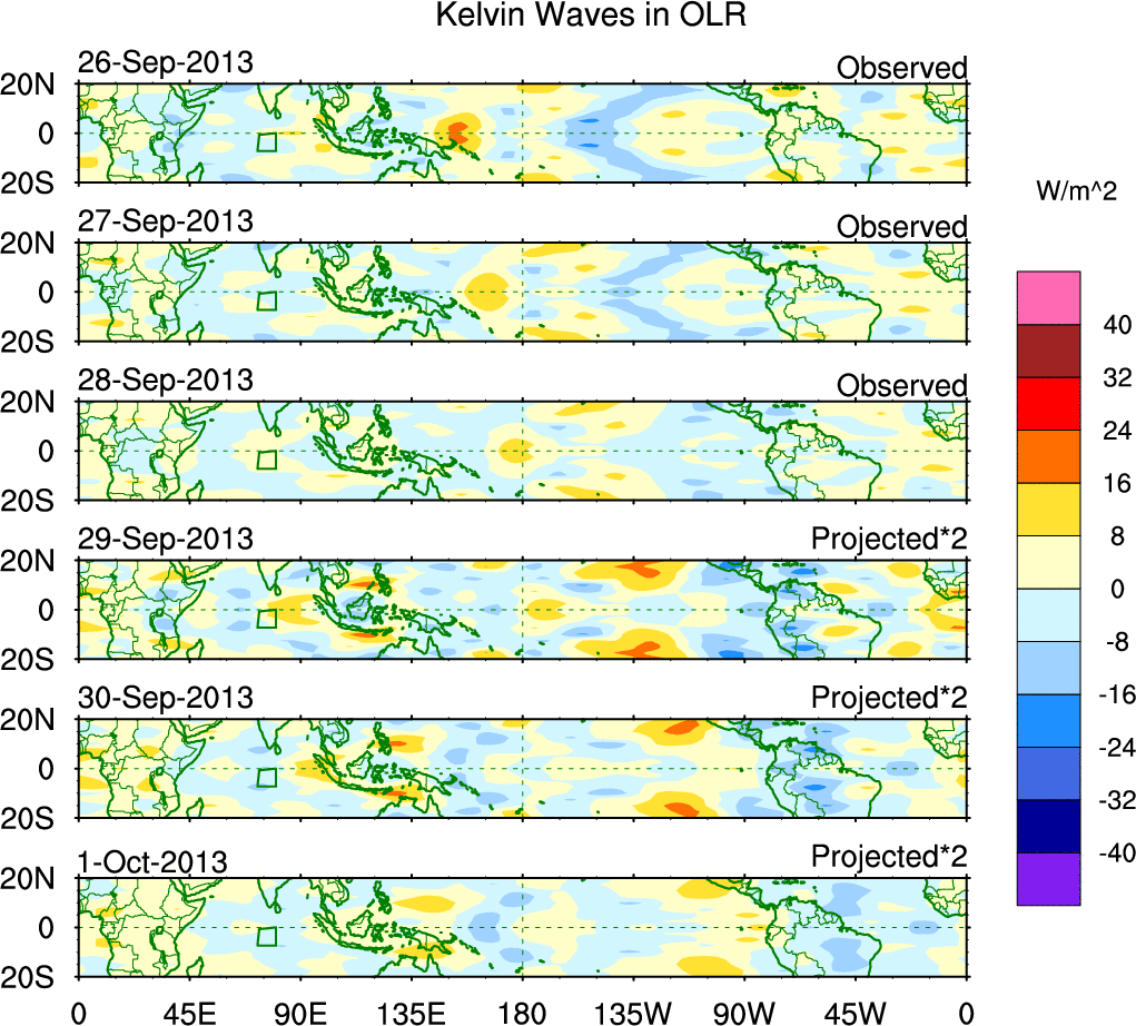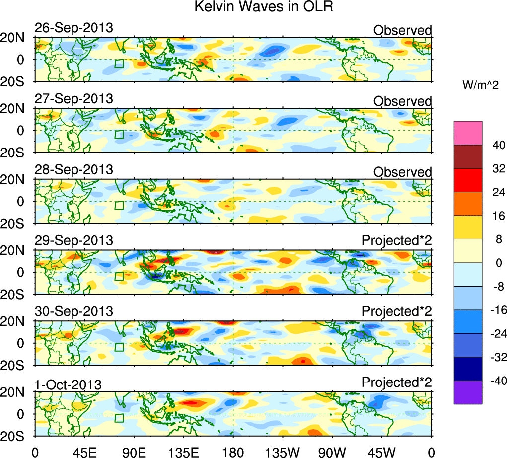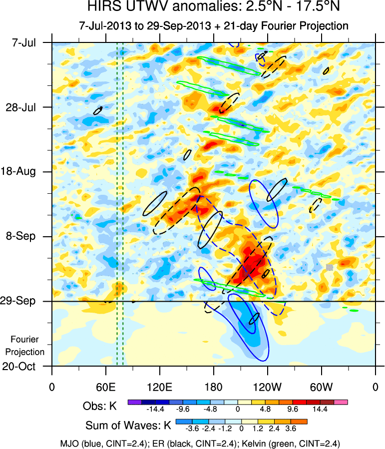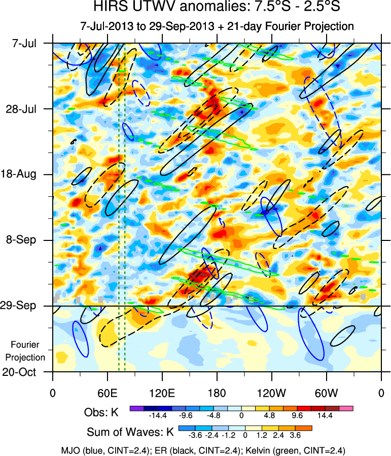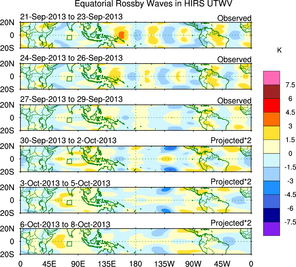 To identify tropical waves in near real-time, the OLR and UTWV data are filtered following Wheeler & Weickmann (2001 MWR). The daily anomalies are calculated using the first 3 harmonics of the seasonal cycle for 1979–2009. Missing values are then filled using linear interpolation in space and time. The most recent 365 days of anomalies are padded with 659 days of zeroes, and the result is filtered for each wave type.