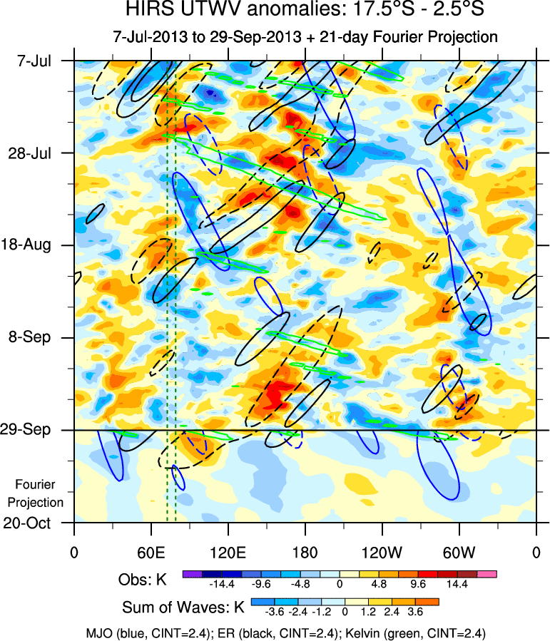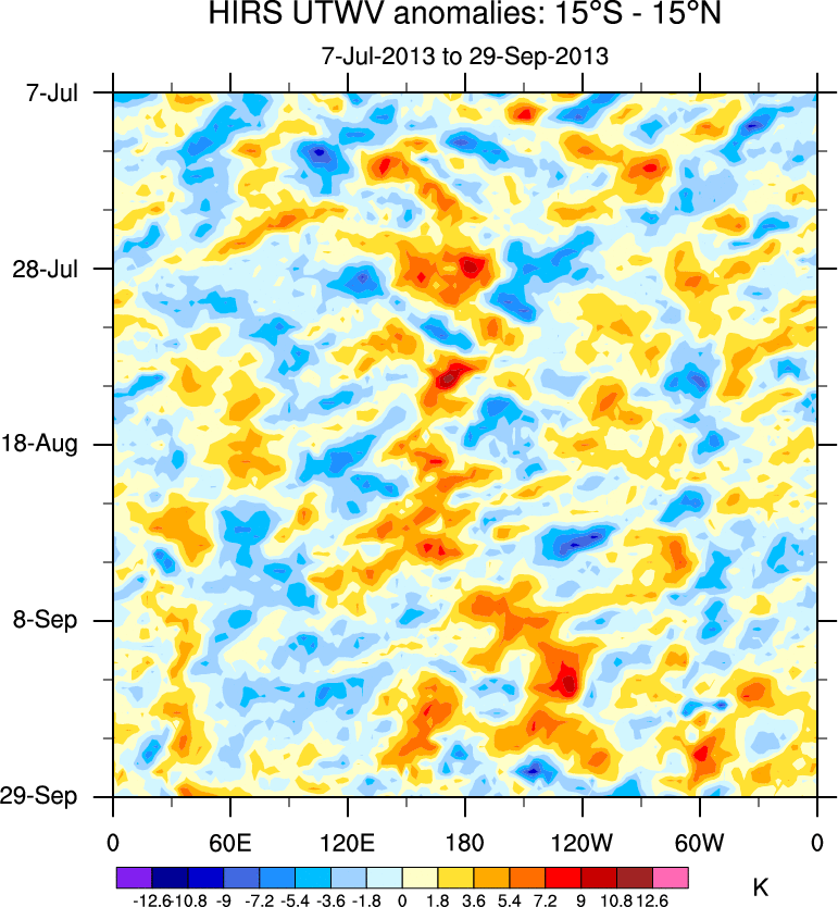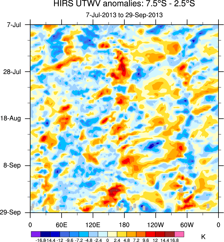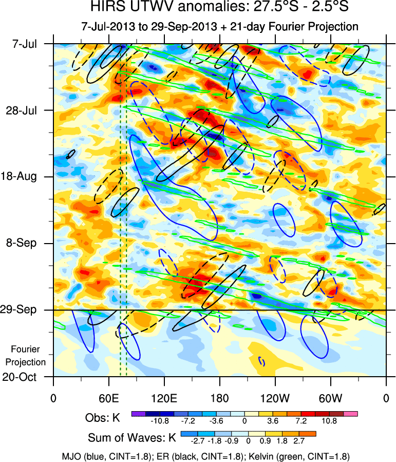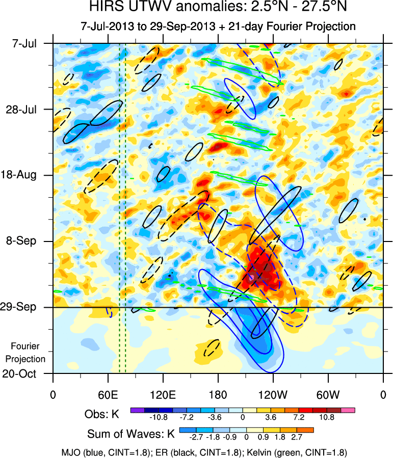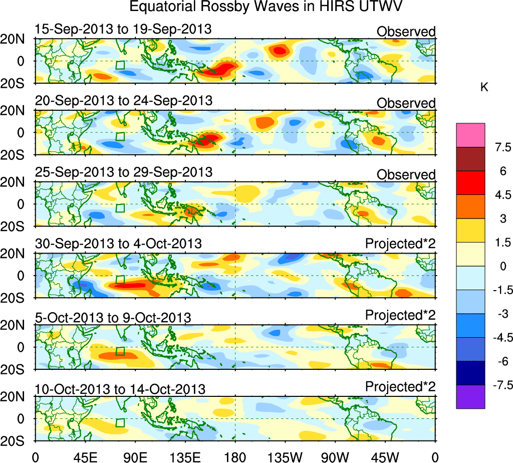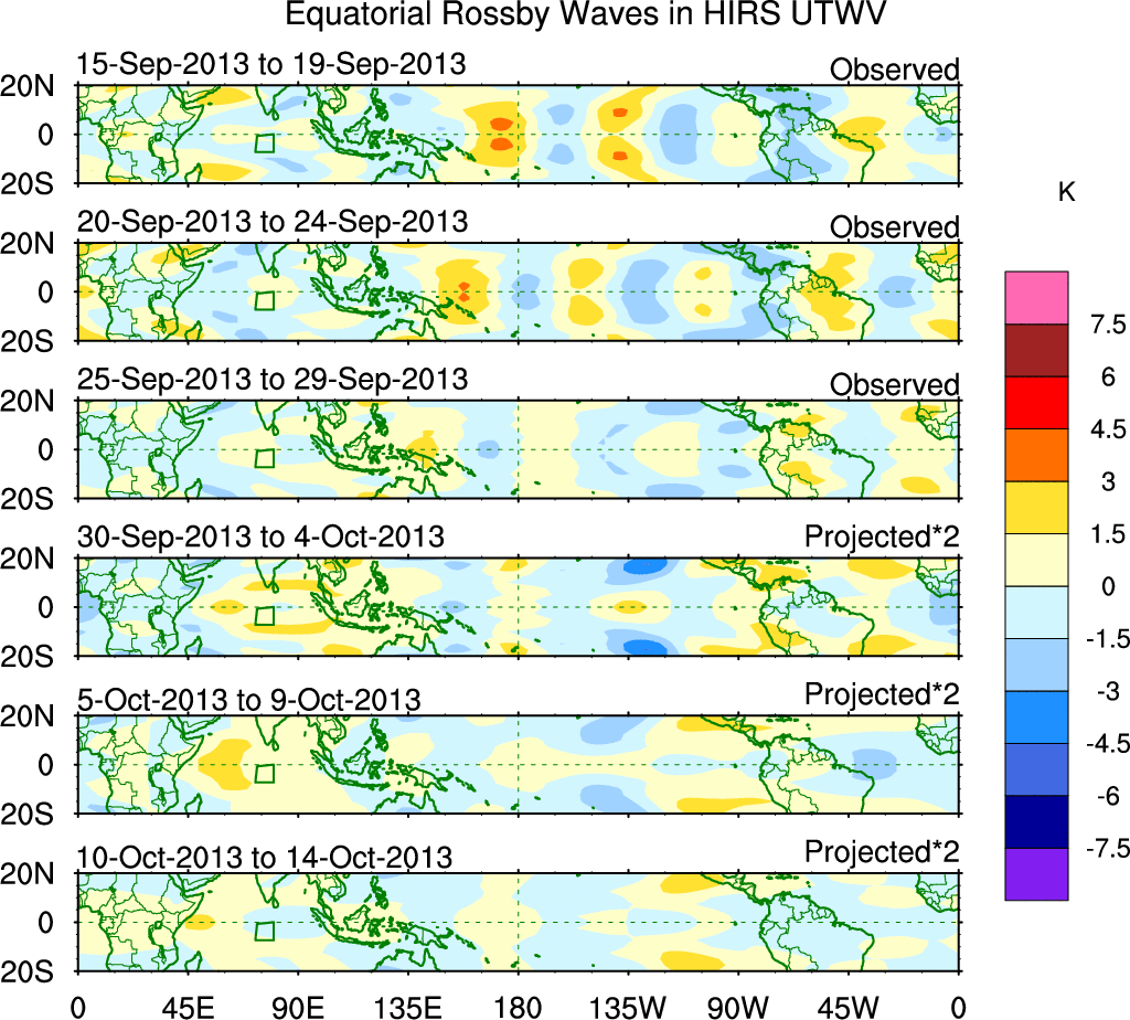 To identify tropical waves in near real-time, the OLR and UTWV data are filtered following Wheeler & Weickmann (2001 MWR). The daily anomalies are calculated using the first 3 harmonics of the seasonal cycle for 1979–2009. Missing values are then filled using linear interpolation in space and time. The most recent 365 days of anomalies are padded with 659 days of zeroes, and the result is filtered for each wave type.