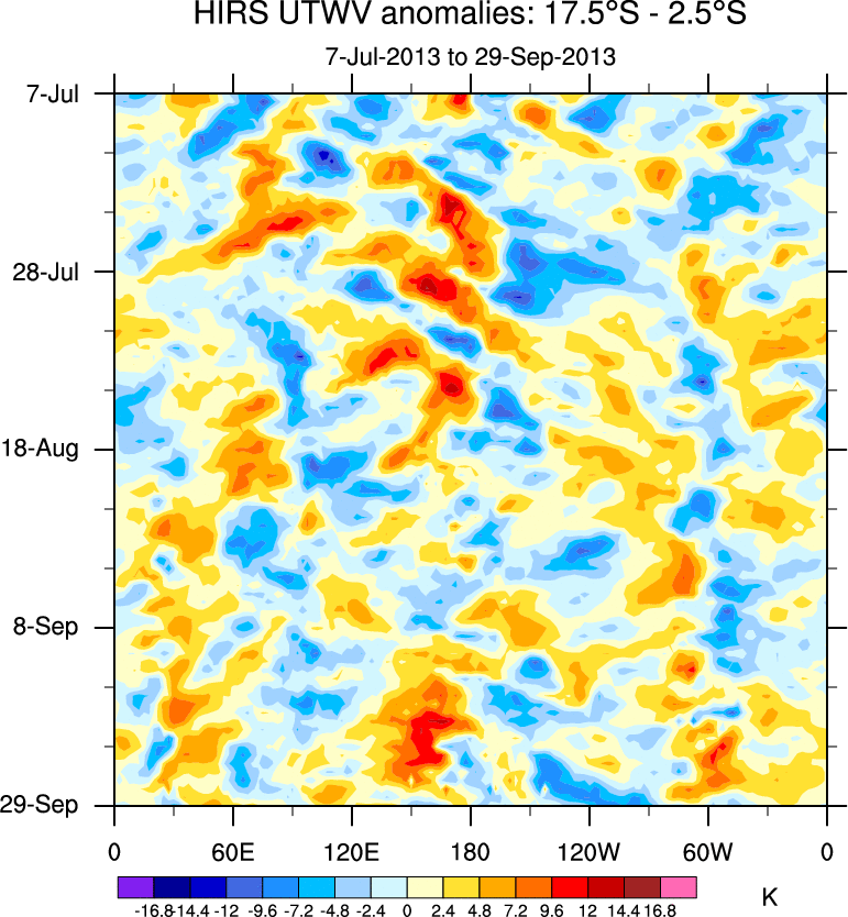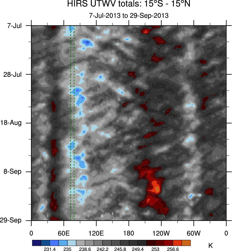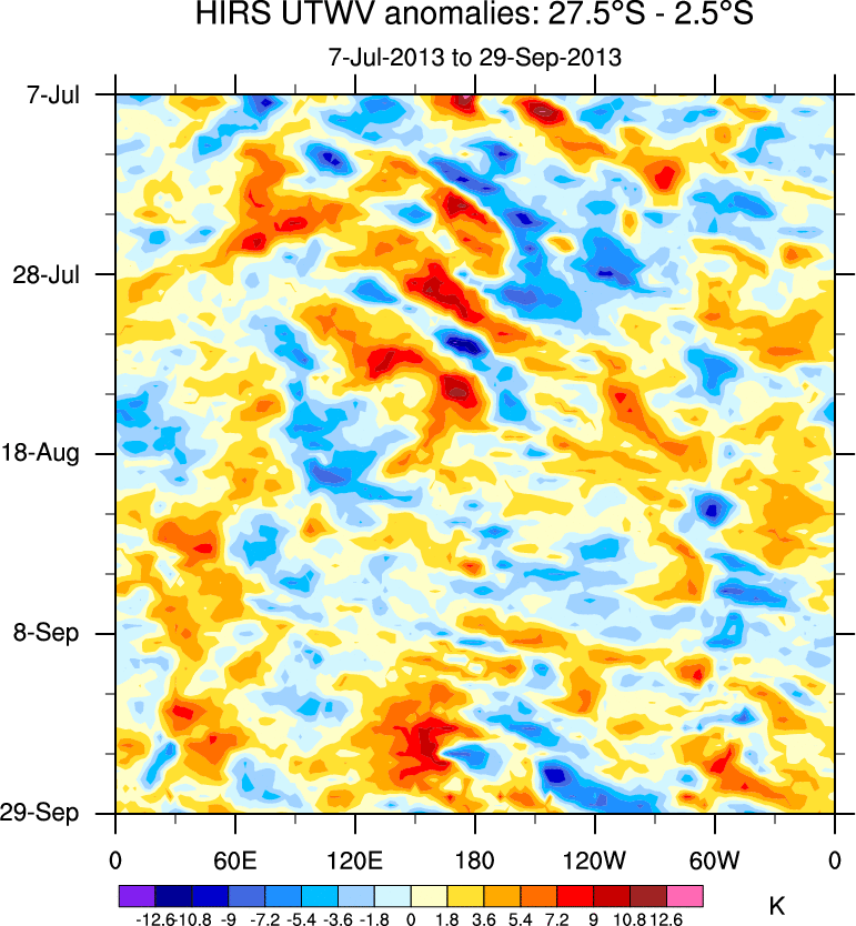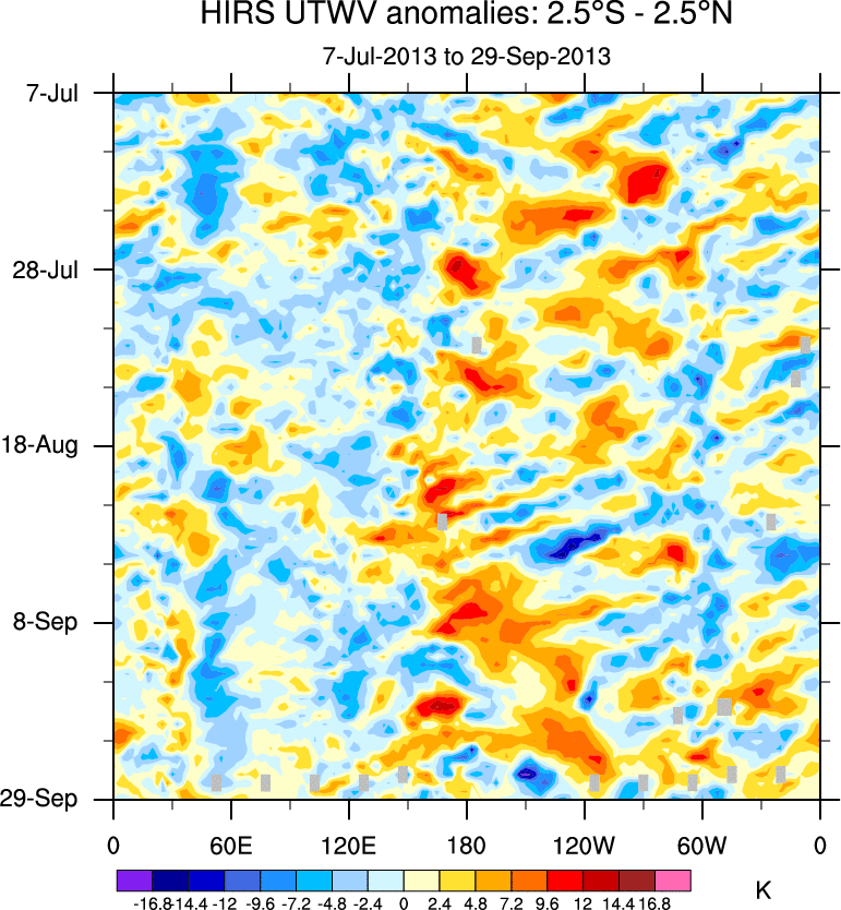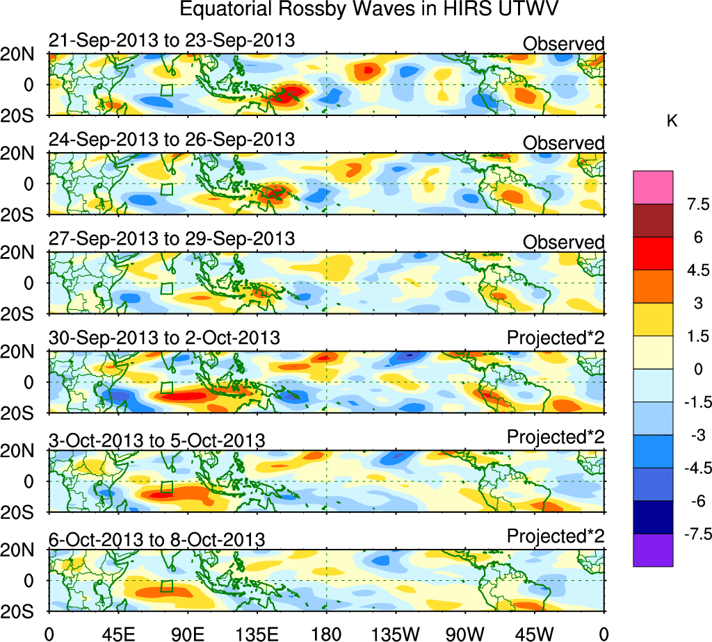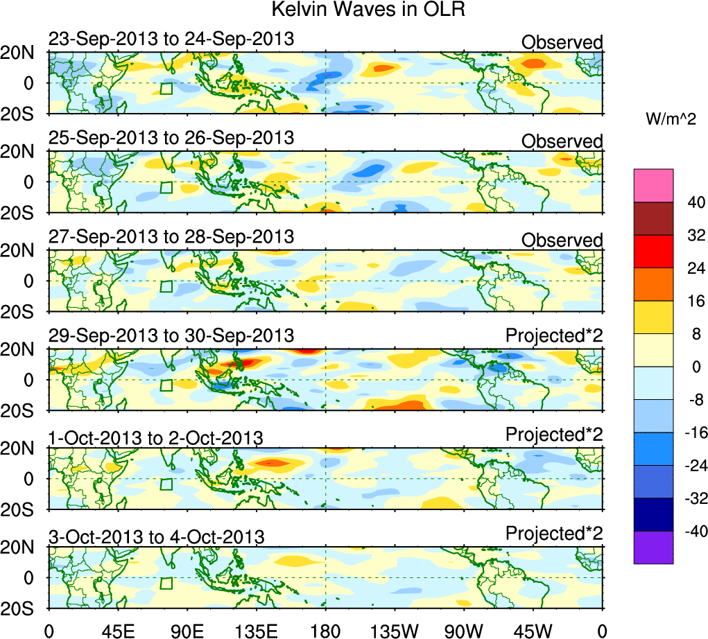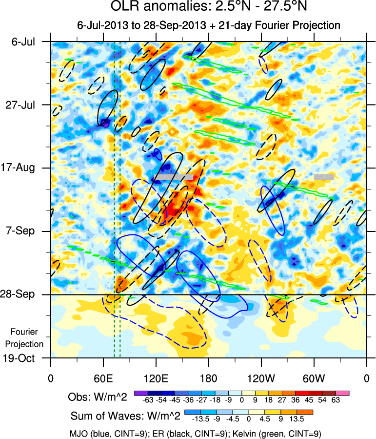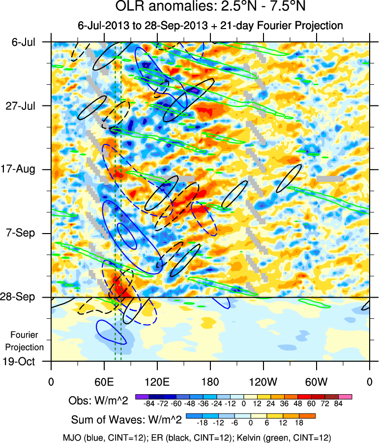 To identify tropical waves in near real-time, the OLR and UTWV data are filtered following Wheeler & Weickmann (2001 MWR). The daily anomalies are calculated using the first 3 harmonics of the seasonal cycle for 1979–2009. Missing values are then filled using linear interpolation in space and time. The most recent 365 days of anomalies are padded with 659 days of zeroes, and the result is filtered for each wave type.
