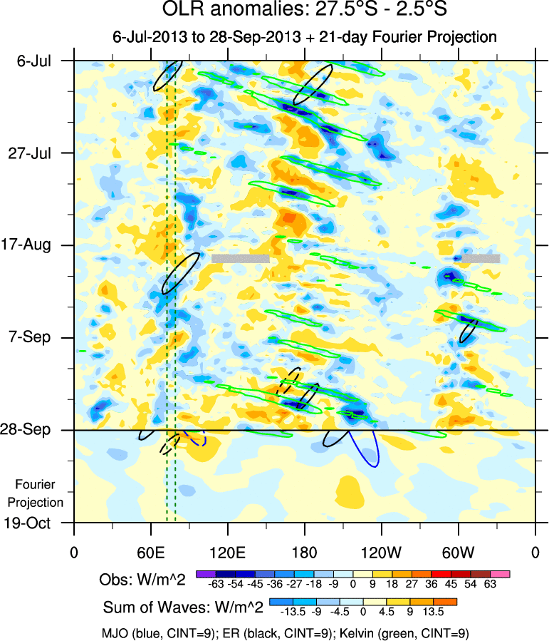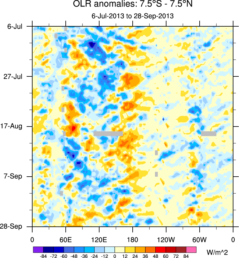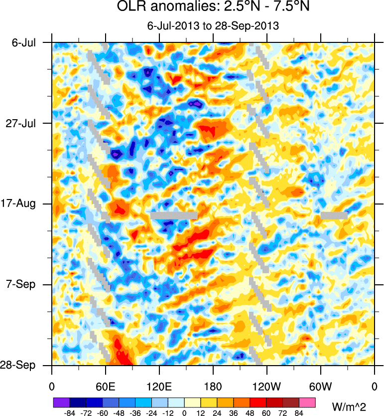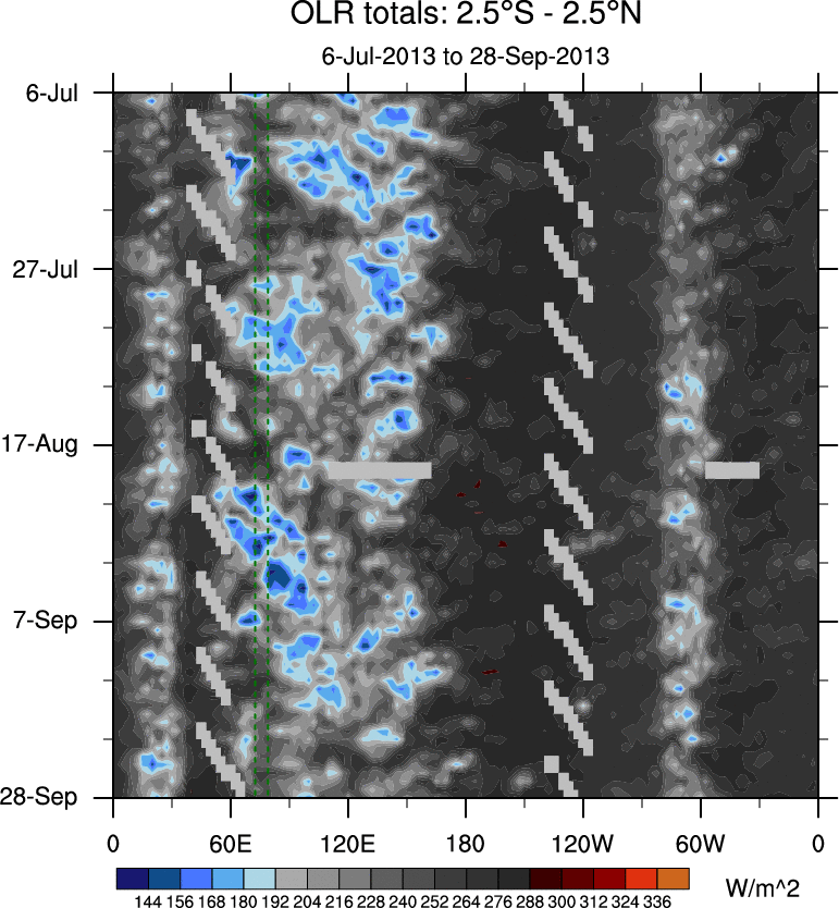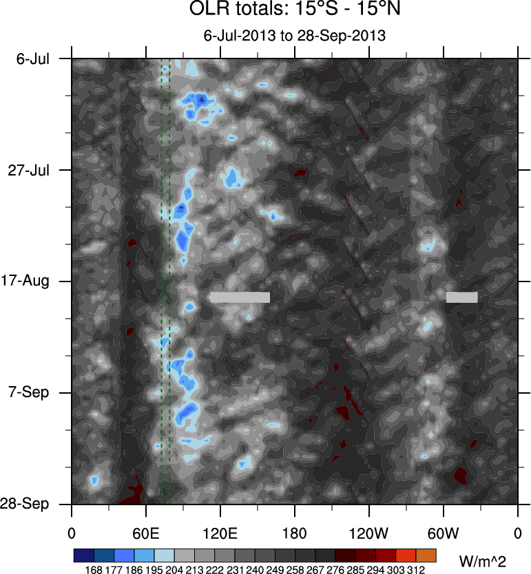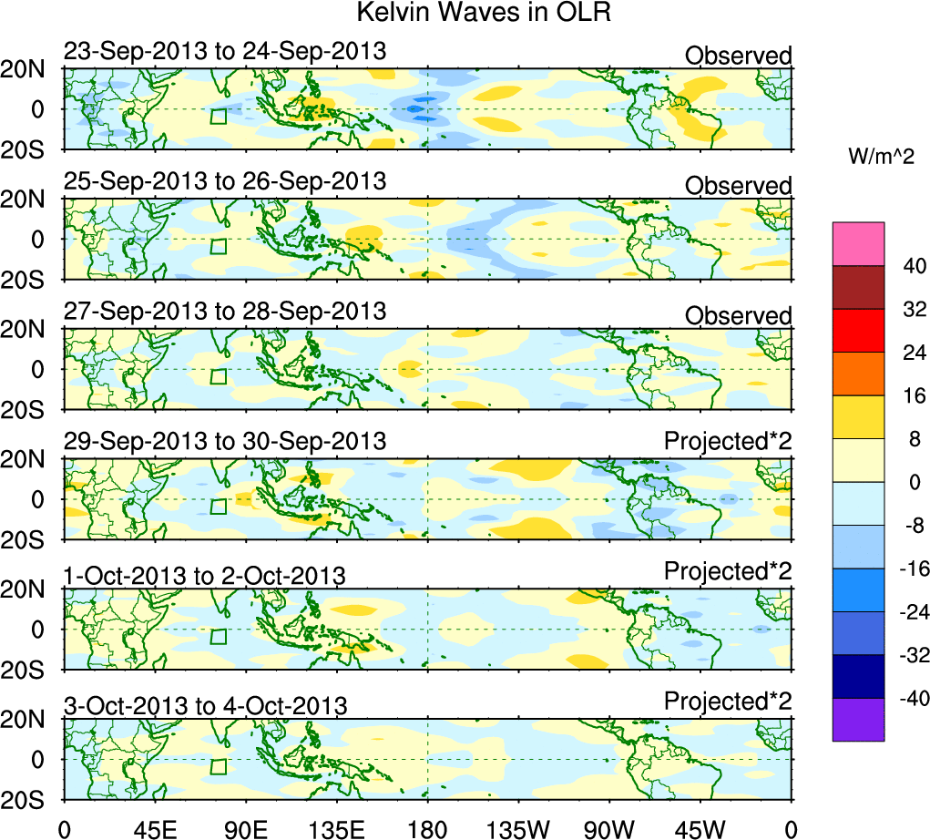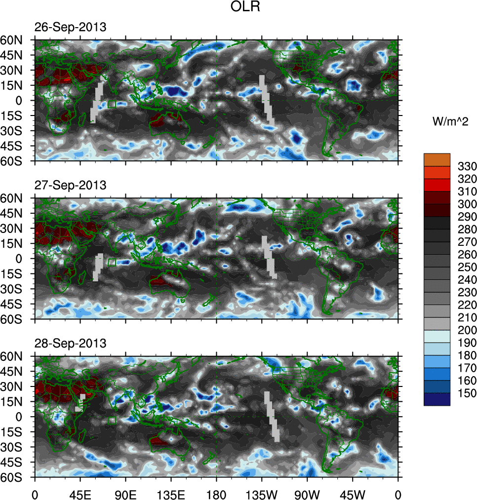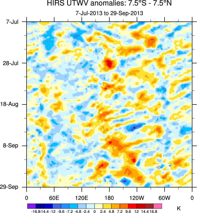 To identify tropical waves in near real-time, the OLR and UTWV data are filtered following Wheeler & Weickmann (2001 MWR). The daily anomalies are calculated using the first 3 harmonics of the seasonal cycle for 1979–2009. Missing values are then filled using linear interpolation in space and time. The most recent 365 days of anomalies are padded with 659 days of zeroes, and the result is filtered for each wave type.