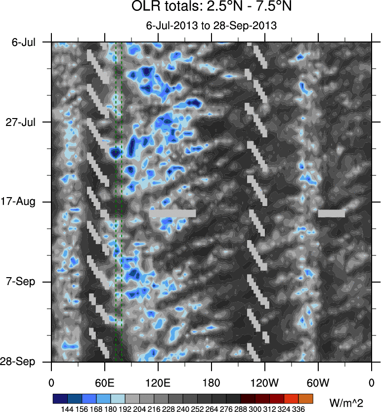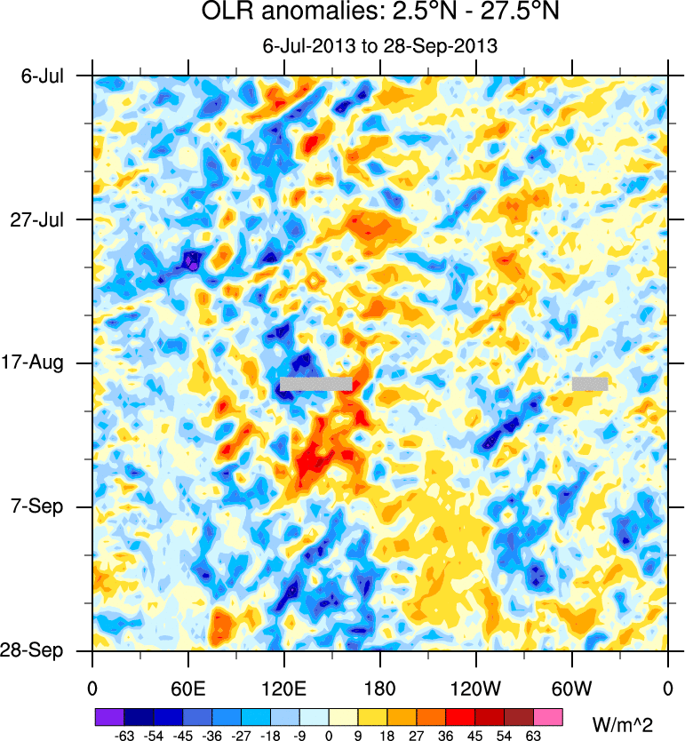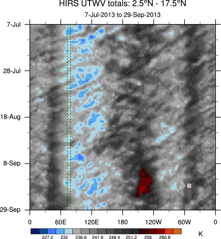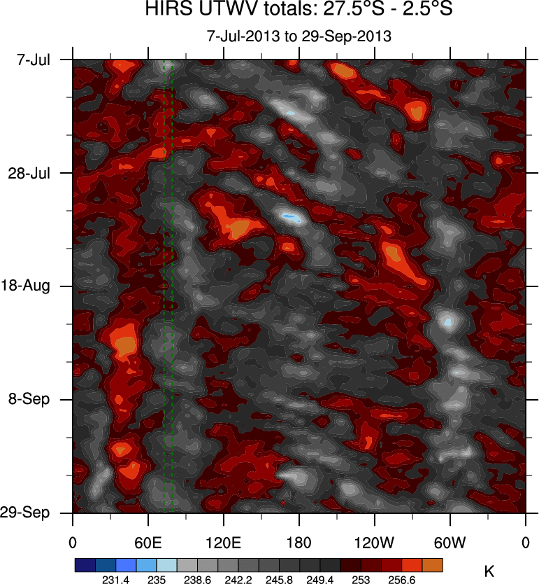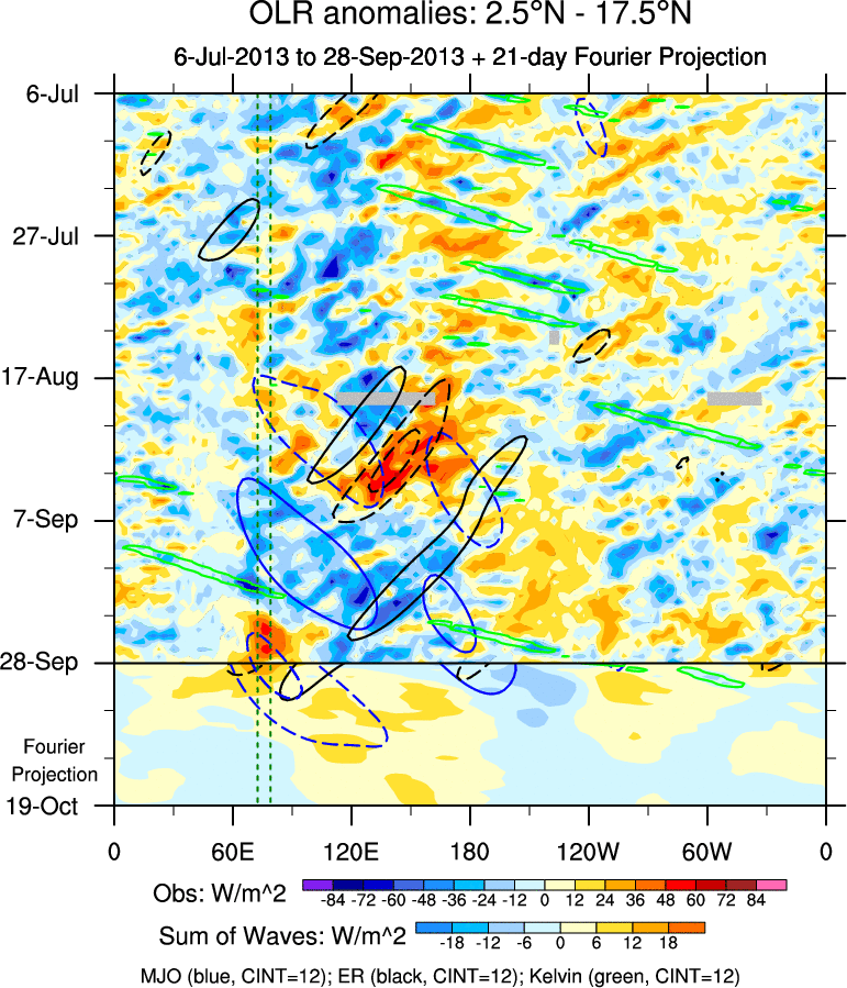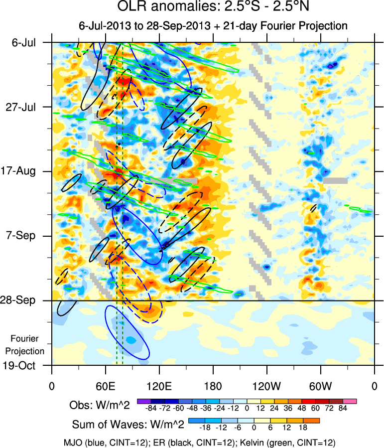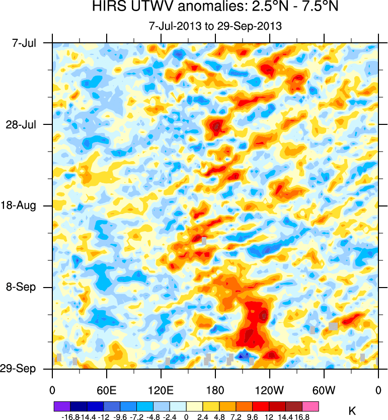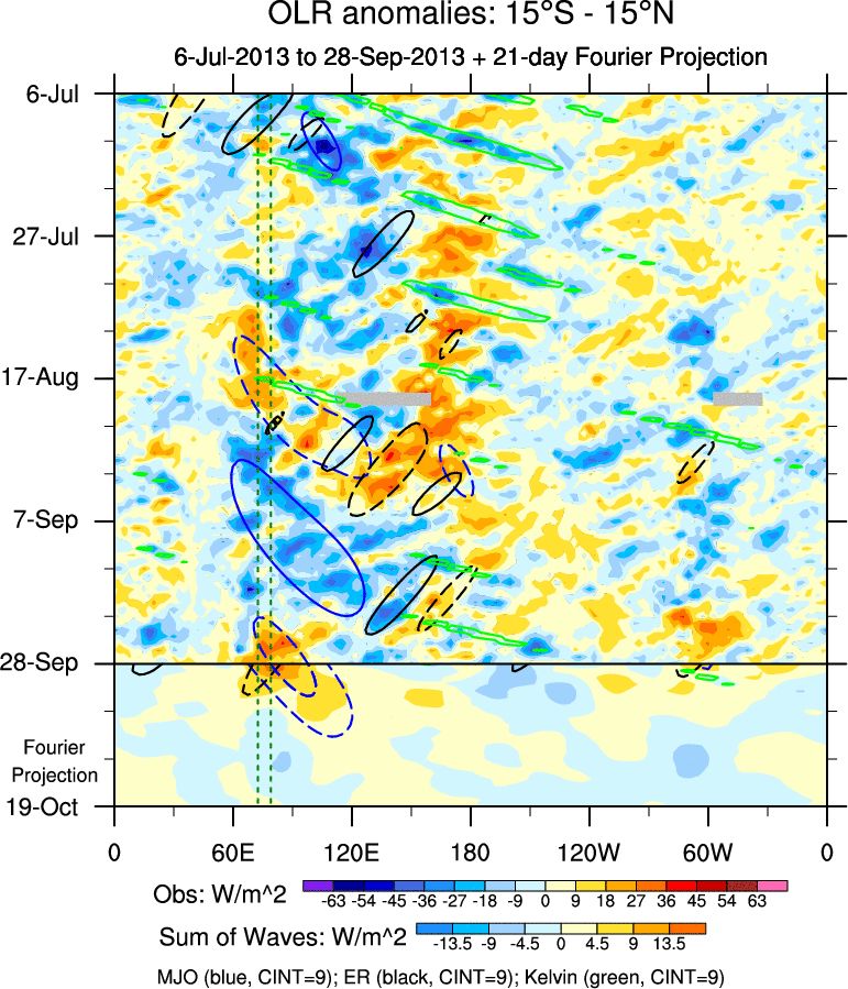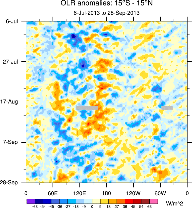 To identify tropical waves in near real-time, the OLR and UTWV data are filtered following Wheeler & Weickmann (2001 MWR). The daily anomalies are calculated using the first 3 harmonics of the seasonal cycle for 1979–2009. Missing values are then filled using linear interpolation in space and time. The most recent 365 days of anomalies are padded with 659 days of zeroes, and the result is filtered for each wave type.