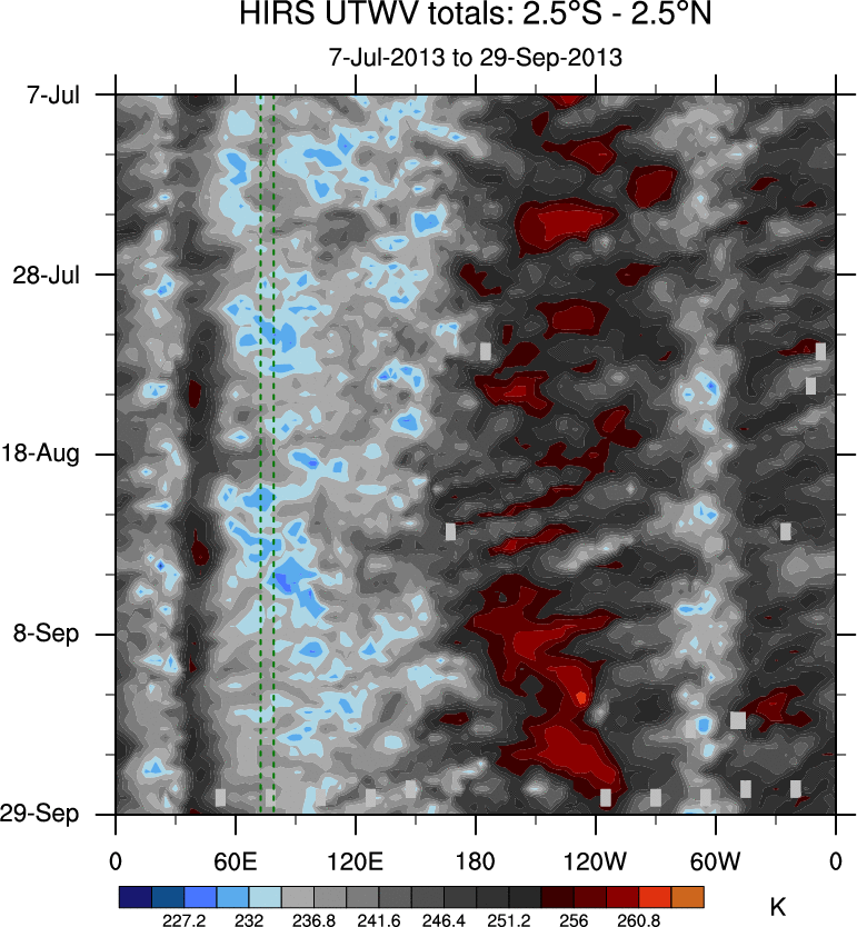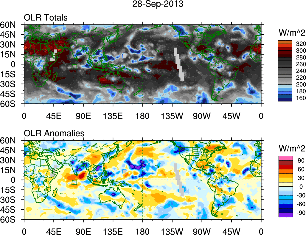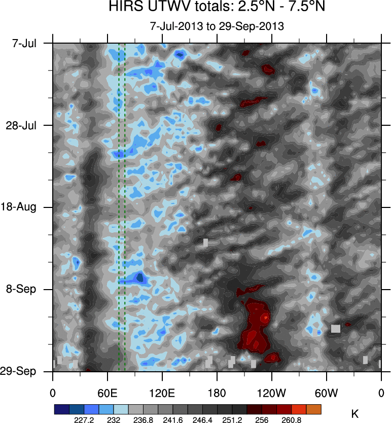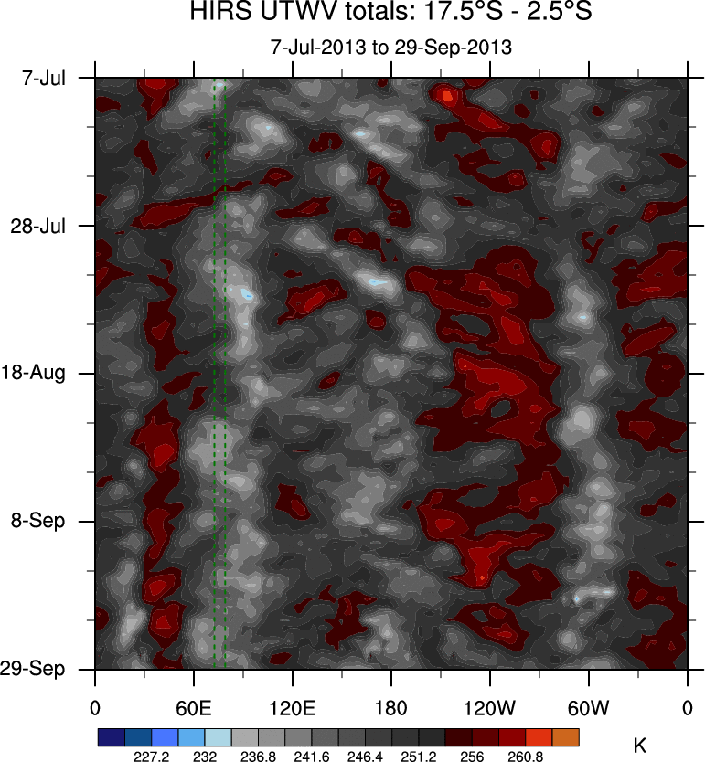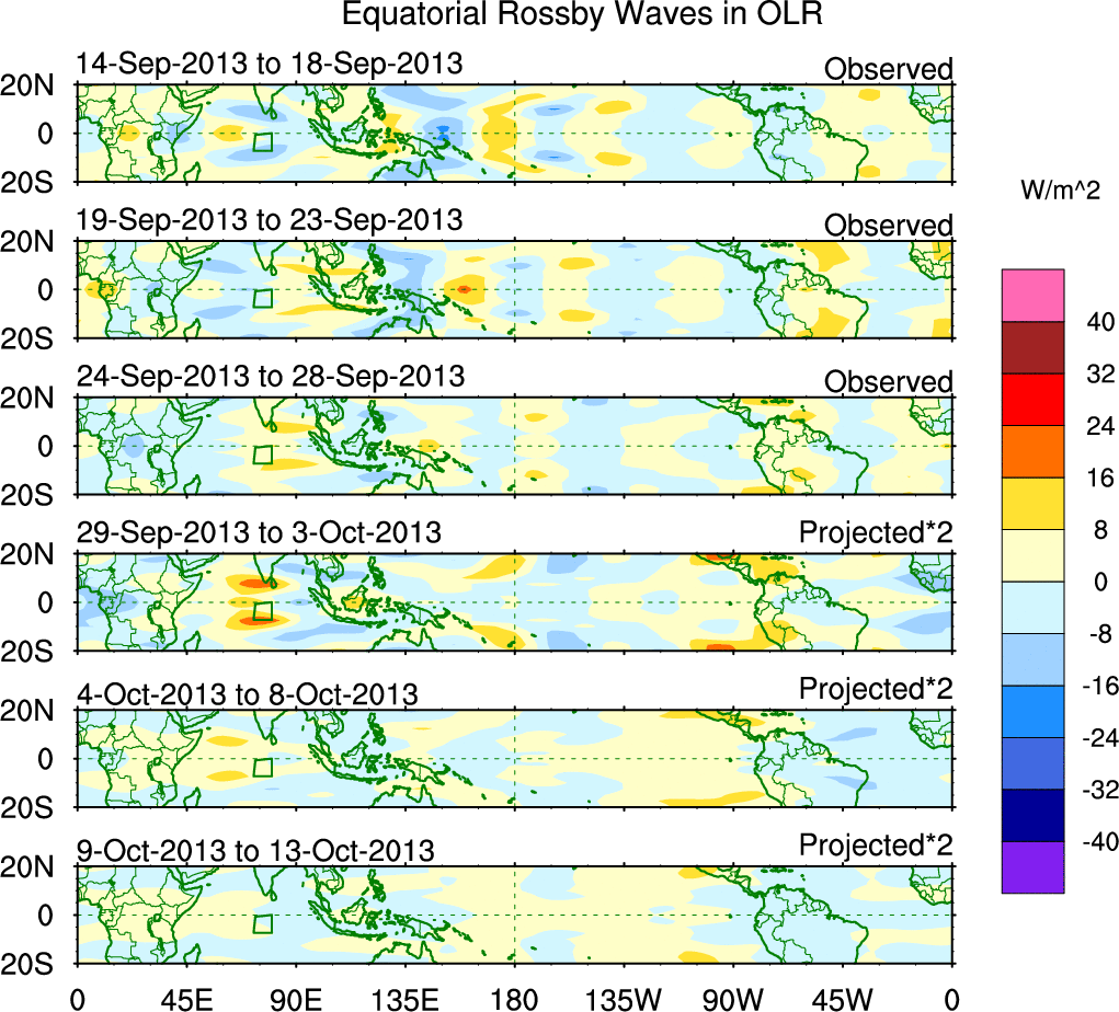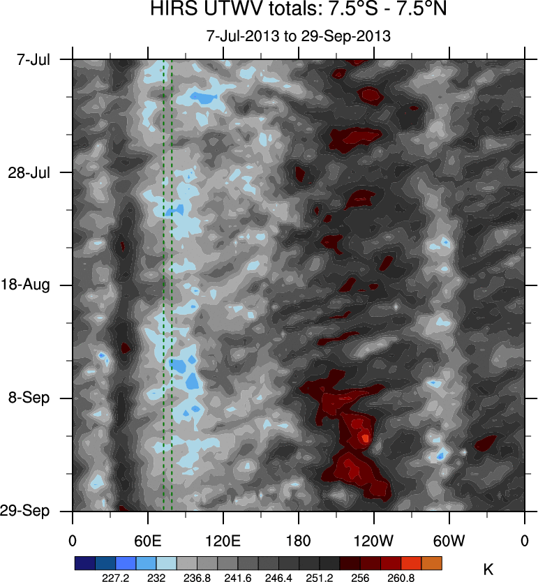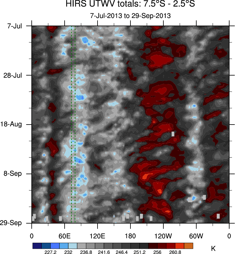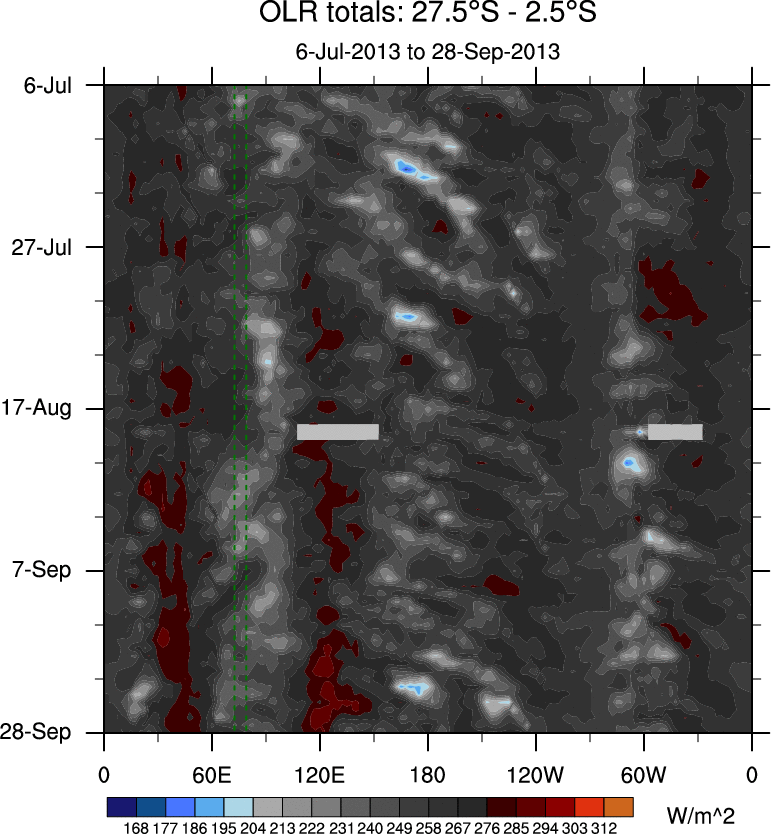 To identify tropical waves in near real-time, the OLR and UTWV data are filtered following Wheeler & Weickmann (2001 MWR). The daily anomalies are calculated using the first 3 harmonics of the seasonal cycle for 1979–2009. Missing values are then filled using linear interpolation in space and time. The most recent 365 days of anomalies are padded with 659 days of zeroes, and the result is filtered for each wave type.