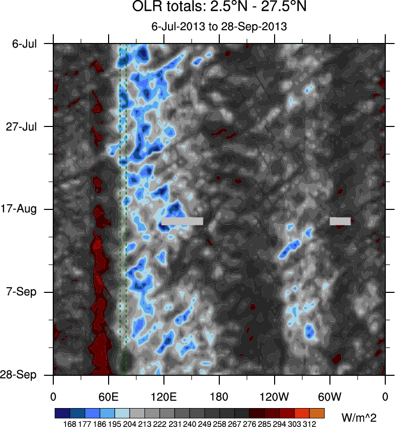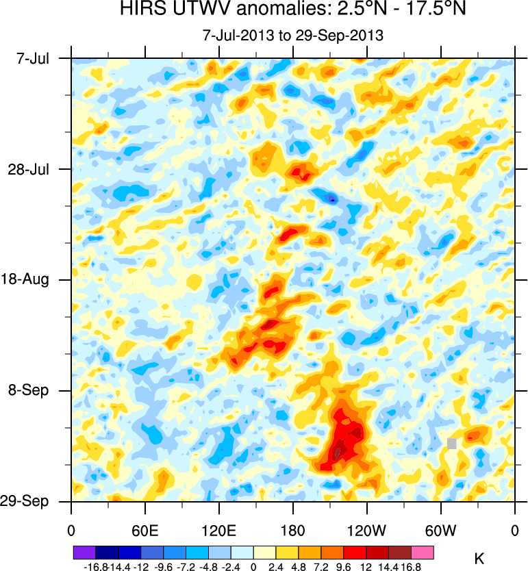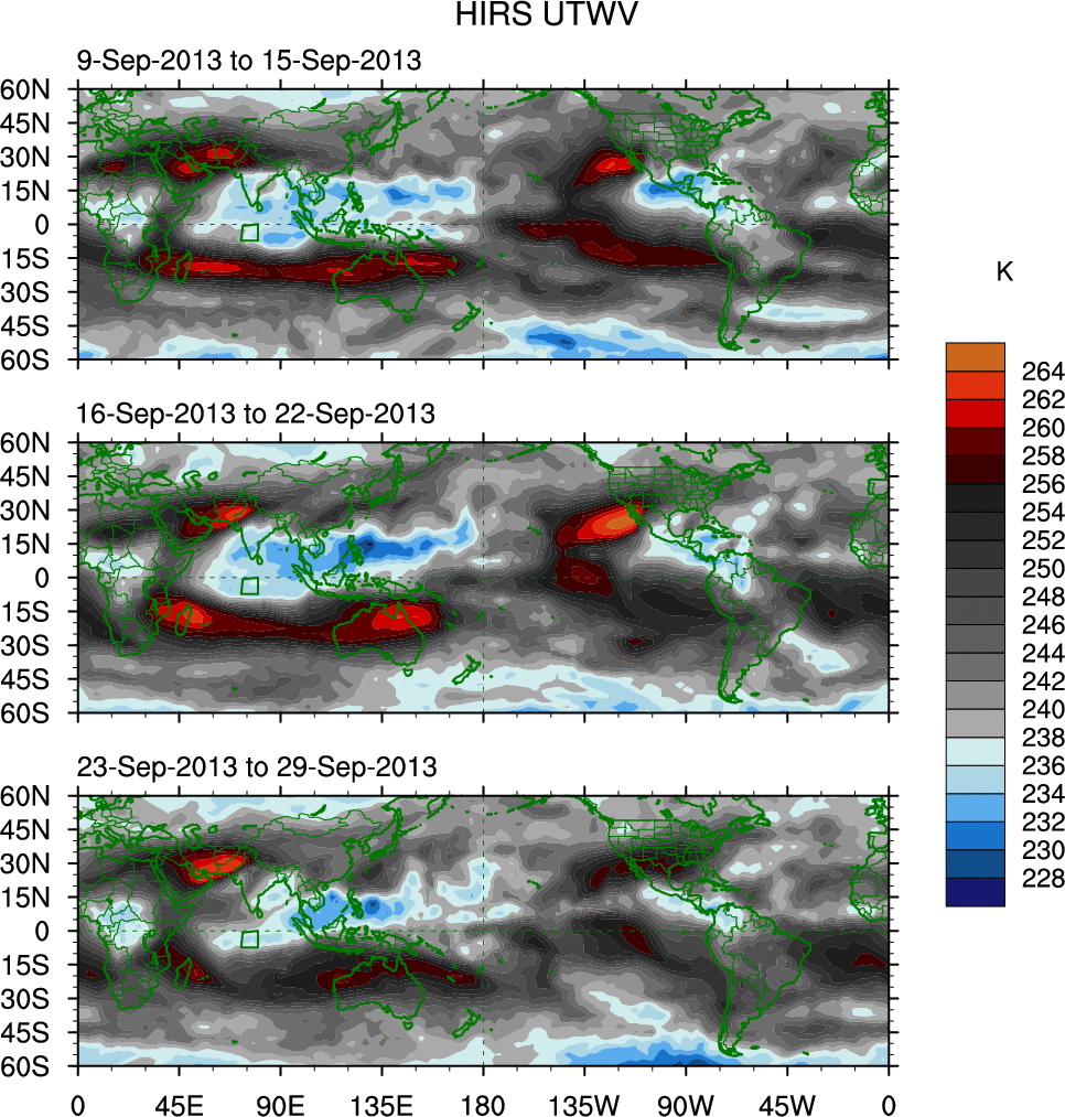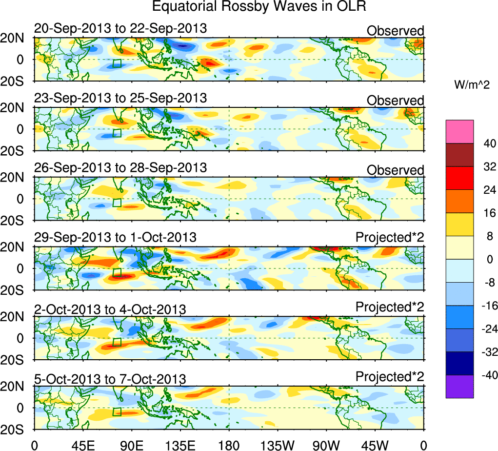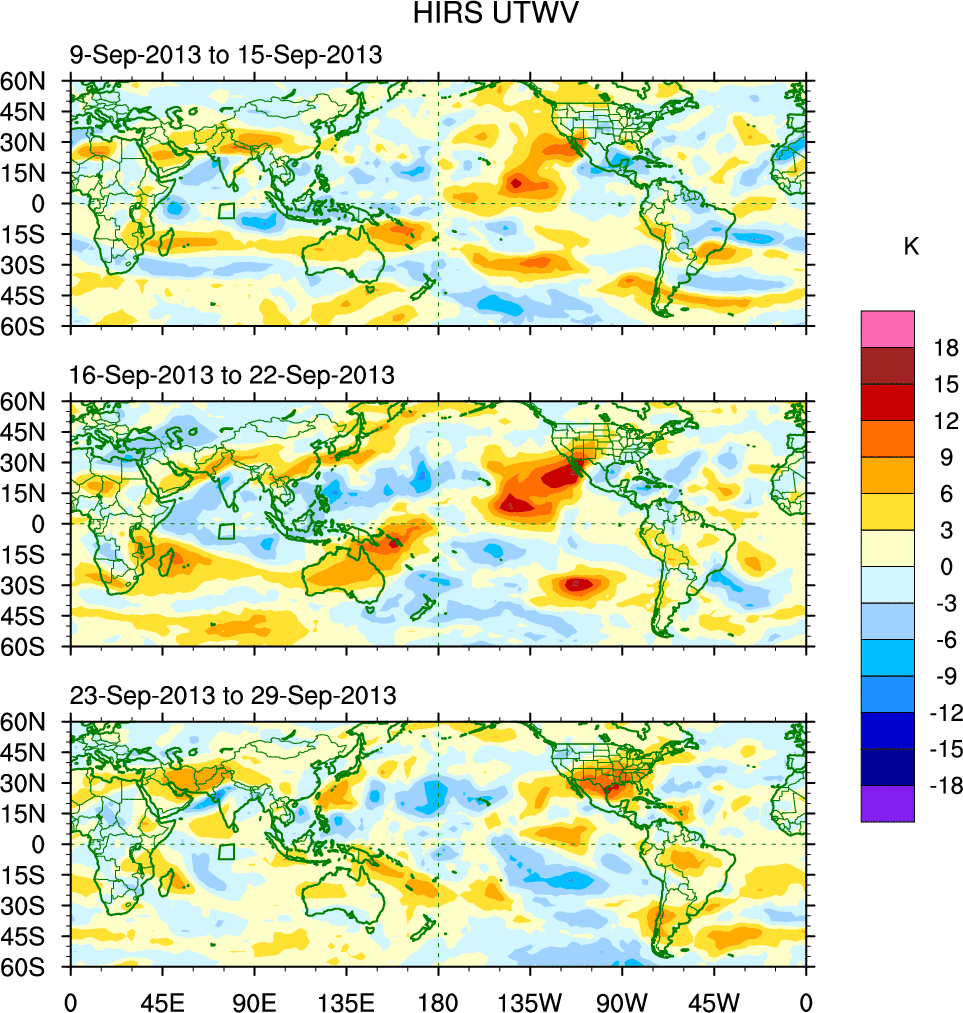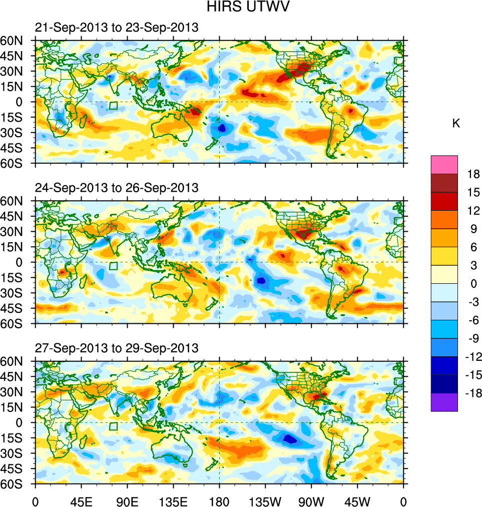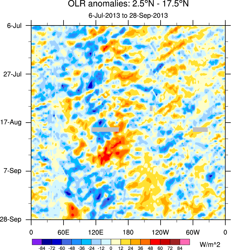 To identify tropical waves in near real-time, the OLR and UTWV data are filtered following Wheeler & Weickmann (2001 MWR). The daily anomalies are calculated using the first 3 harmonics of the seasonal cycle for 1979–2009. Missing values are then filled using linear interpolation in space and time. The most recent 365 days of anomalies are padded with 659 days of zeroes, and the result is filtered for each wave type.