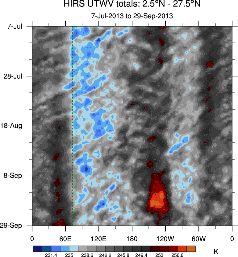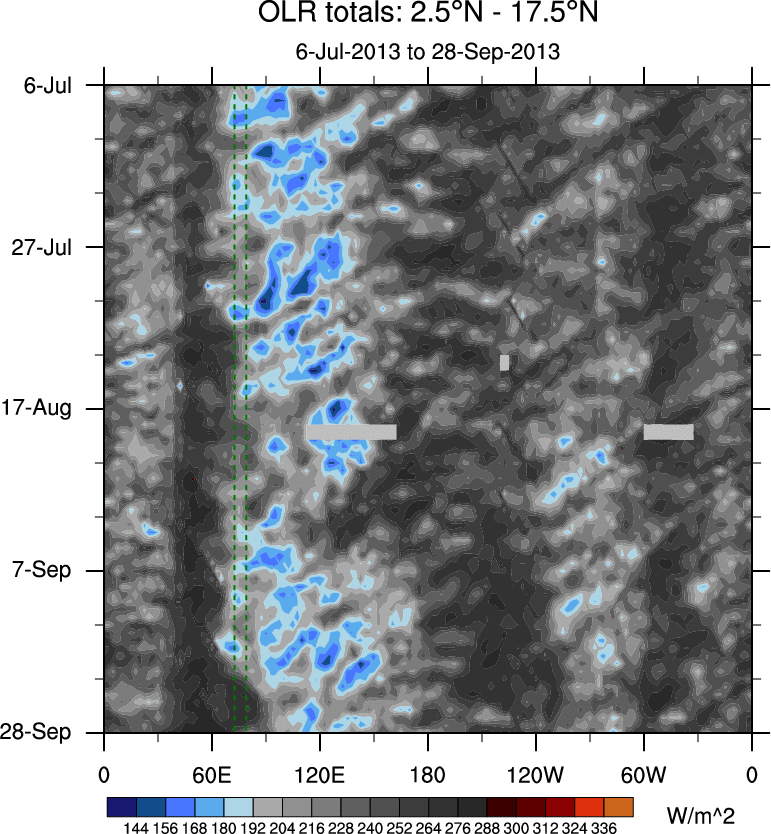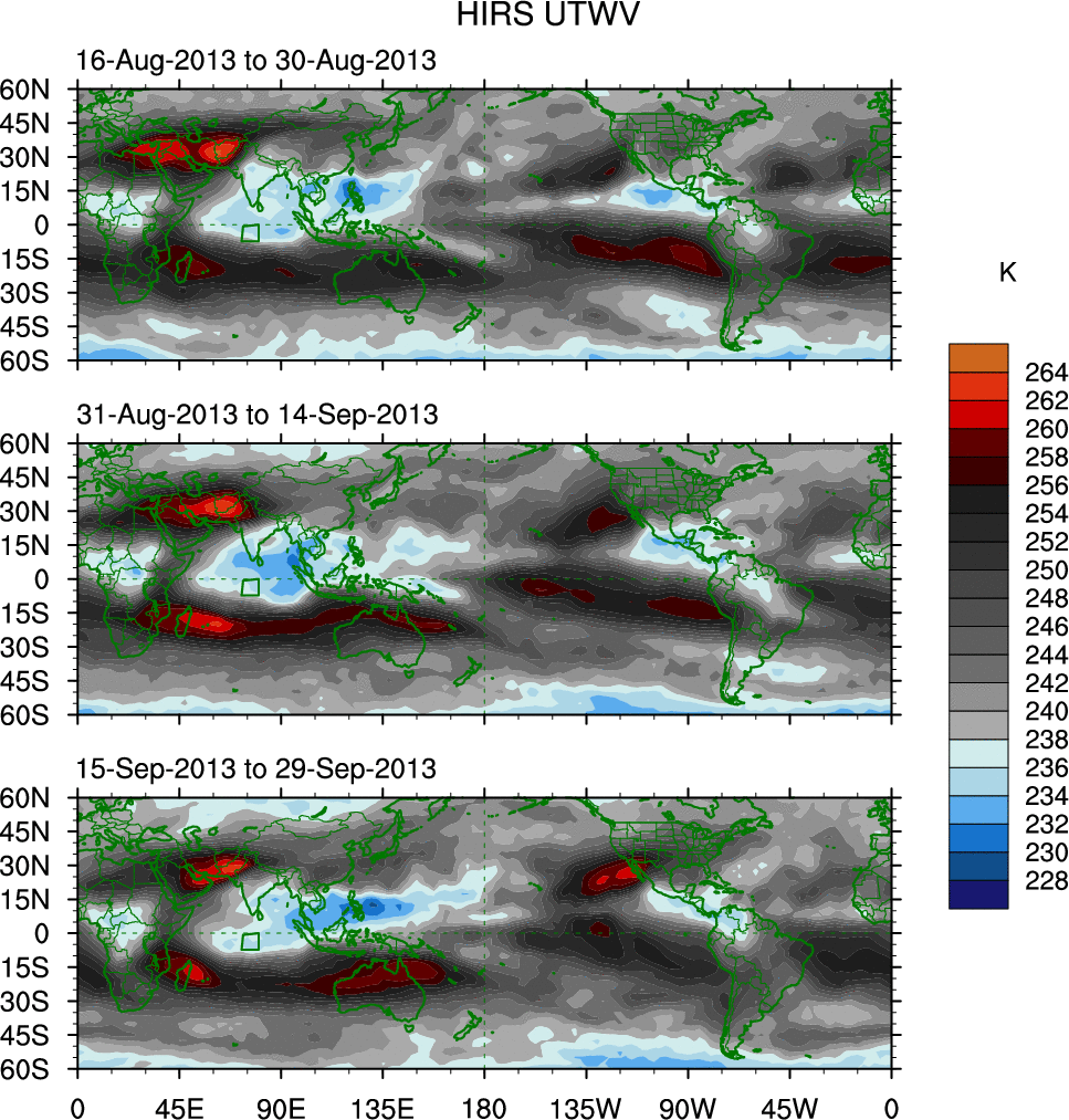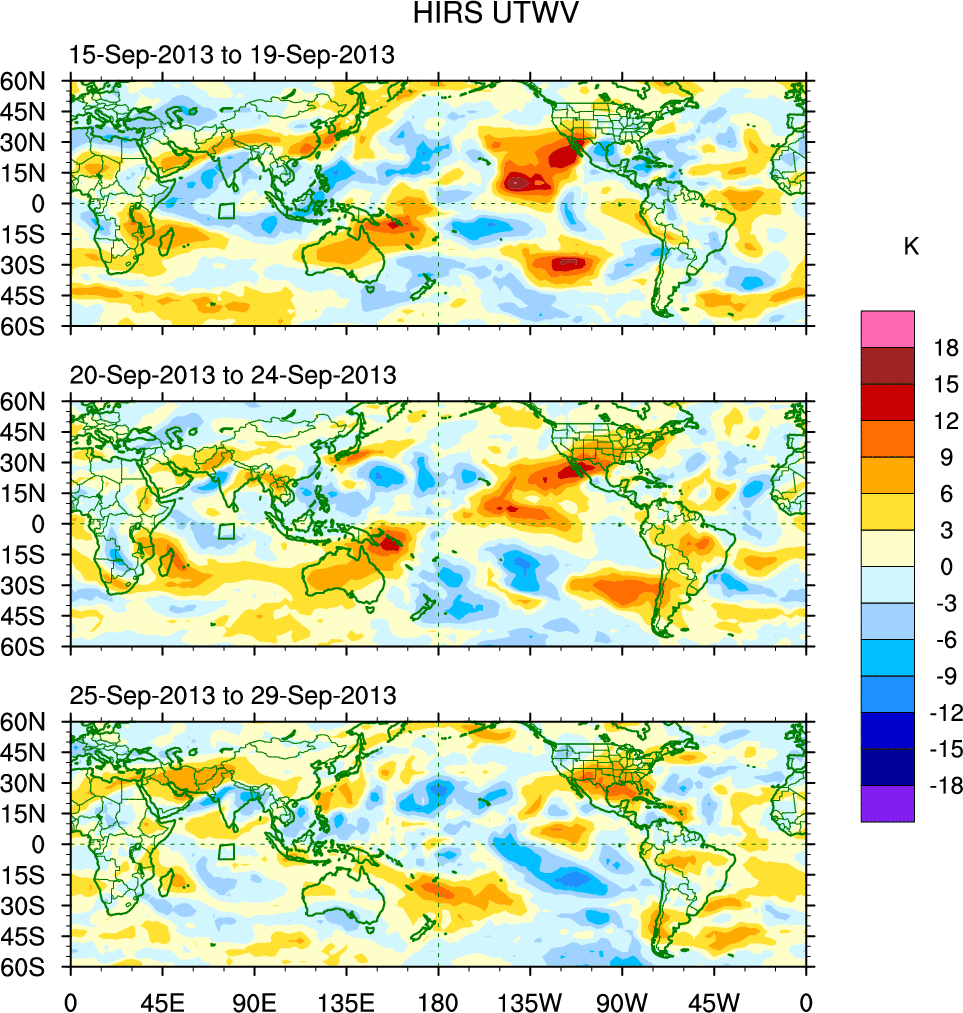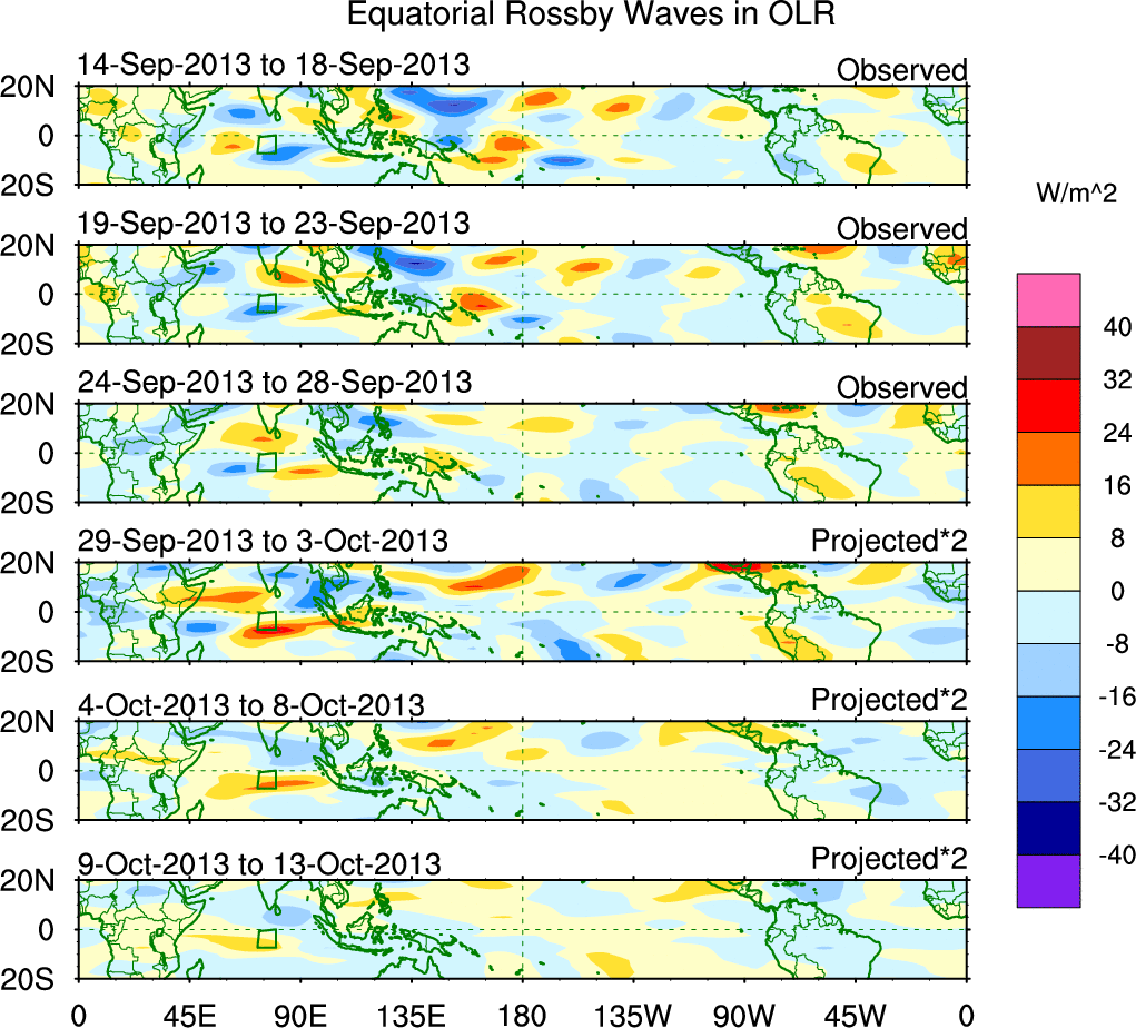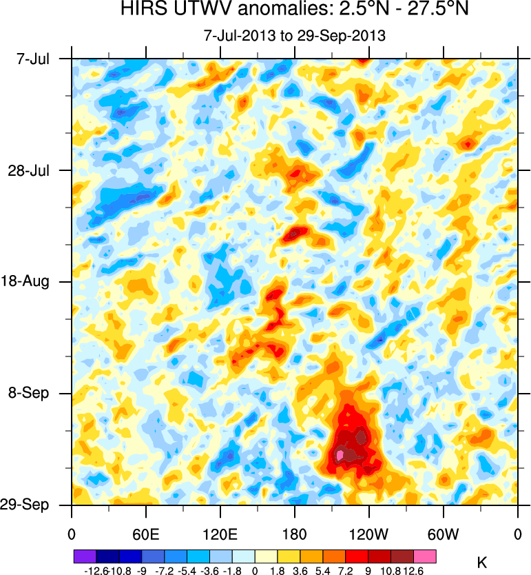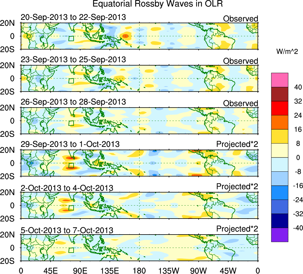 To identify tropical waves in near real-time, the OLR and UTWV data are filtered following Wheeler & Weickmann (2001 MWR). The daily anomalies are calculated using the first 3 harmonics of the seasonal cycle for 1979–2009. Missing values are then filled using linear interpolation in space and time. The most recent 365 days of anomalies are padded with 659 days of zeroes, and the result is filtered for each wave type.