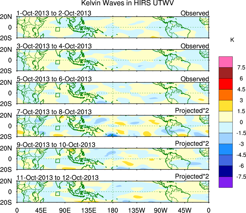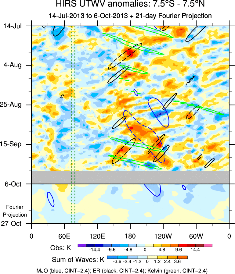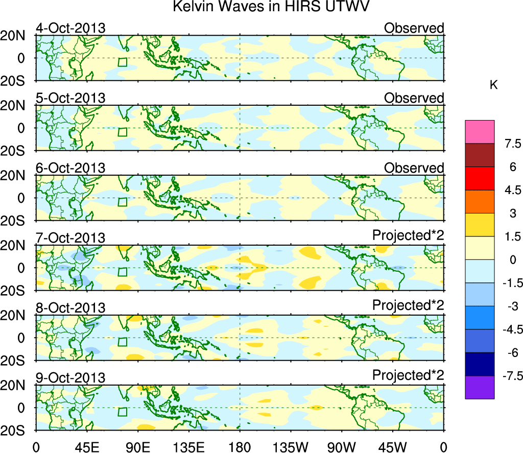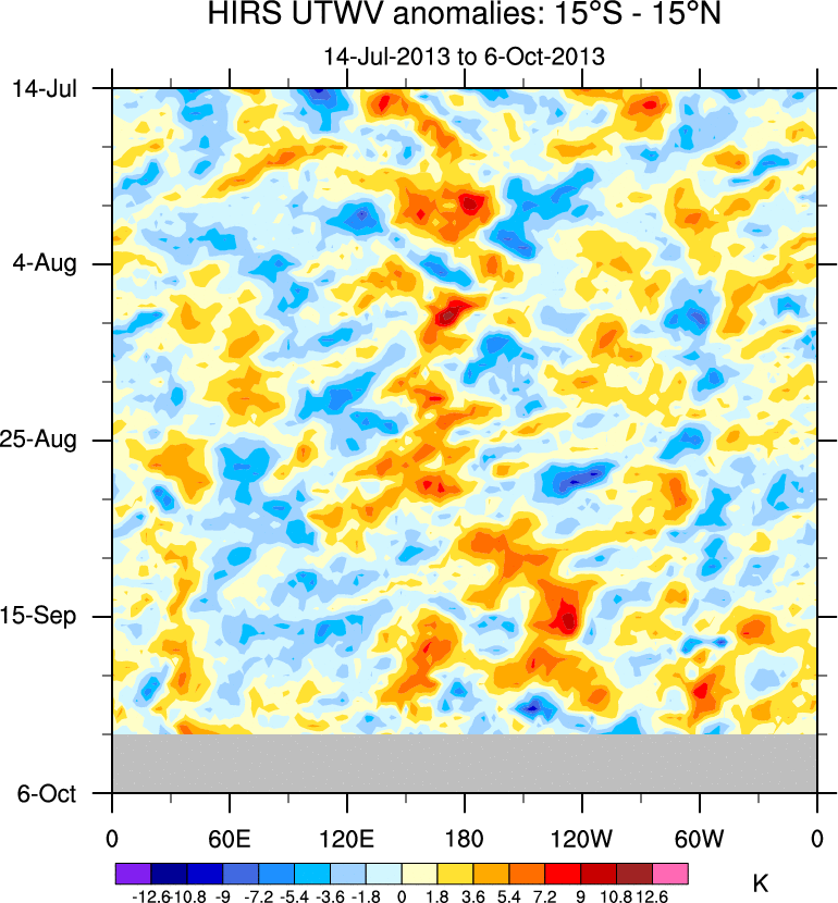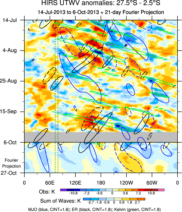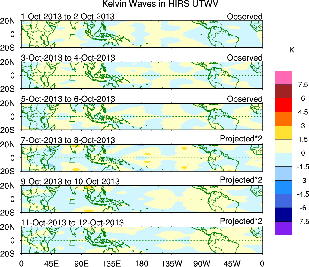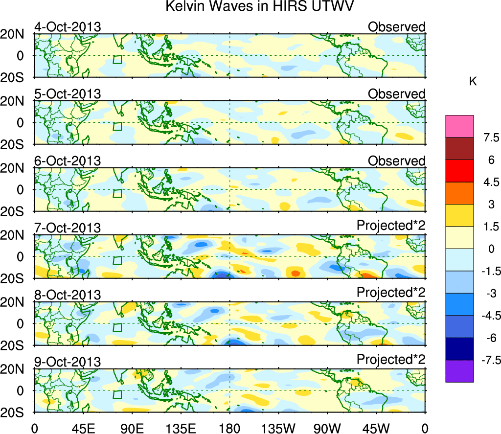 To identify tropical waves in near real-time, the OLR and UTWV data are filtered following Wheeler & Weickmann (2001 MWR). The daily anomalies are calculated using the first 3 harmonics of the seasonal cycle for 1979–2009. Missing values are then filled using linear interpolation in space and time. The most recent 365 days of anomalies are padded with 659 days of zeroes, and the result is filtered for each wave type.