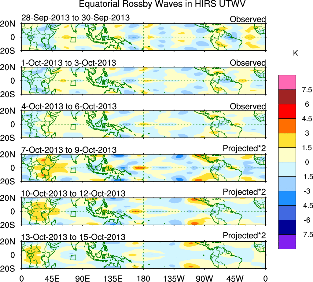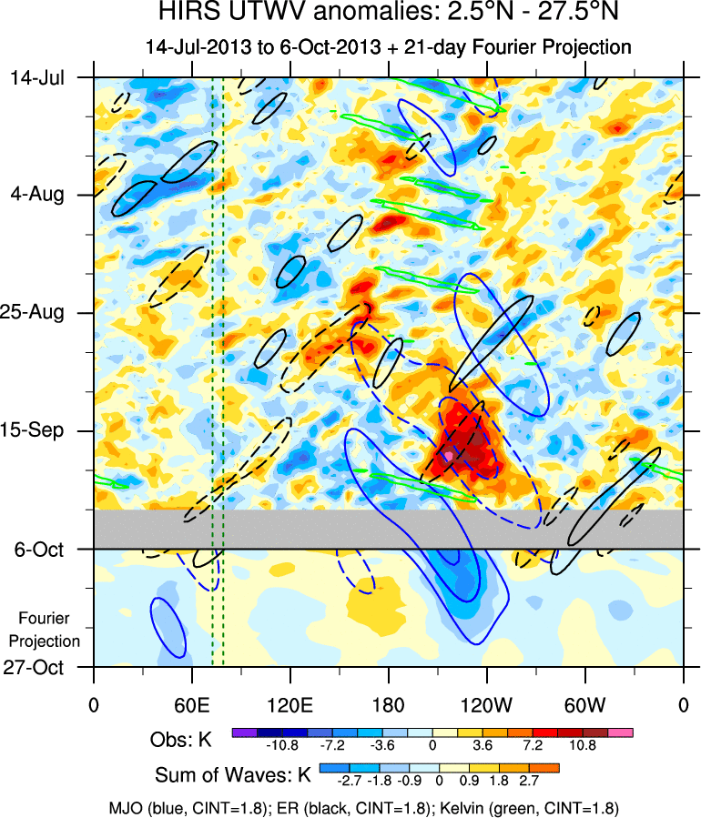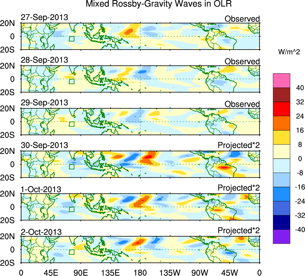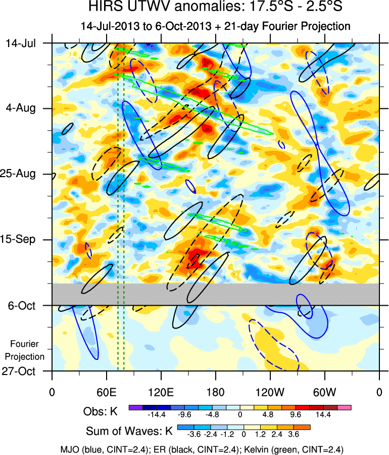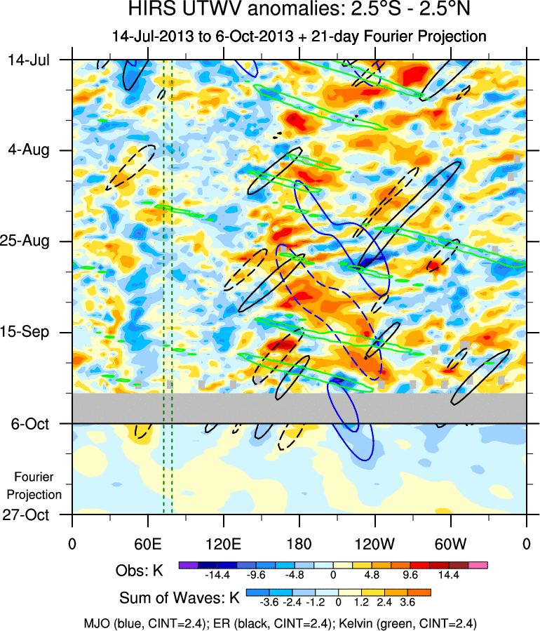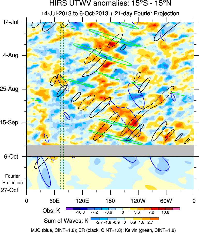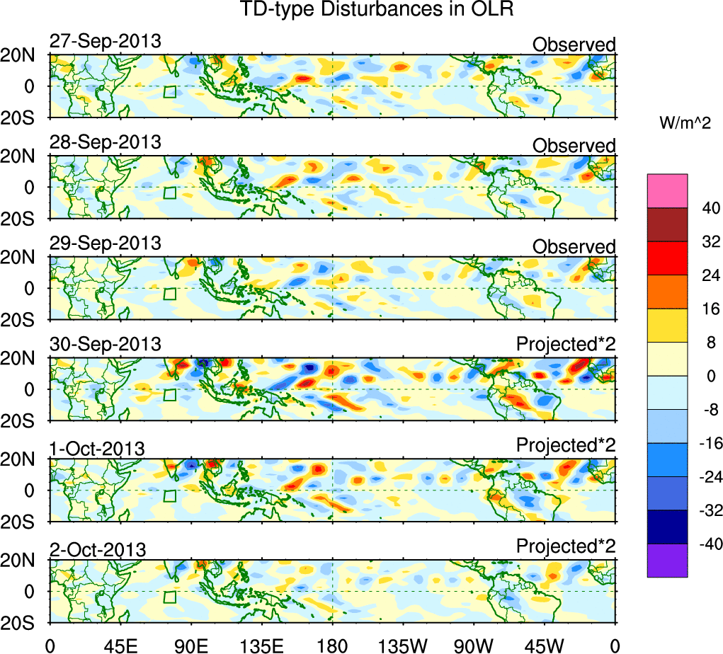 To identify tropical waves in near real-time, the OLR and UTWV data are filtered following Wheeler & Weickmann (2001 MWR). The daily anomalies are calculated using the first 3 harmonics of the seasonal cycle for 1979–2009. Missing values are then filled using linear interpolation in space and time. The most recent 365 days of anomalies are padded with 659 days of zeroes, and the result is filtered for each wave type.