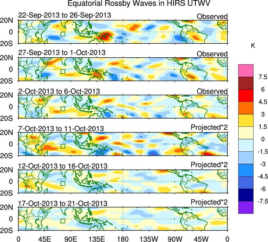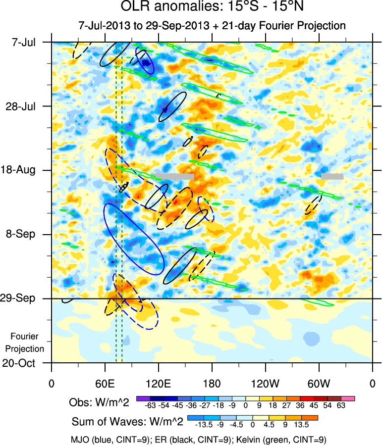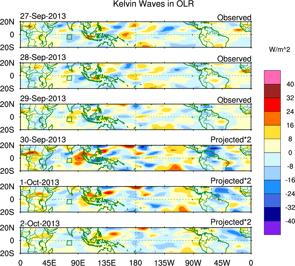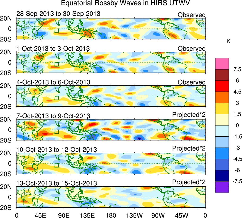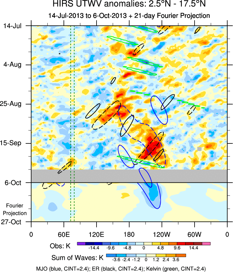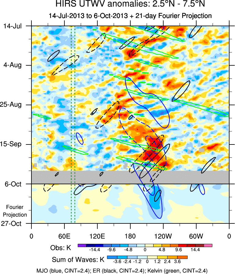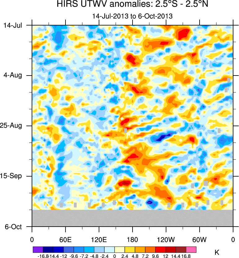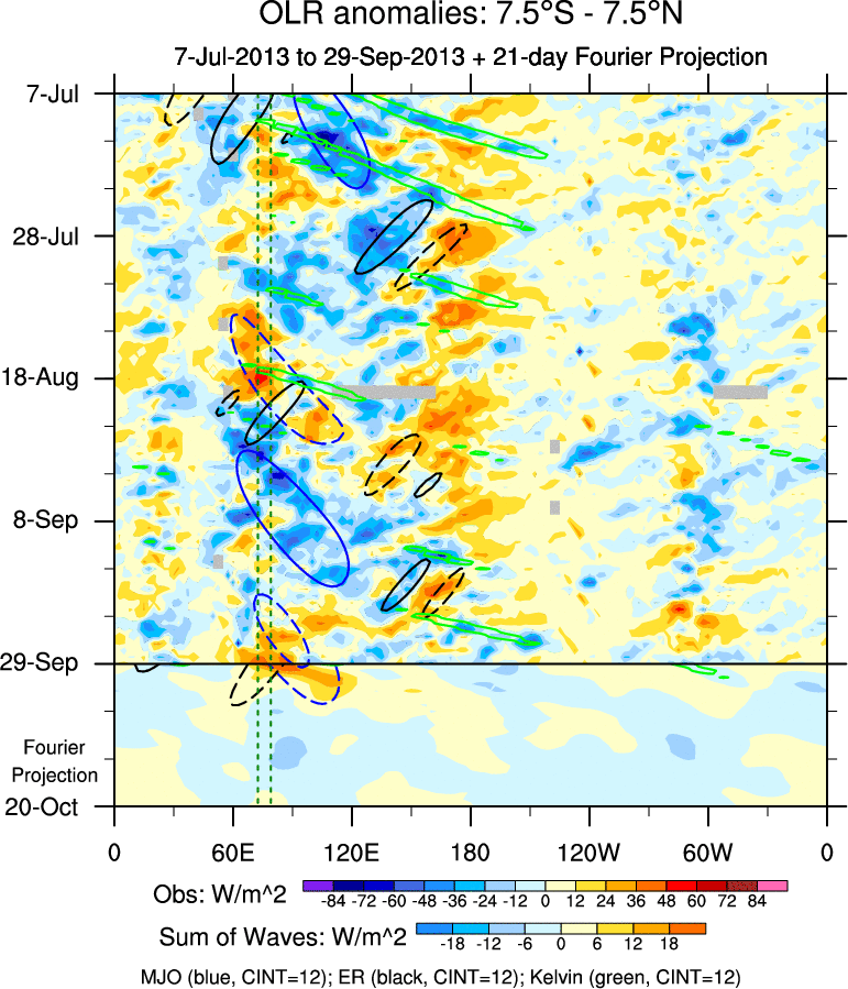 To identify tropical waves in near real-time, the OLR and UTWV data are filtered following Wheeler & Weickmann (2001 MWR). The daily anomalies are calculated using the first 3 harmonics of the seasonal cycle for 1979–2009. Missing values are then filled using linear interpolation in space and time. The most recent 365 days of anomalies are padded with 659 days of zeroes, and the result is filtered for each wave type.