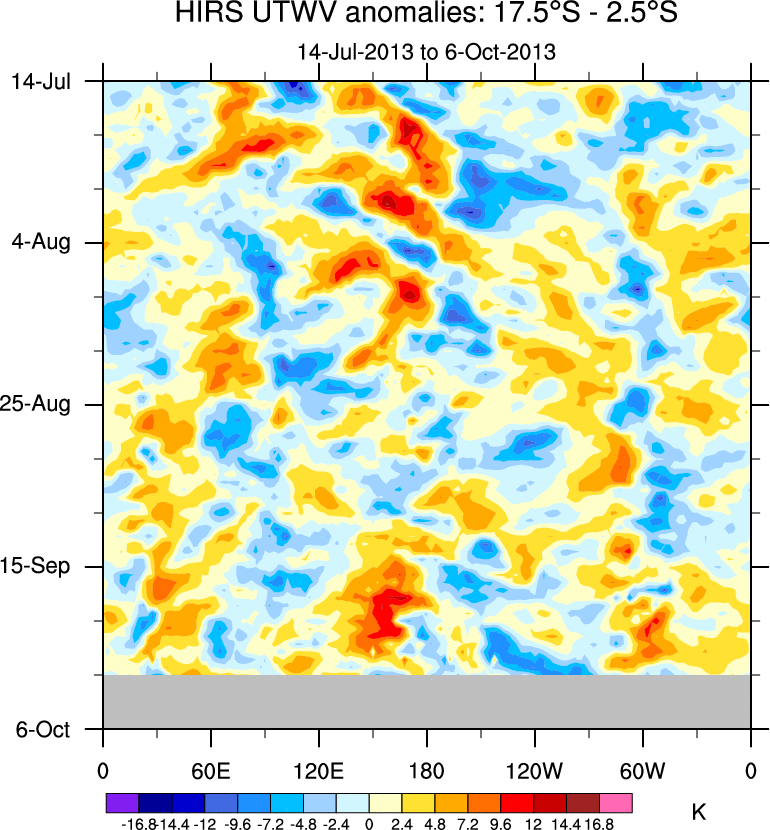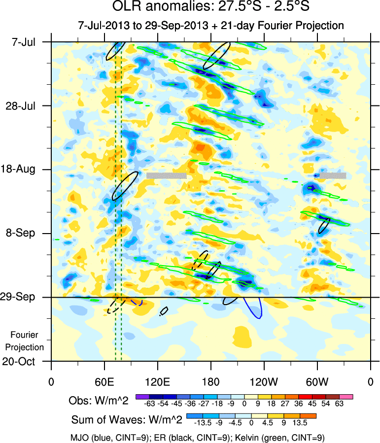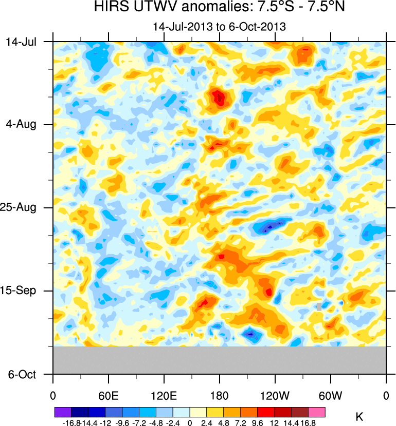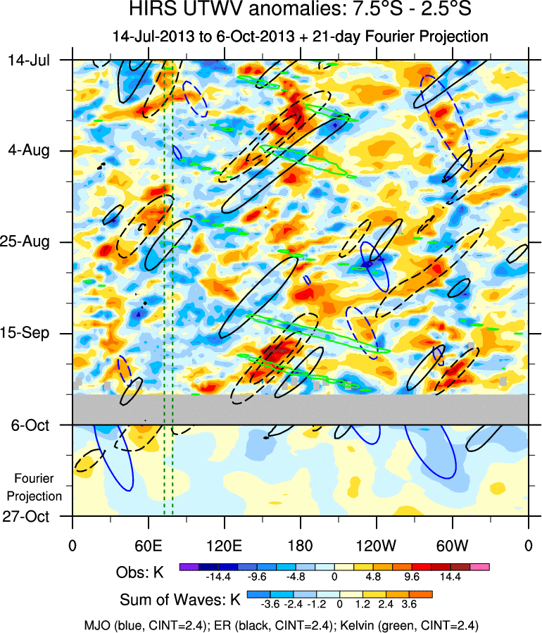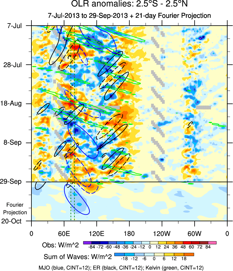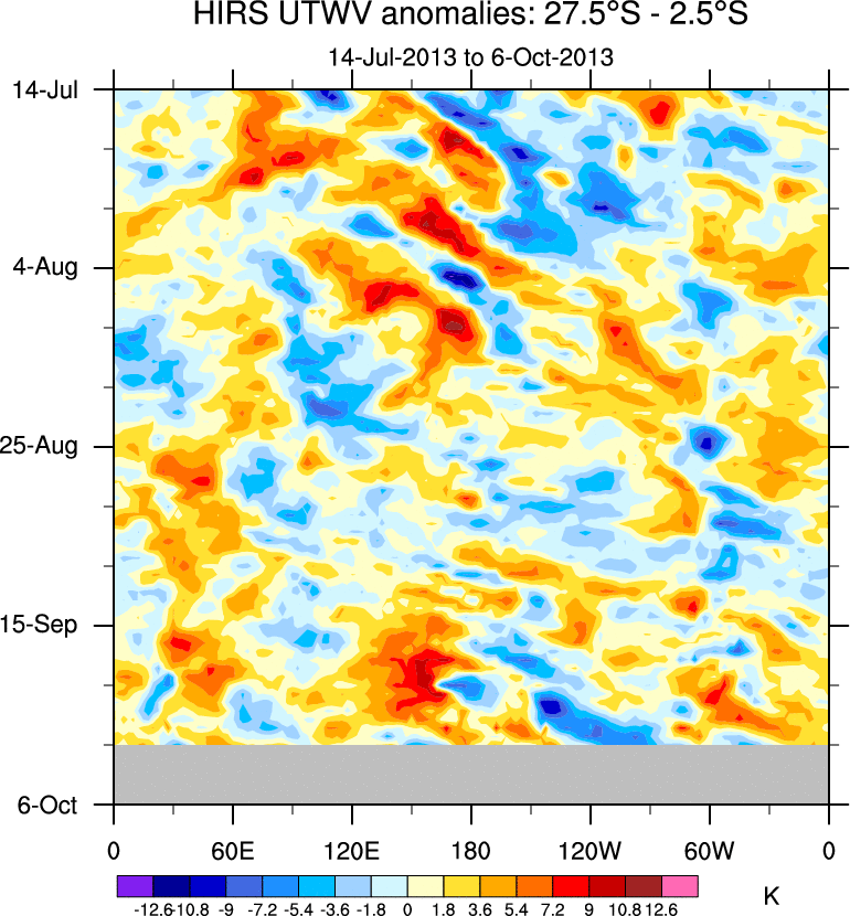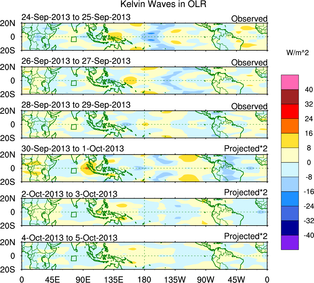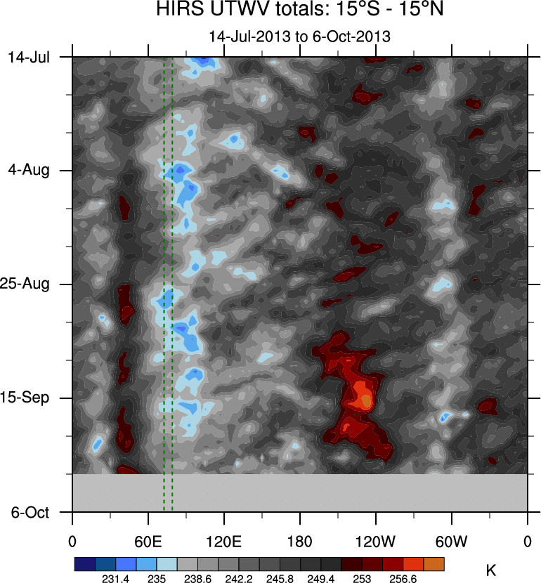 To identify tropical waves in near real-time, the OLR and UTWV data are filtered following Wheeler & Weickmann (2001 MWR). The daily anomalies are calculated using the first 3 harmonics of the seasonal cycle for 1979–2009. Missing values are then filled using linear interpolation in space and time. The most recent 365 days of anomalies are padded with 659 days of zeroes, and the result is filtered for each wave type.