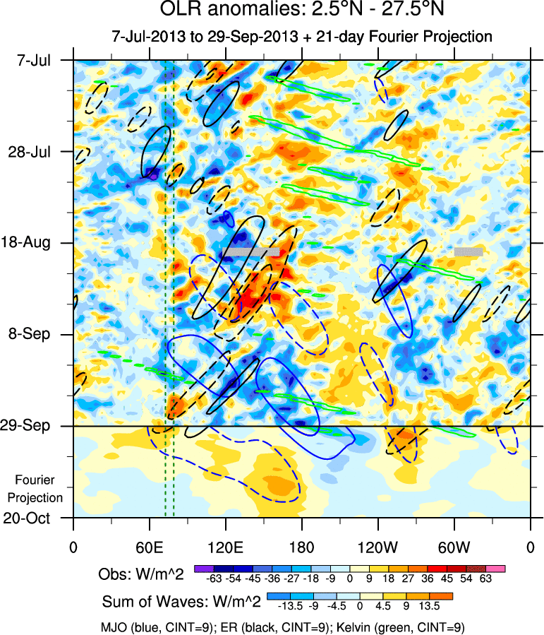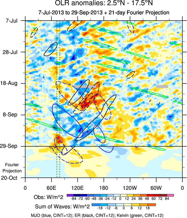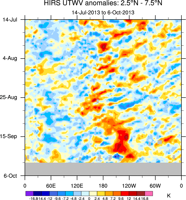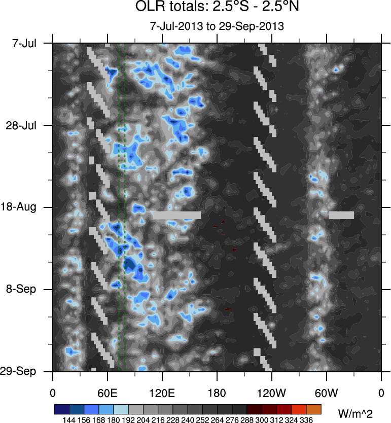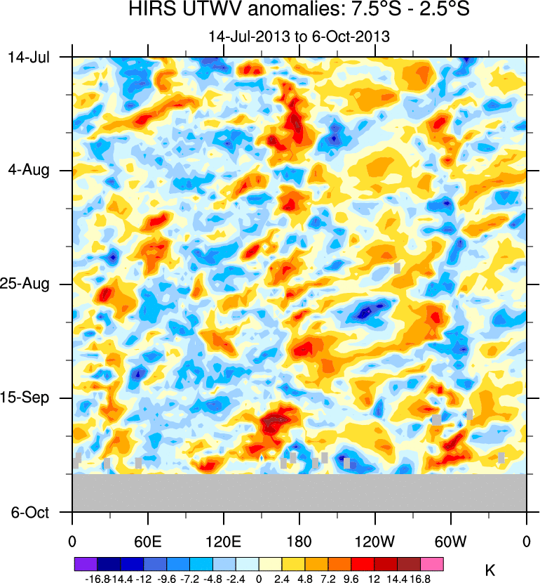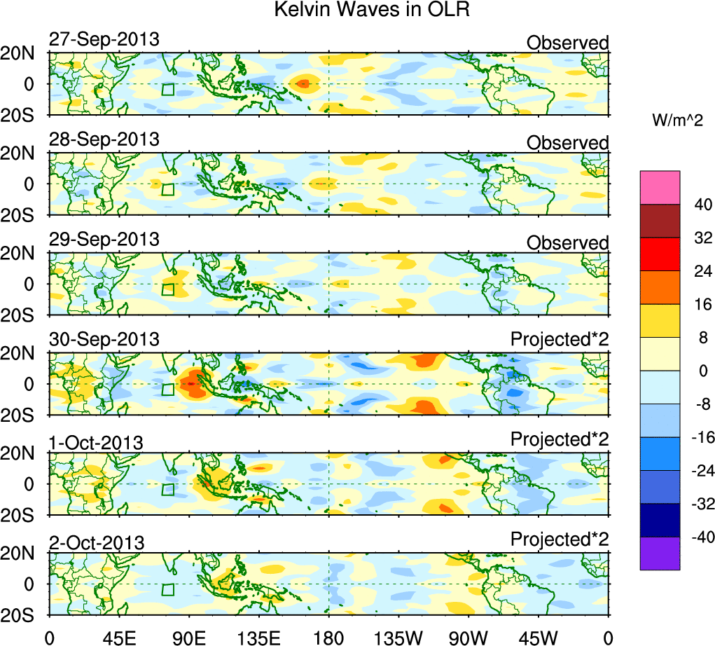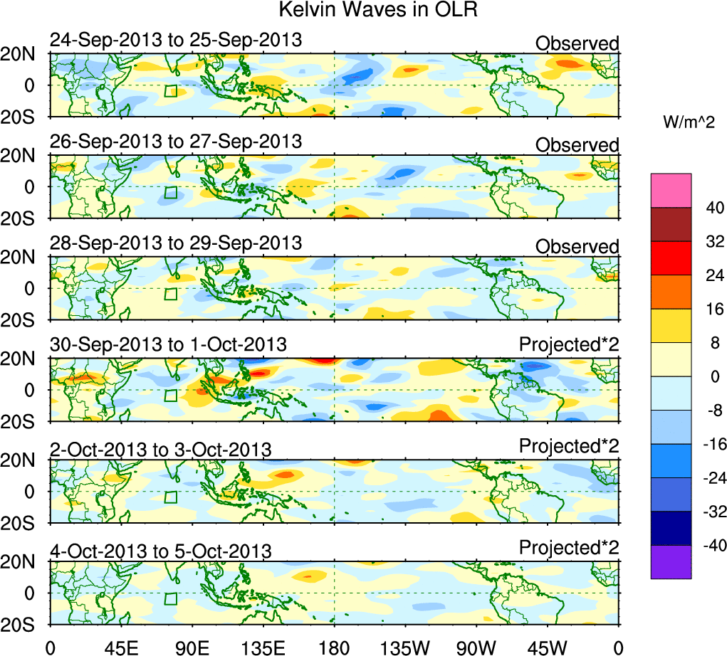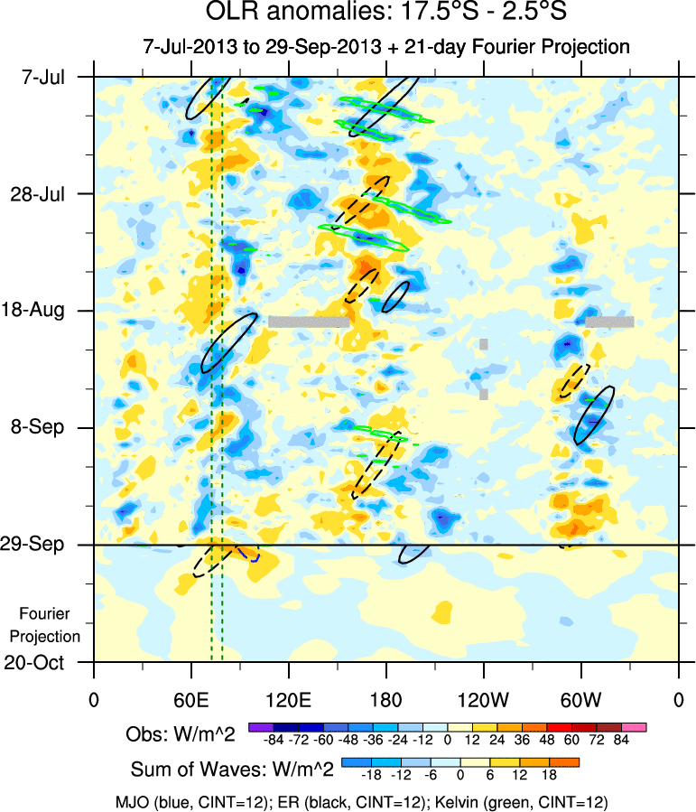 To identify tropical waves in near real-time, the OLR and UTWV data are filtered following Wheeler & Weickmann (2001 MWR). The daily anomalies are calculated using the first 3 harmonics of the seasonal cycle for 1979–2009. Missing values are then filled using linear interpolation in space and time. The most recent 365 days of anomalies are padded with 659 days of zeroes, and the result is filtered for each wave type.