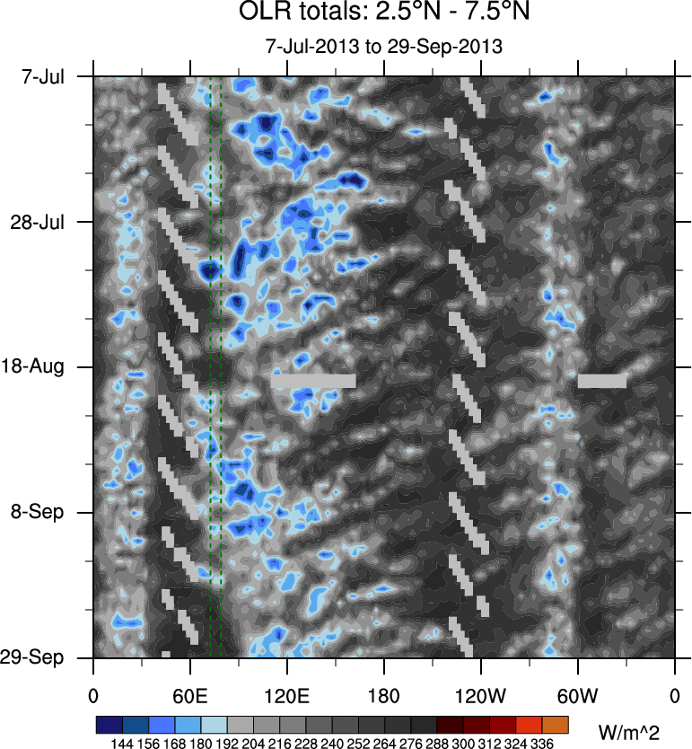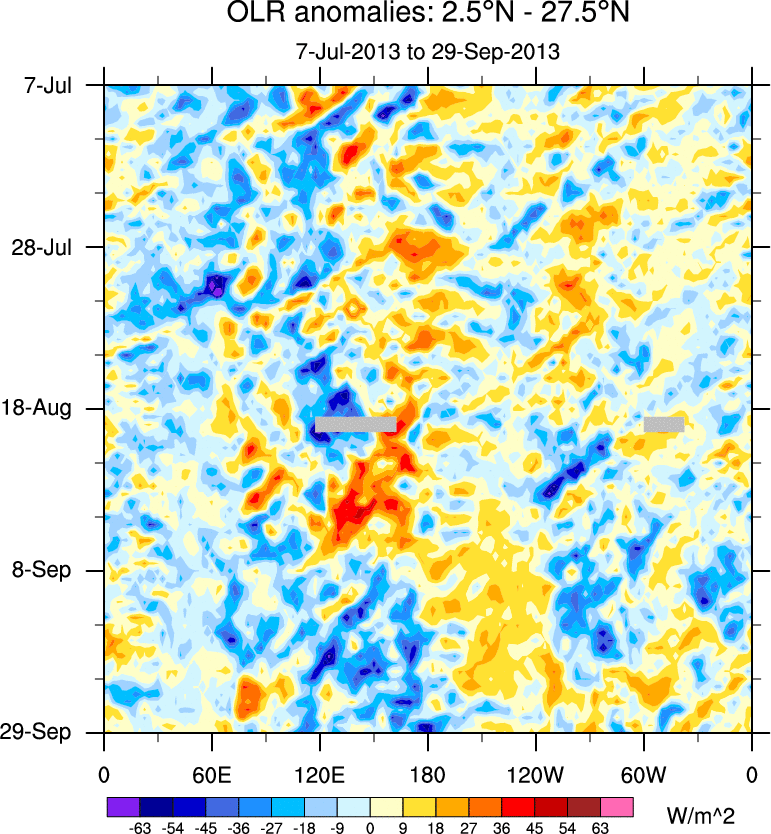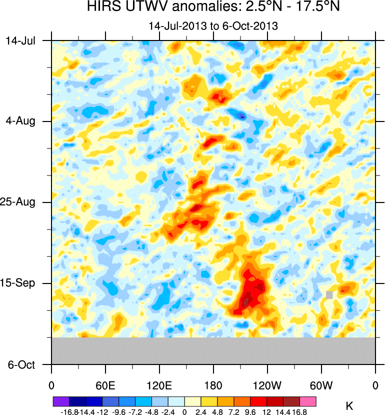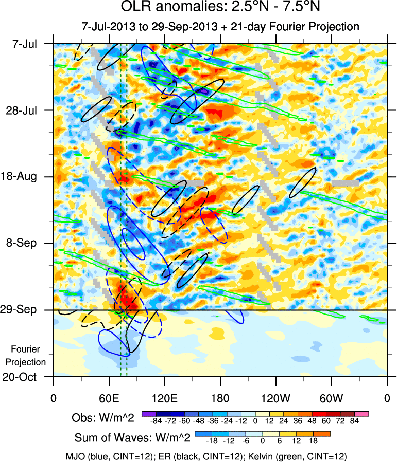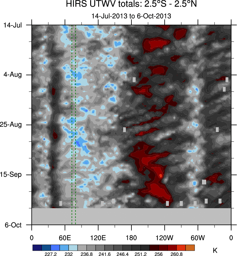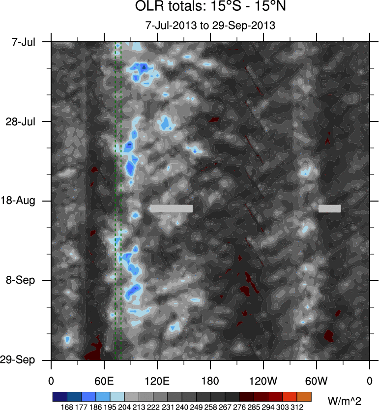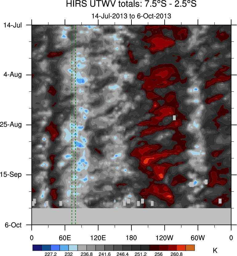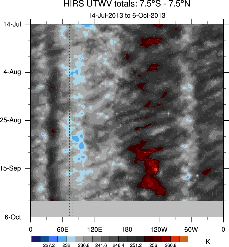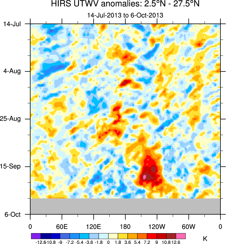 To identify tropical waves in near real-time, the OLR and UTWV data are filtered following Wheeler & Weickmann (2001 MWR). The daily anomalies are calculated using the first 3 harmonics of the seasonal cycle for 1979–2009. Missing values are then filled using linear interpolation in space and time. The most recent 365 days of anomalies are padded with 659 days of zeroes, and the result is filtered for each wave type.