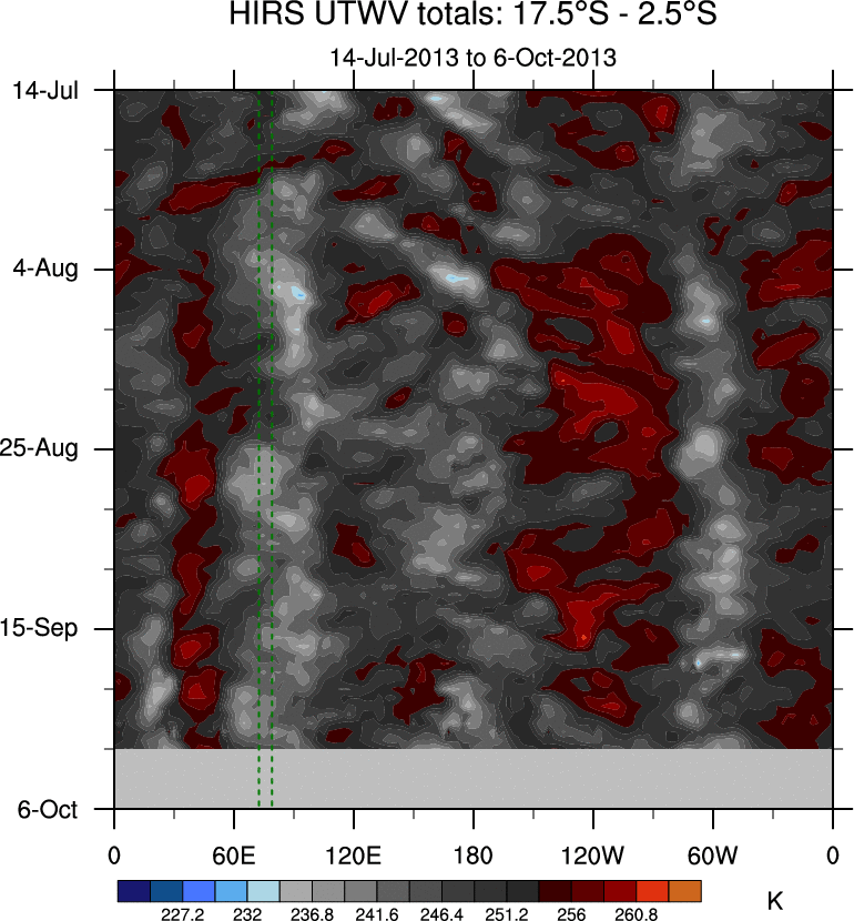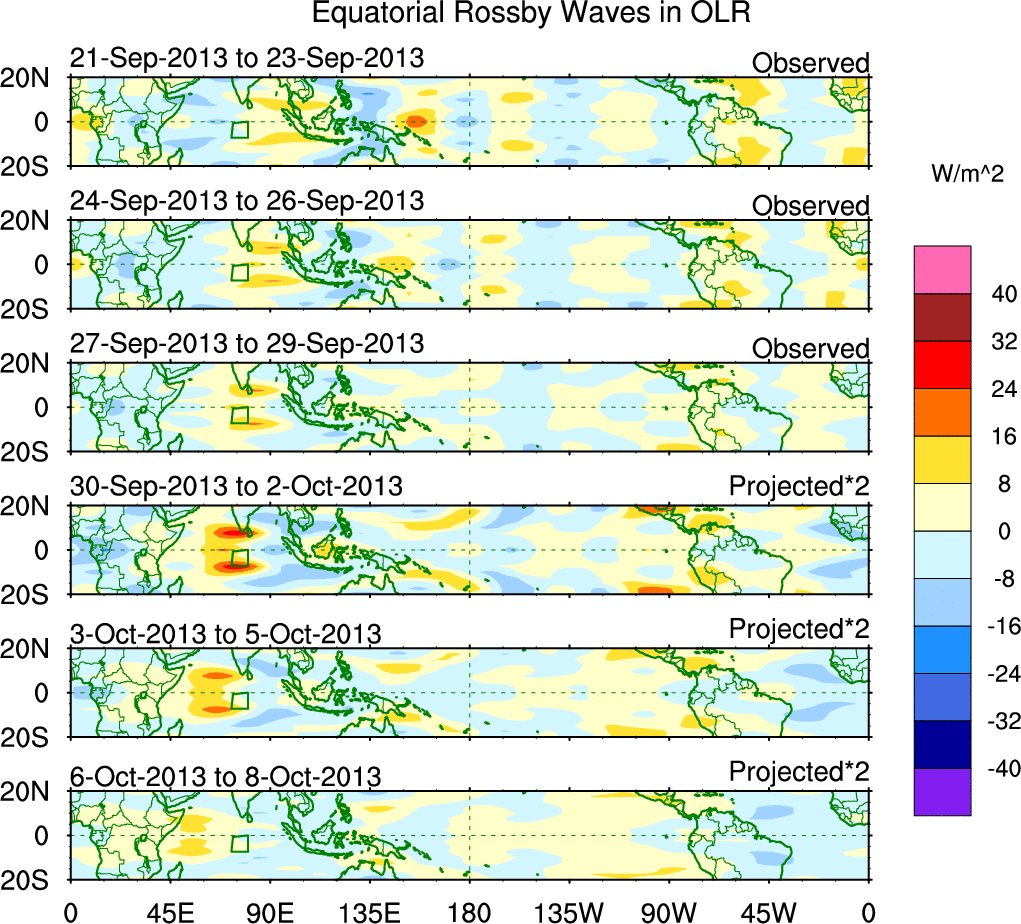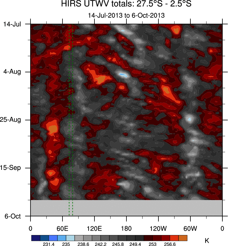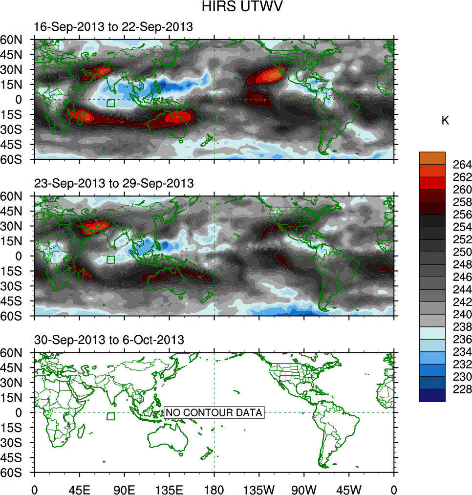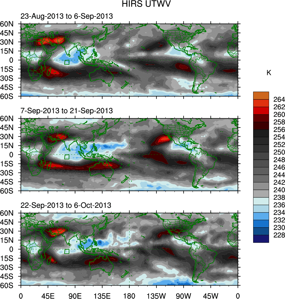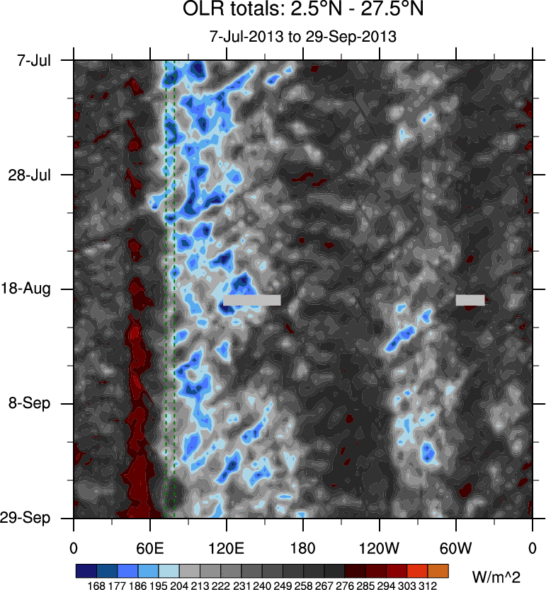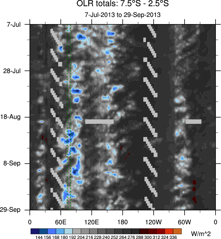 To identify tropical waves in near real-time, the OLR and UTWV data are filtered following Wheeler & Weickmann (2001 MWR). The daily anomalies are calculated using the first 3 harmonics of the seasonal cycle for 1979–2009. Missing values are then filled using linear interpolation in space and time. The most recent 365 days of anomalies are padded with 659 days of zeroes, and the result is filtered for each wave type.