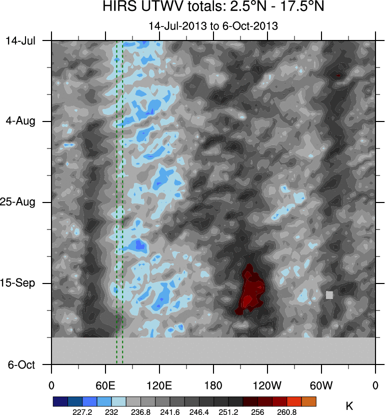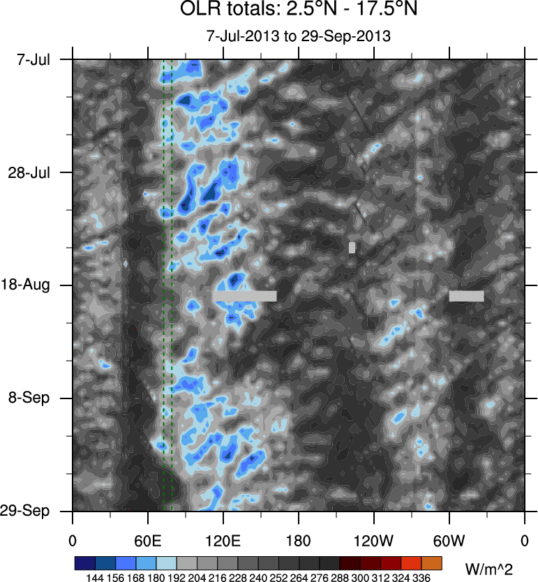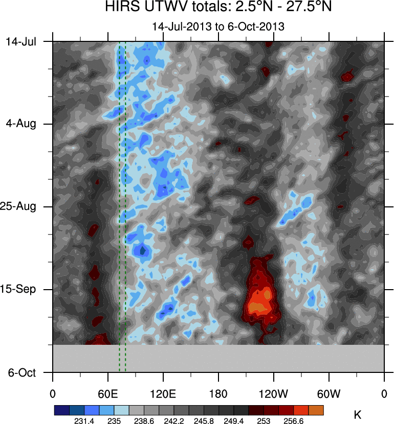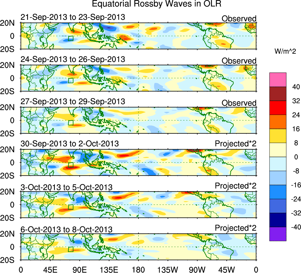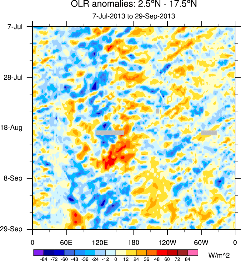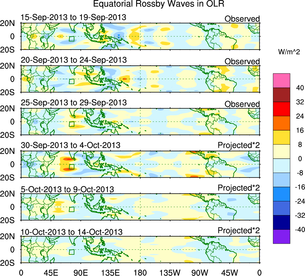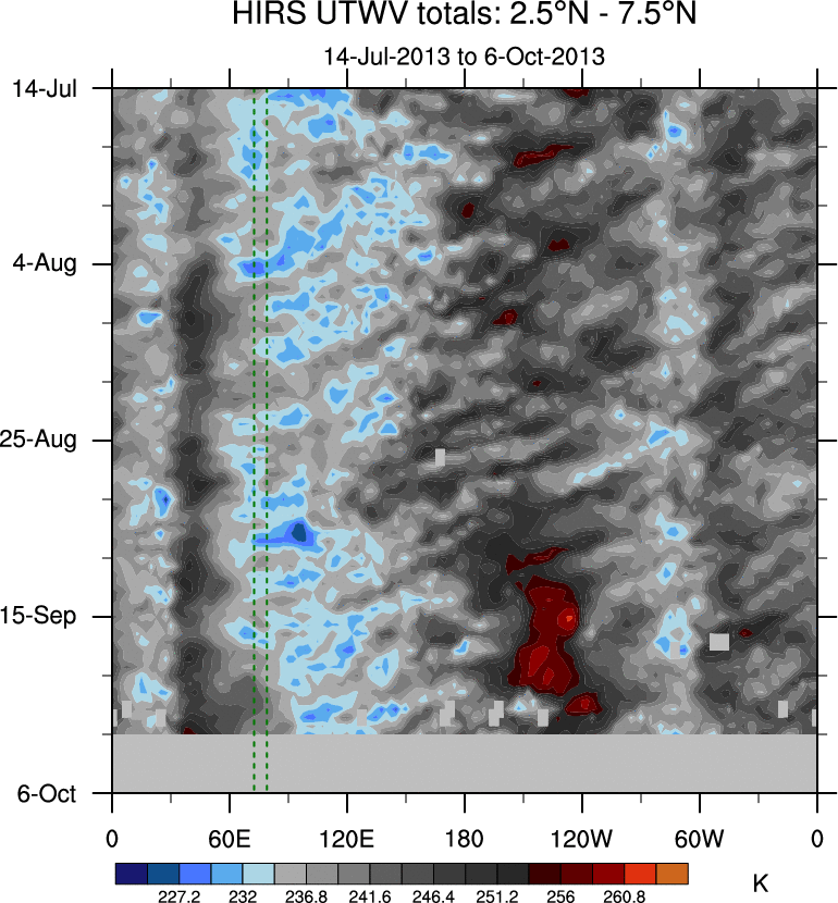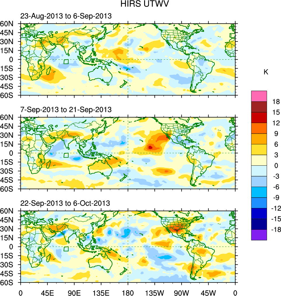 To identify tropical waves in near real-time, the OLR and UTWV data are filtered following Wheeler & Weickmann (2001 MWR). The daily anomalies are calculated using the first 3 harmonics of the seasonal cycle for 1979–2009. Missing values are then filled using linear interpolation in space and time. The most recent 365 days of anomalies are padded with 659 days of zeroes, and the result is filtered for each wave type.