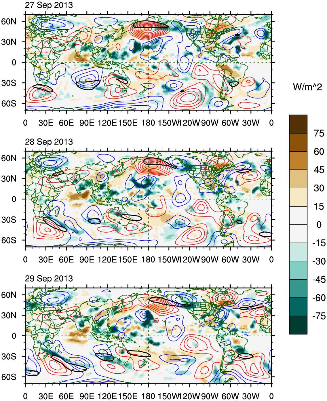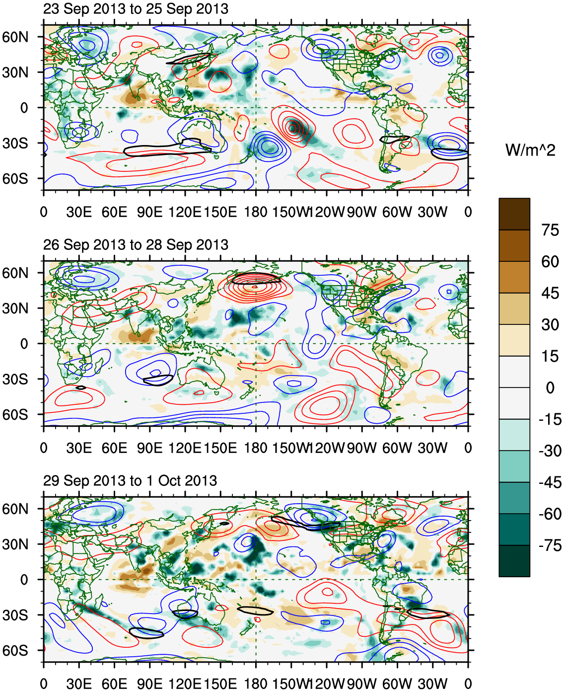 Maps of recent OLR anomalies (shaded), 200-hPa streamfunction