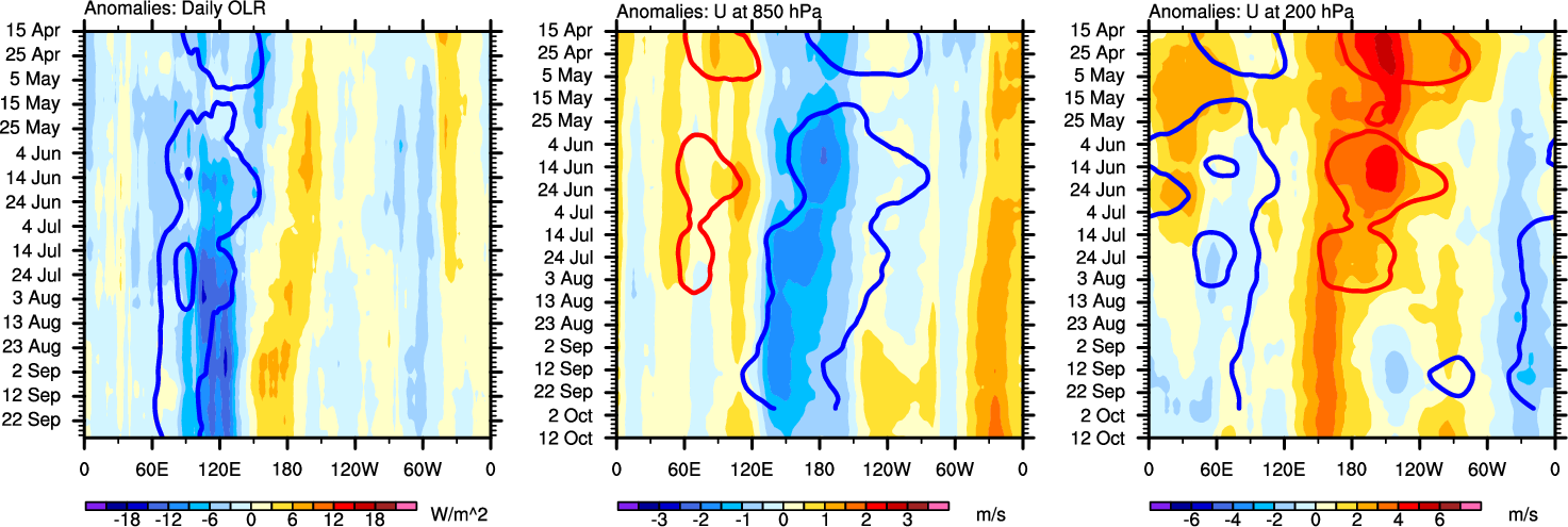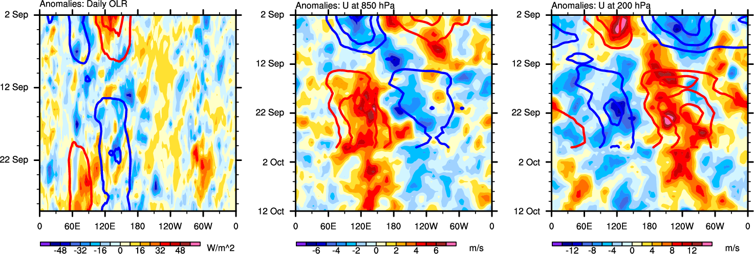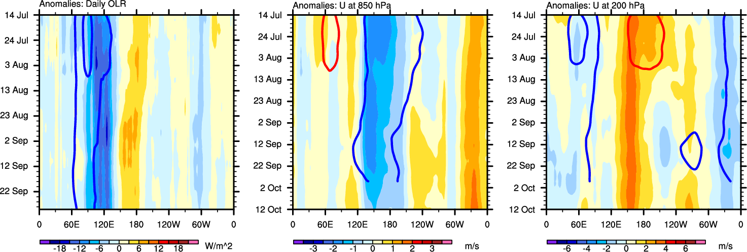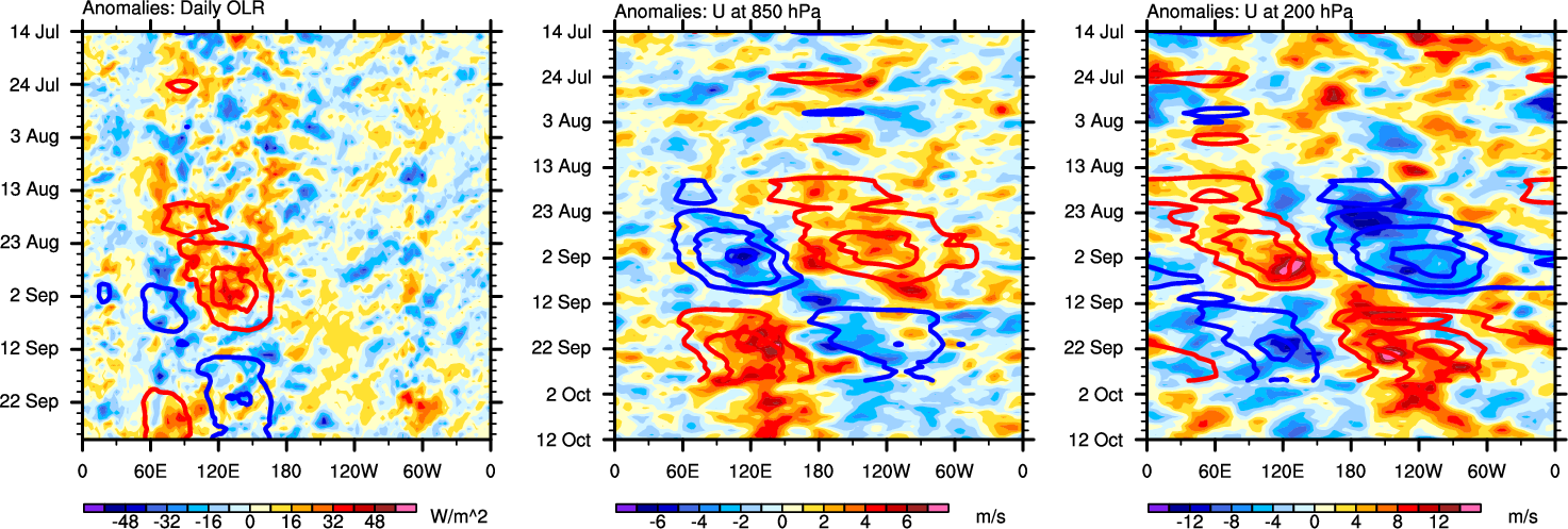The Hovmollers show longitude-time plots for OLR, U-850, and U-200. The shading indicates the observed anomalies, while the contours are the projection of those anomalies onto the RMM EOFs.