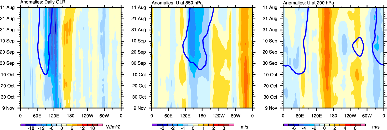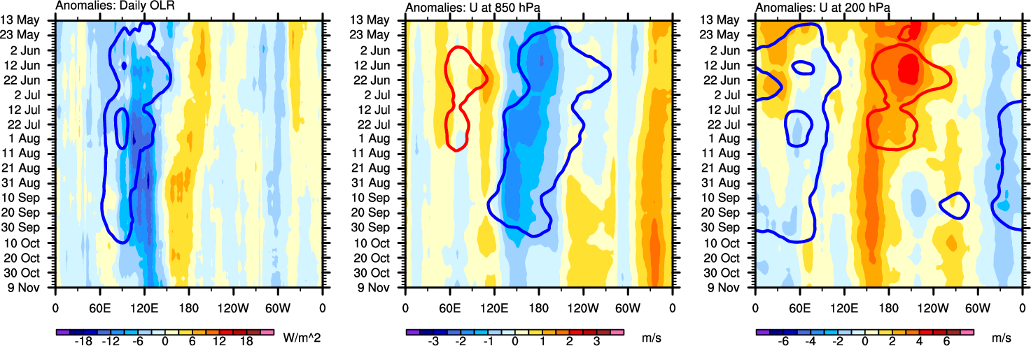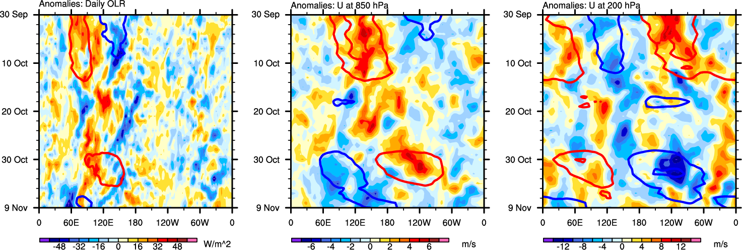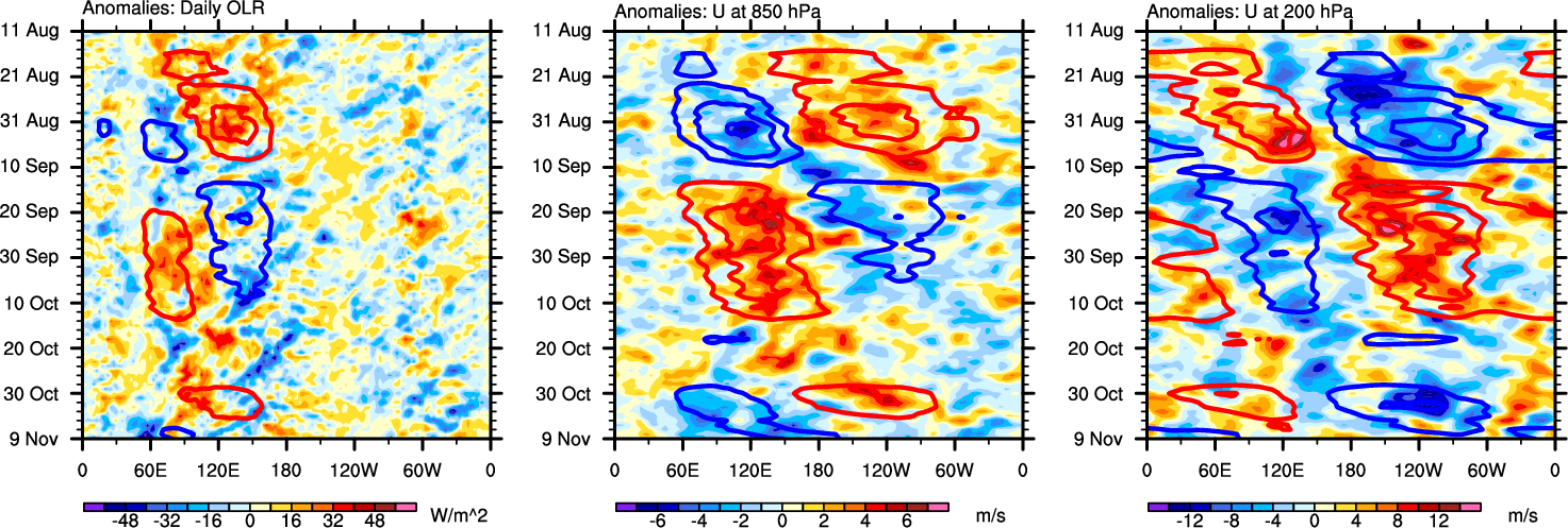 The Hovmollers show longitude-time plots for OLR, U-850, and U-200. The shading indicates the observed anomalies, while the contours are the projection of those anomalies onto the RMM EOFs.