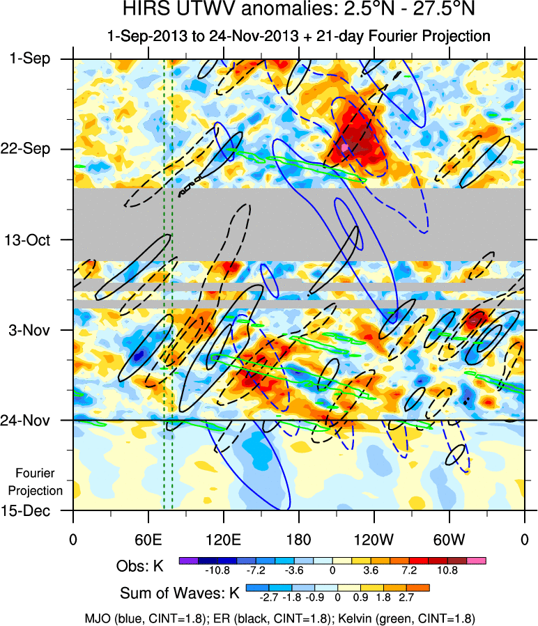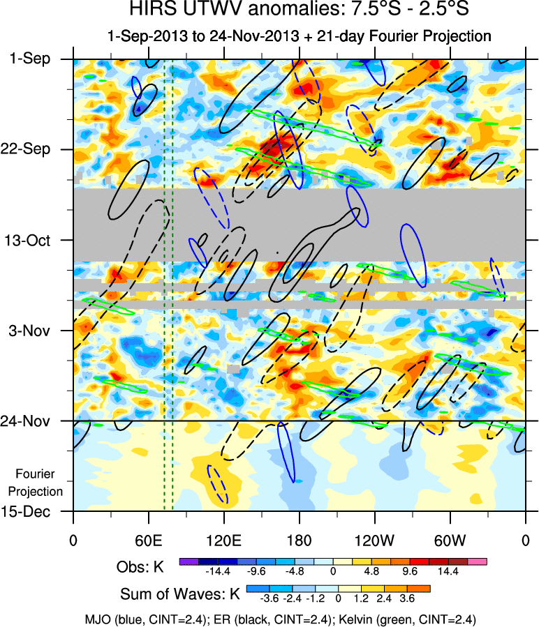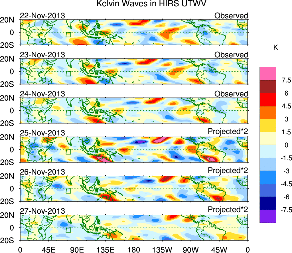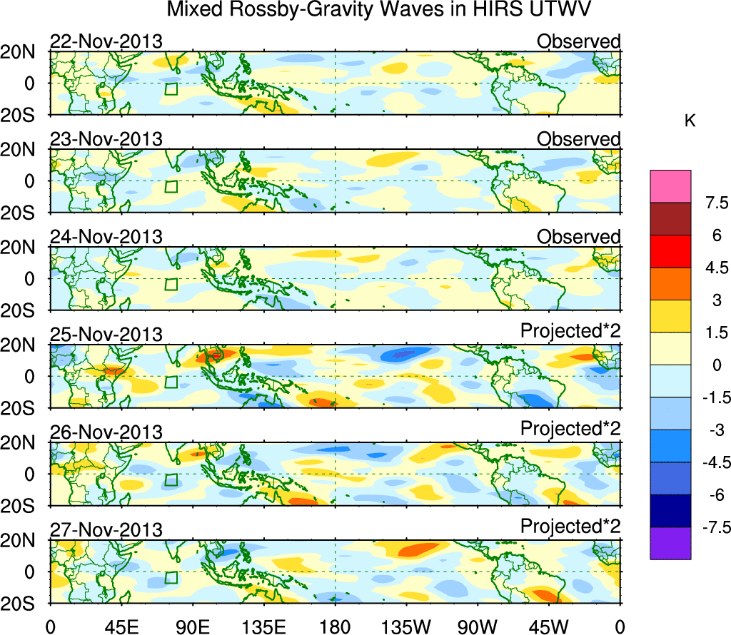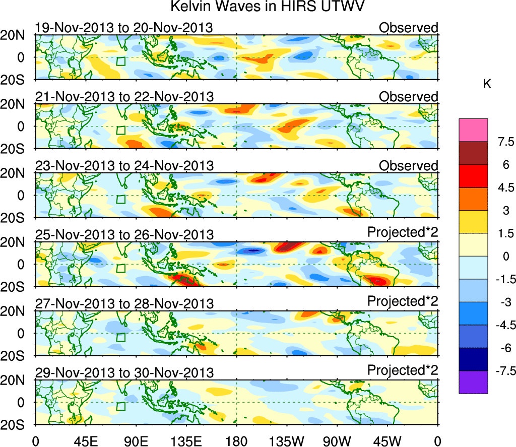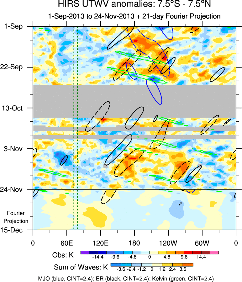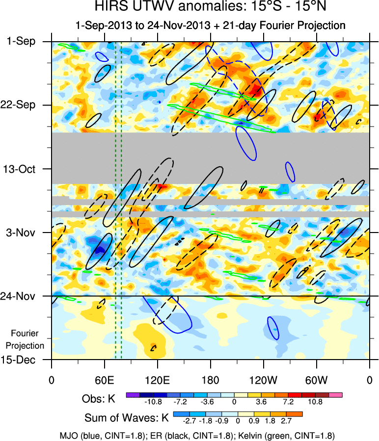 To identify tropical waves in near real-time, the OLR and UTWV data are filtered following Wheeler & Weickmann (2001 MWR). The daily anomalies are calculated using the first 3 harmonics of the seasonal cycle for 1979–2009. Missing values are then filled using linear interpolation in space and time. The most recent 365 days of anomalies are padded with 659 days of zeroes, and the result is filtered for each wave type.