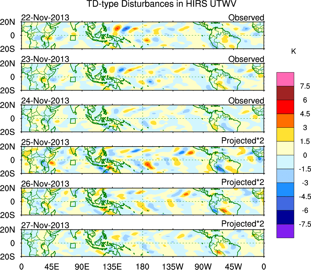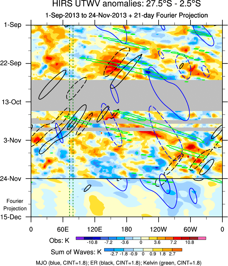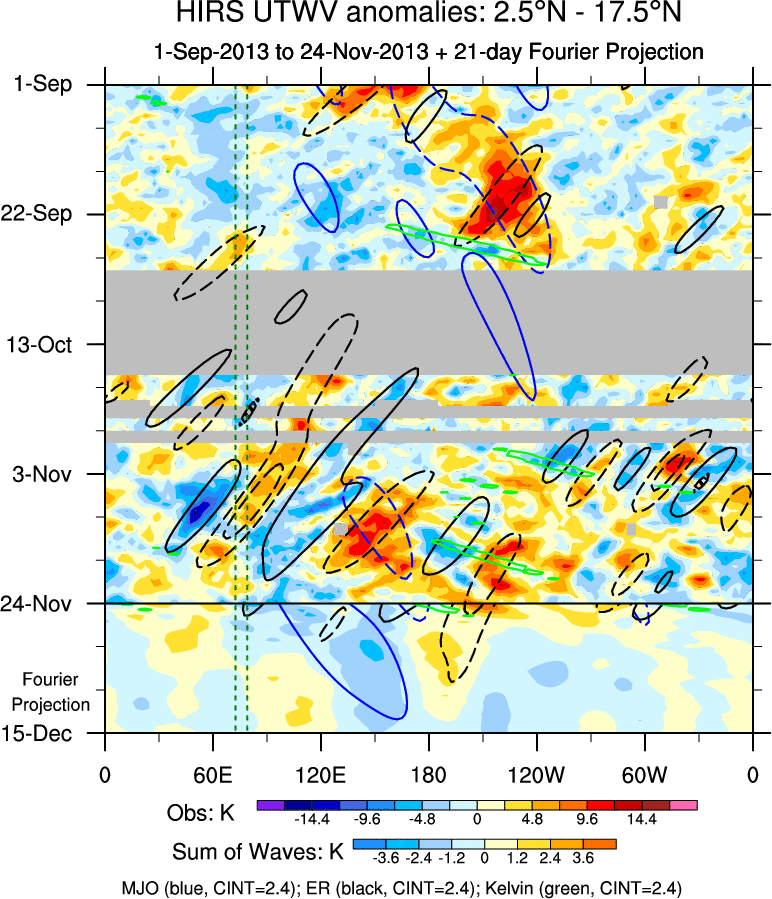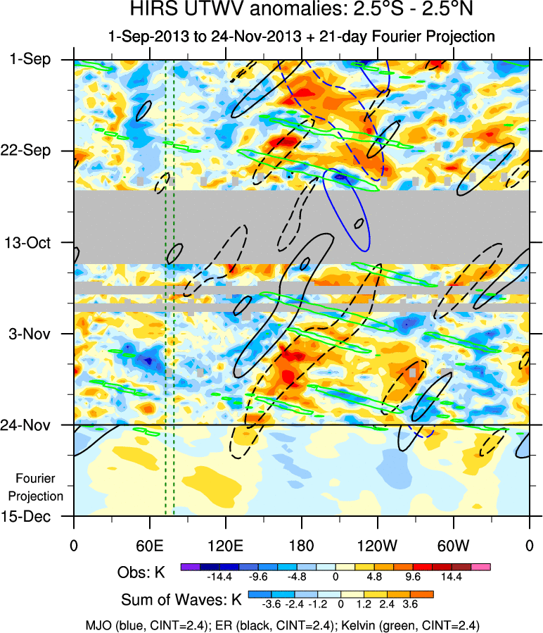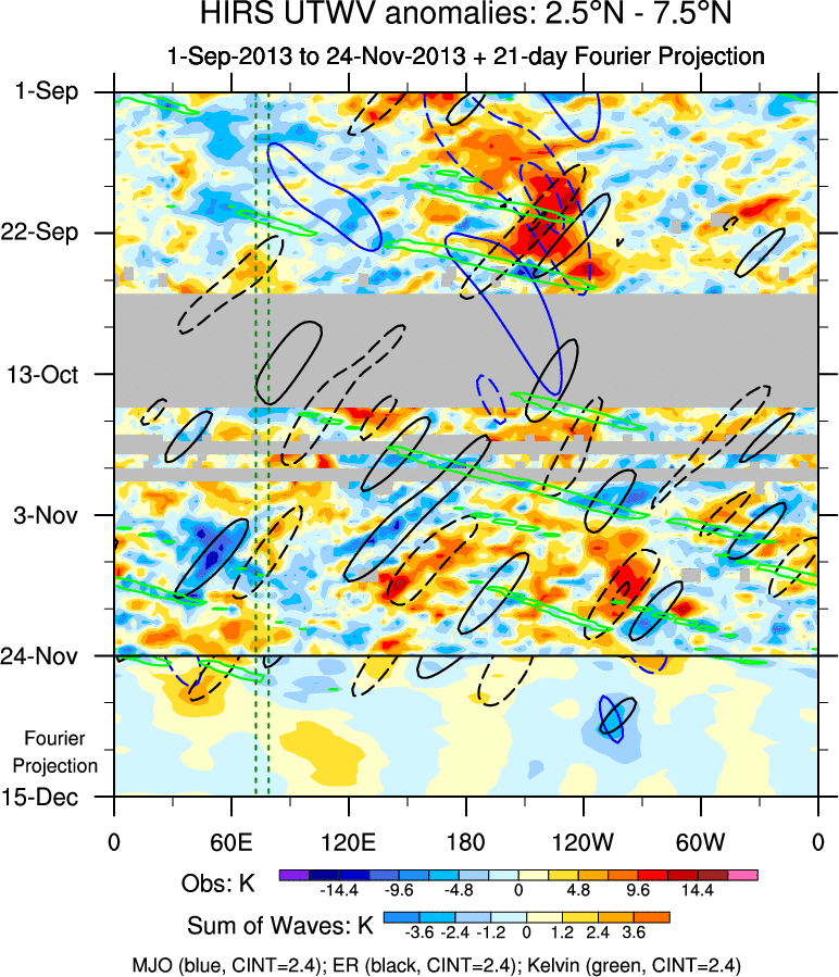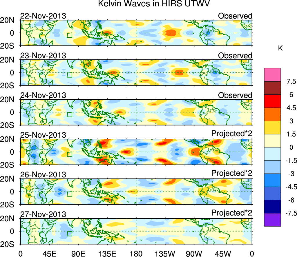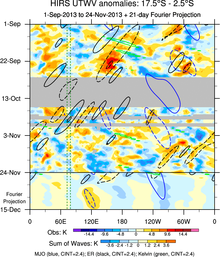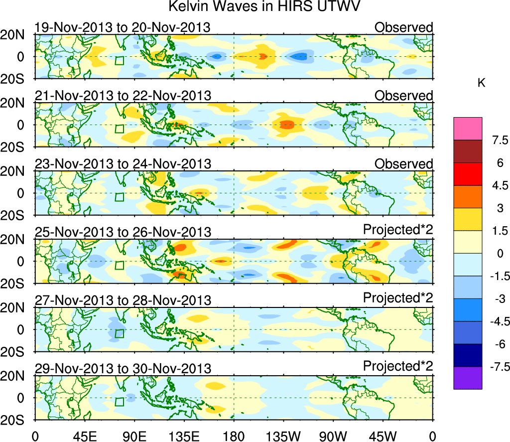 To identify tropical waves in near real-time, the OLR and UTWV data are filtered following Wheeler & Weickmann (2001 MWR). The daily anomalies are calculated using the first 3 harmonics of the seasonal cycle for 1979–2009. Missing values are then filled using linear interpolation in space and time. The most recent 365 days of anomalies are padded with 659 days of zeroes, and the result is filtered for each wave type.