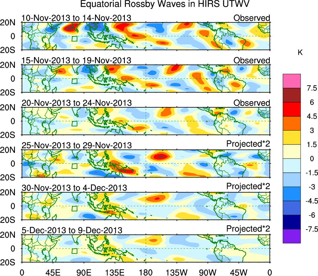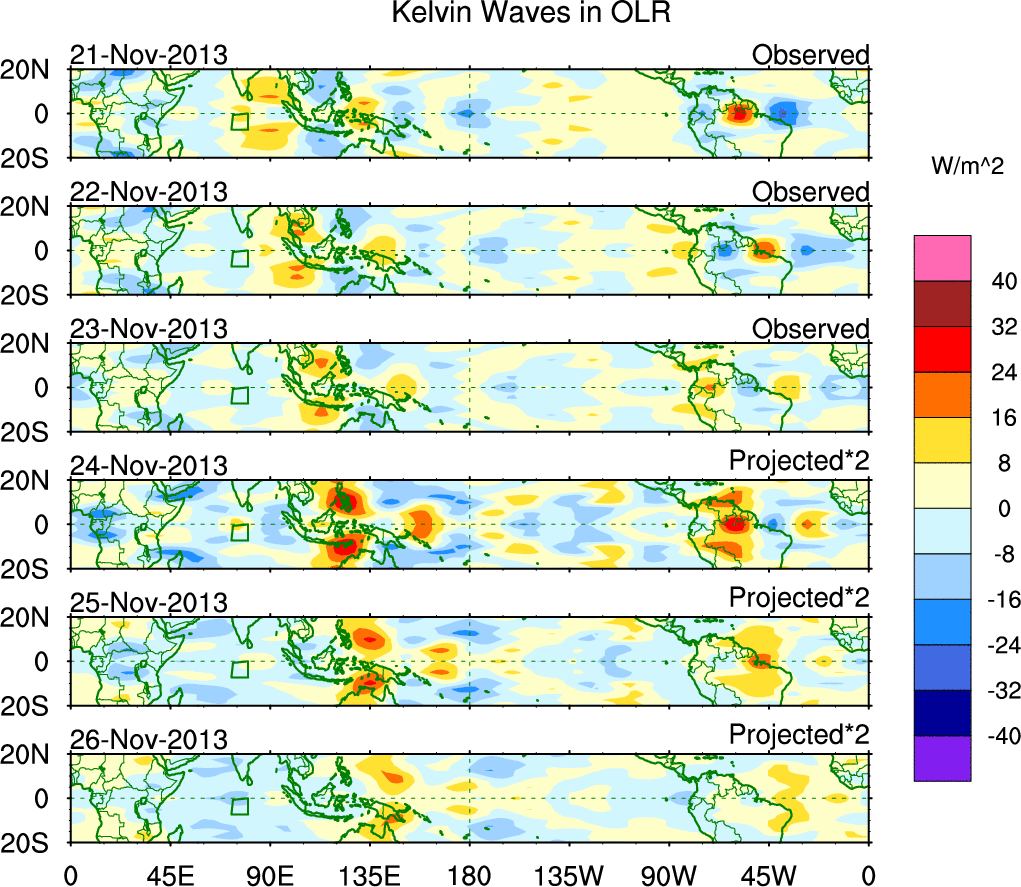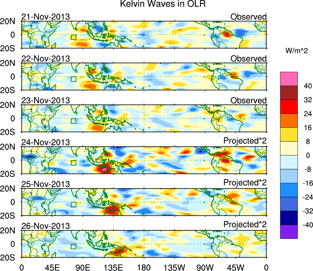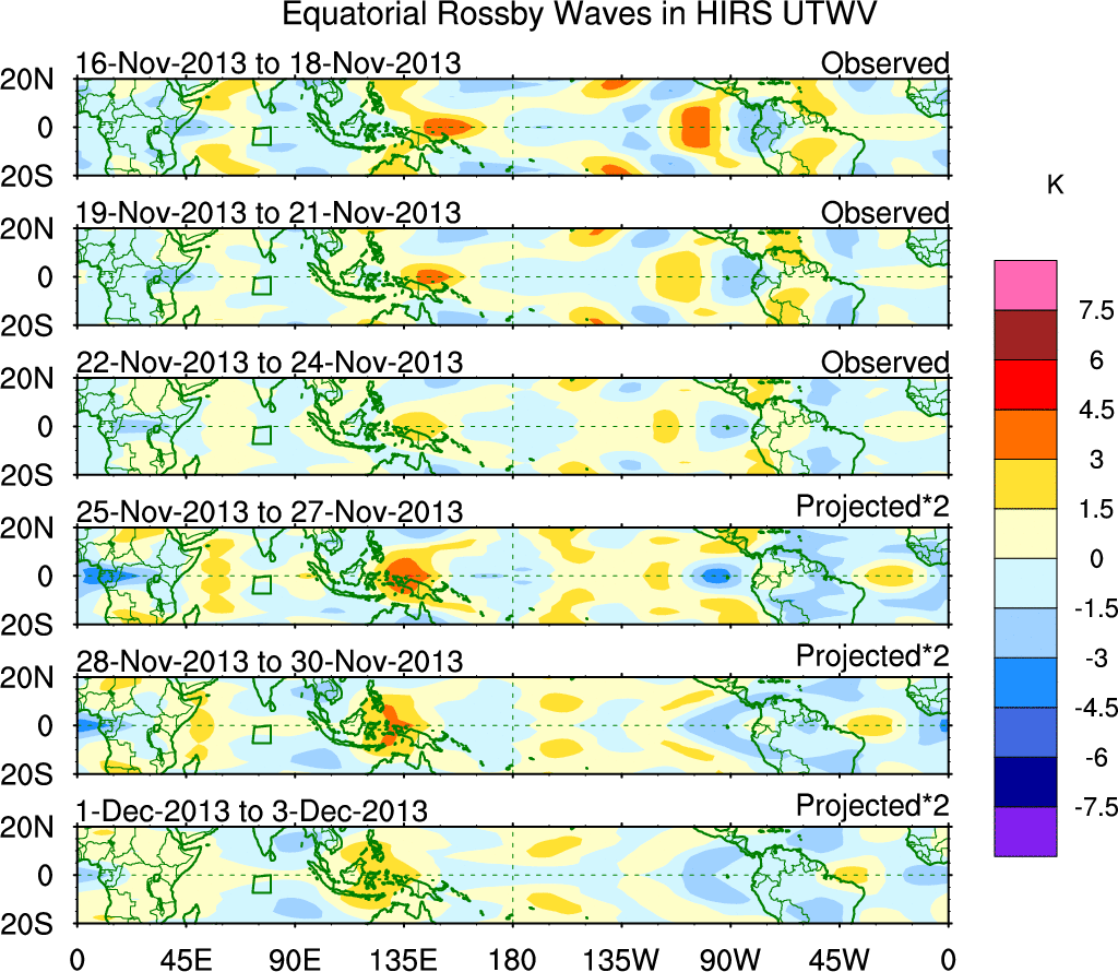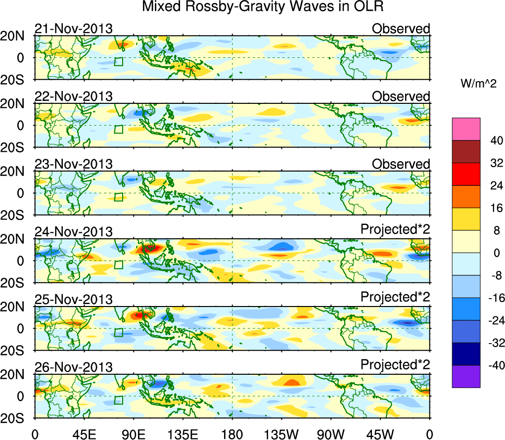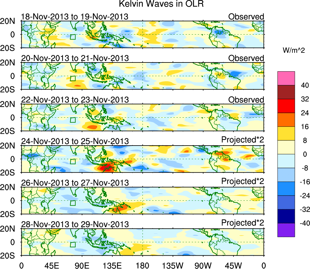 To identify tropical waves in near real-time, the OLR and UTWV data are filtered following Wheeler & Weickmann (2001 MWR). The daily anomalies are calculated using the first 3 harmonics of the seasonal cycle for 1979–2009. Missing values are then filled using linear interpolation in space and time. The most recent 365 days of anomalies are padded with 659 days of zeroes, and the result is filtered for each wave type.