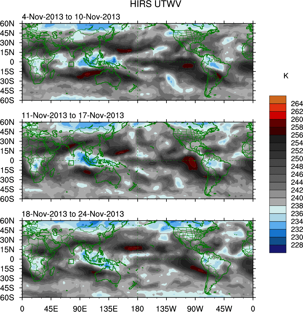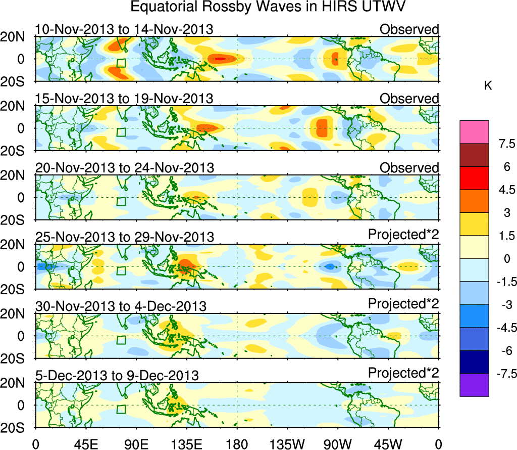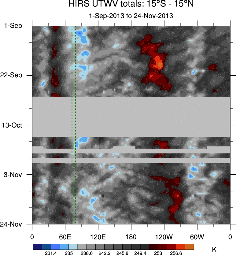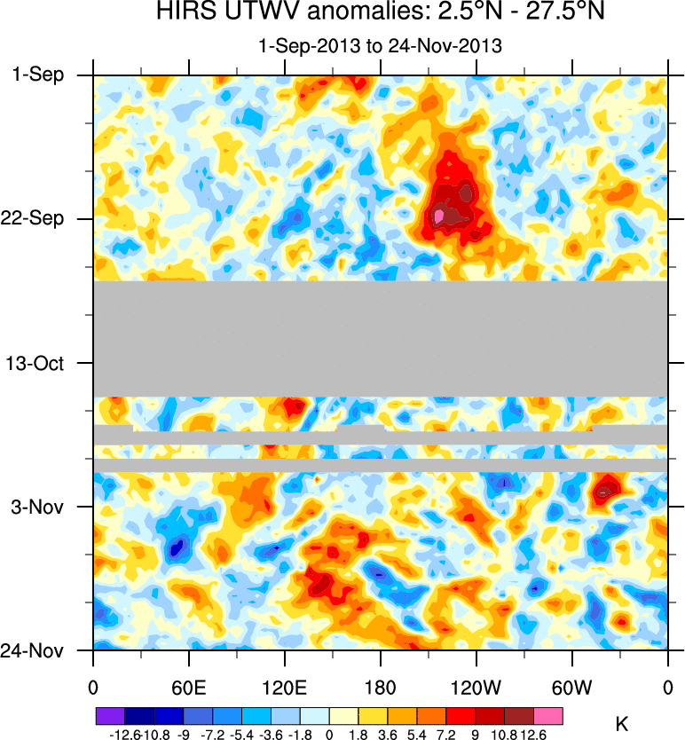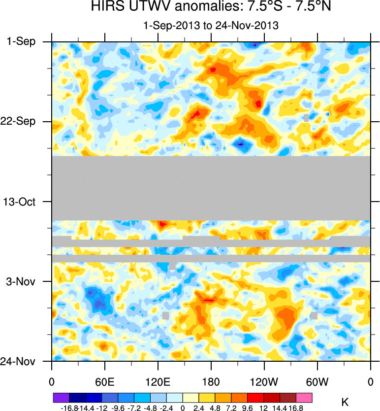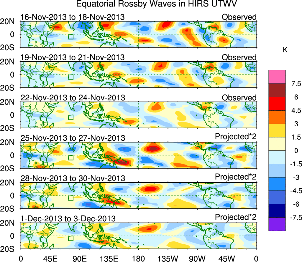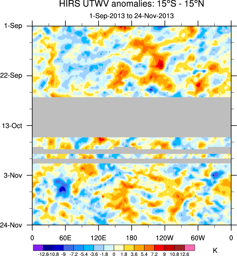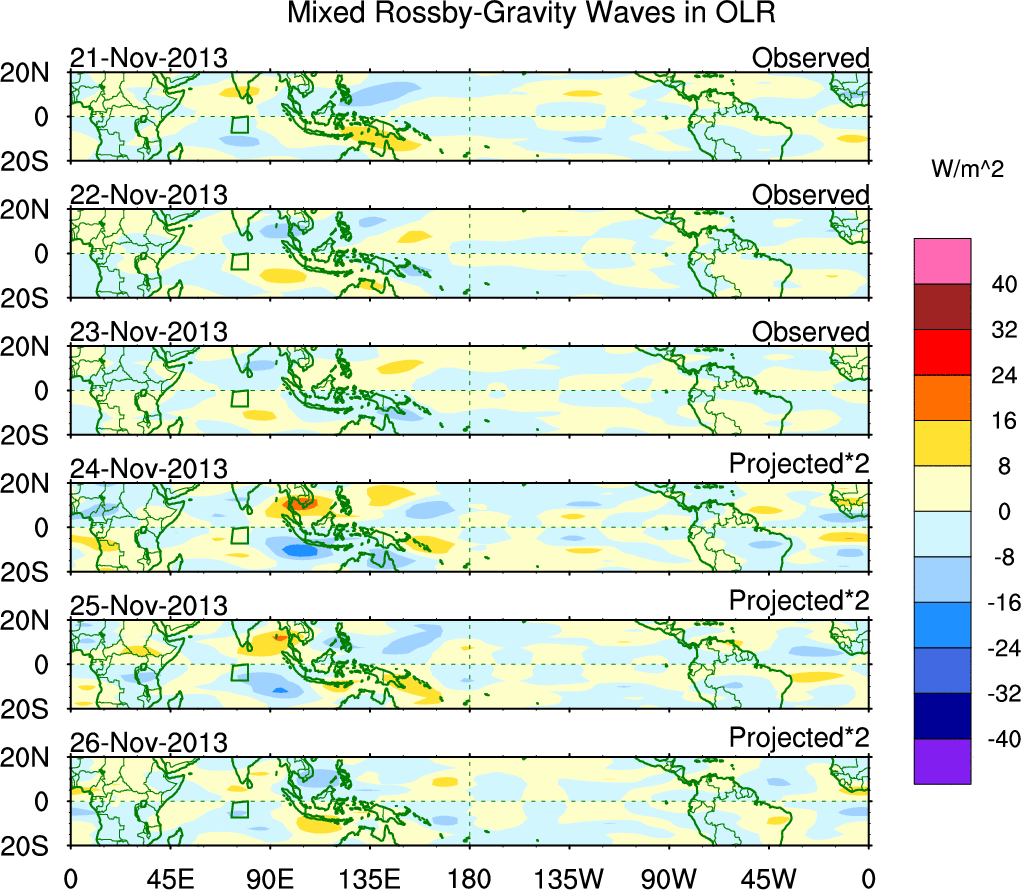 To identify tropical waves in near real-time, the OLR and UTWV data are filtered following Wheeler & Weickmann (2001 MWR). The daily anomalies are calculated using the first 3 harmonics of the seasonal cycle for 1979–2009. Missing values are then filled using linear interpolation in space and time. The most recent 365 days of anomalies are padded with 659 days of zeroes, and the result is filtered for each wave type.