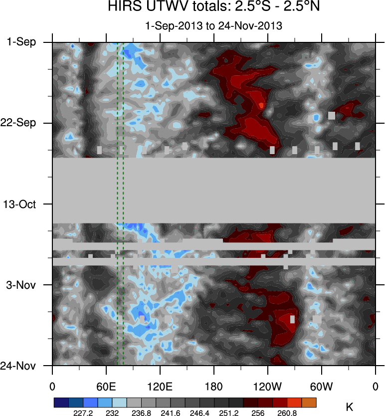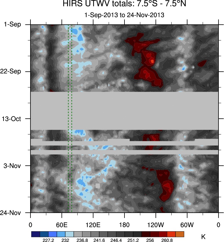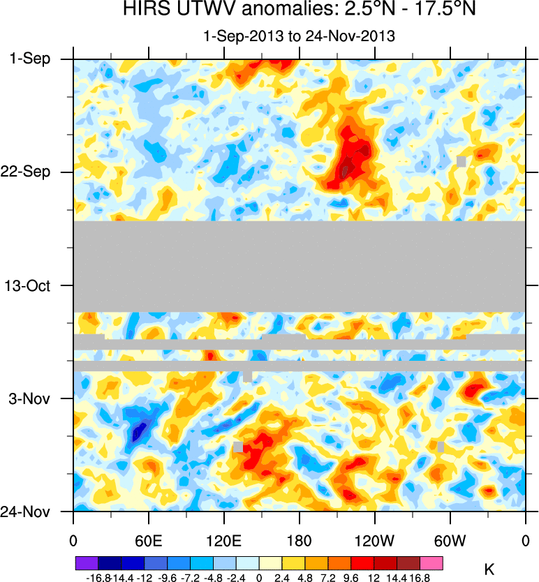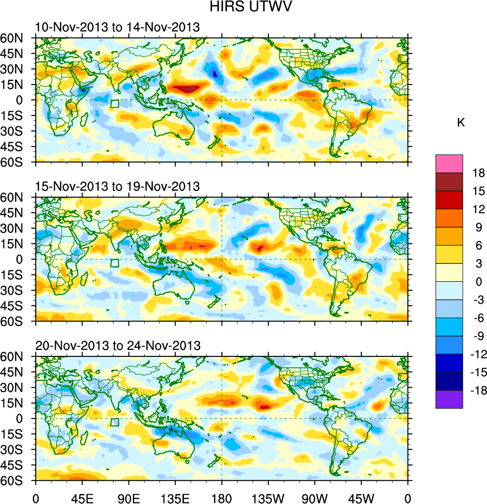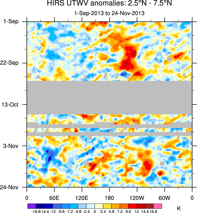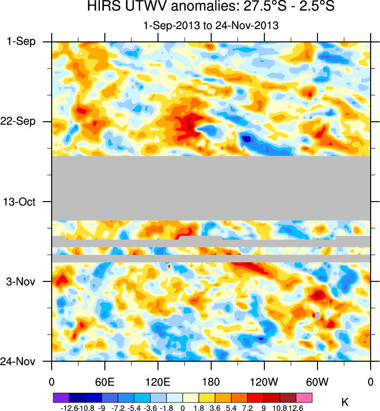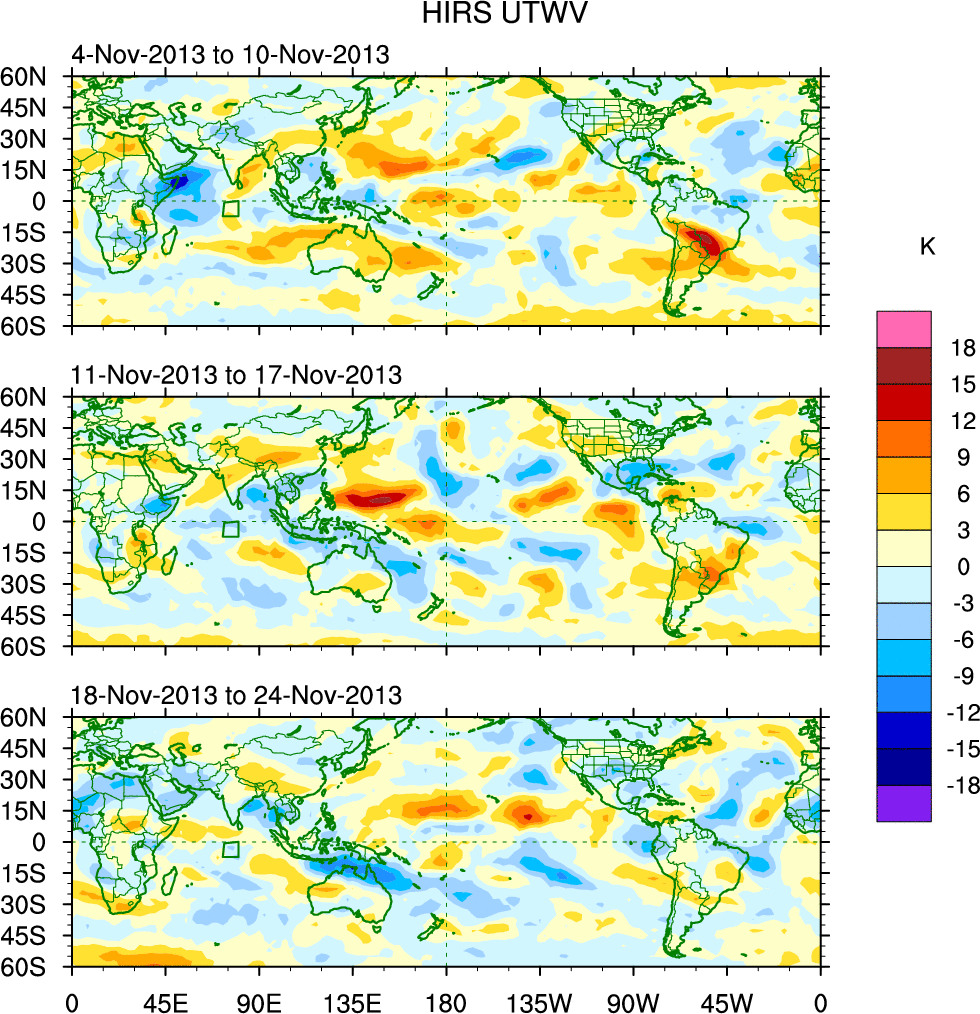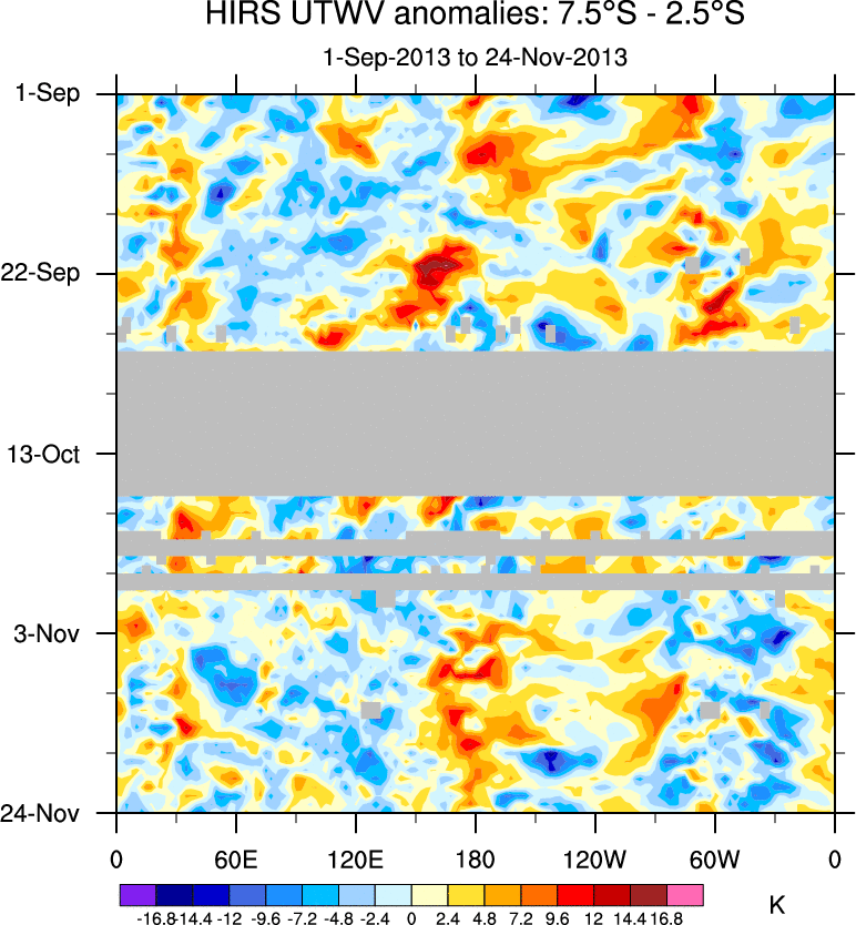To identify tropical waves in near real-time, the OLR and UTWV data are filtered following Wheeler & Weickmann (2001 MWR). The daily anomalies are calculated using the first 3 harmonics of the seasonal cycle for 1979–2009. Missing values are then filled using linear interpolation in space and time. The most recent 365 days of anomalies are padded with 659 days of zeroes, and the result is filtered for each wave type.