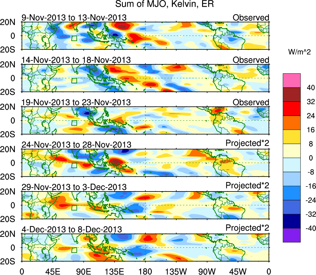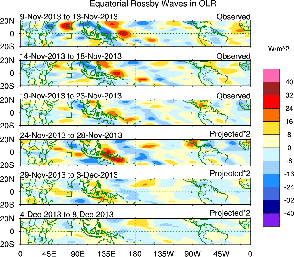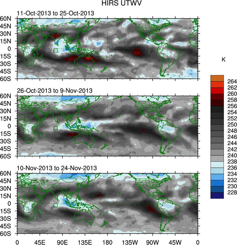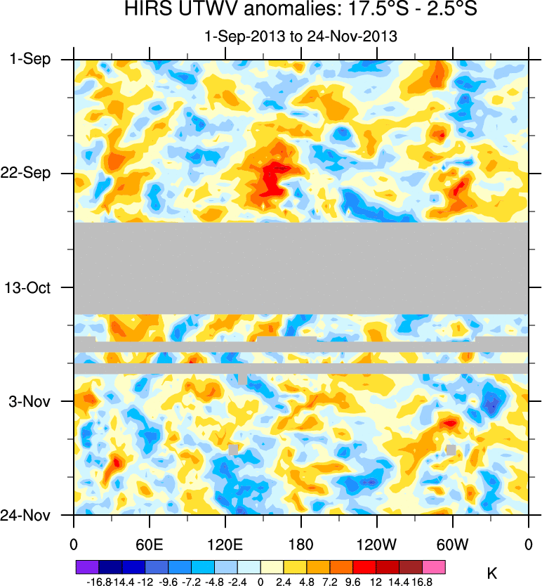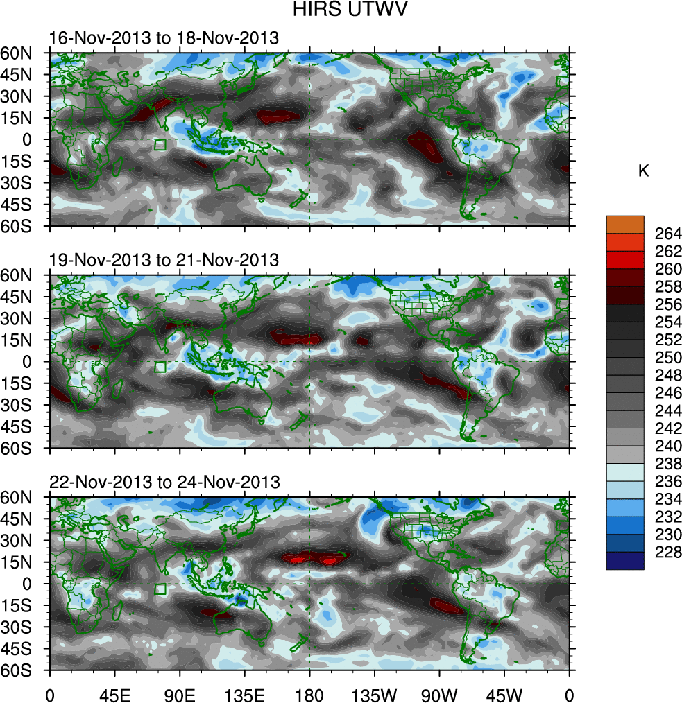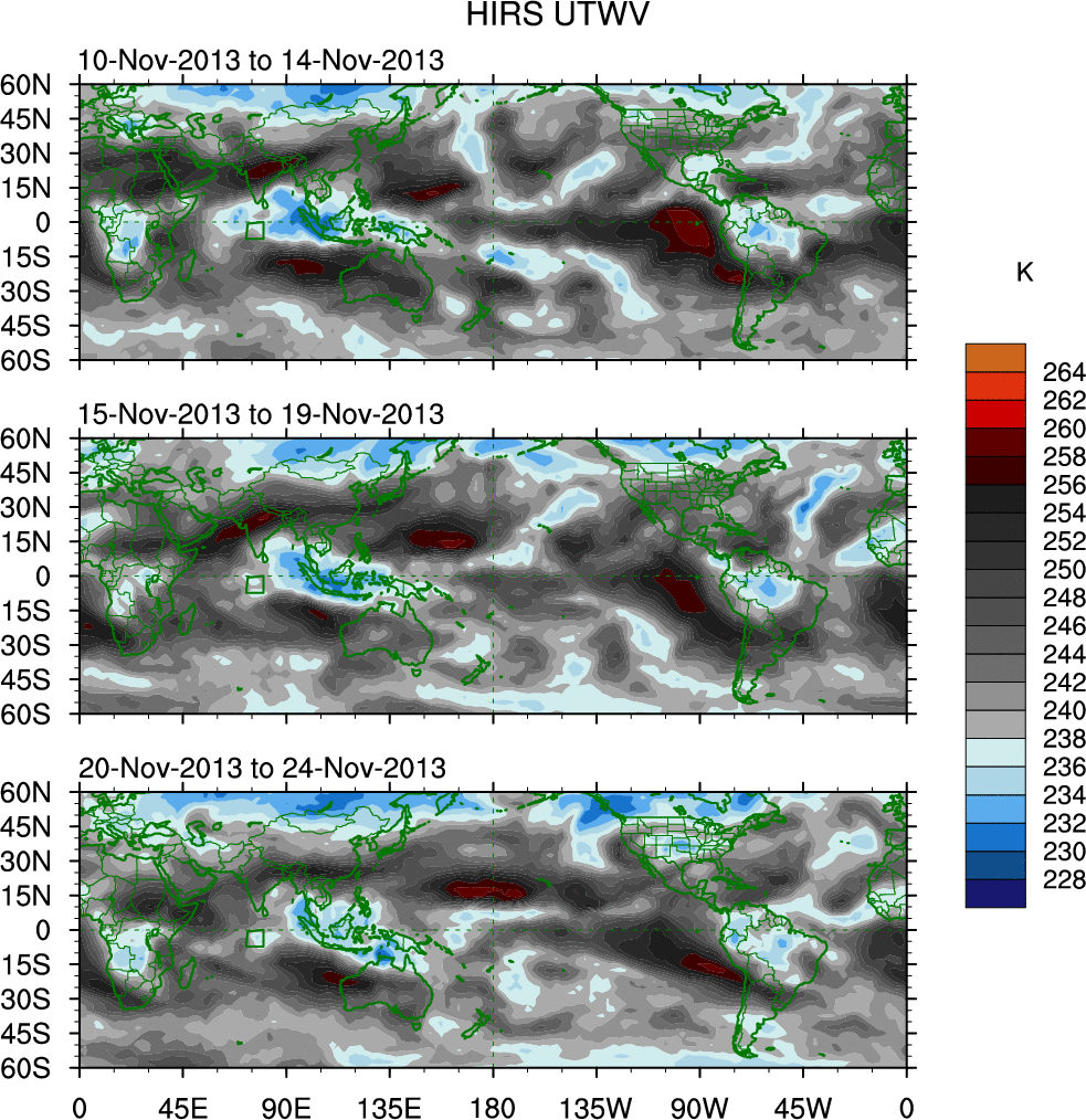 To identify tropical waves in near real-time, the OLR and UTWV data are filtered following Wheeler & Weickmann (2001 MWR). The daily anomalies are calculated using the first 3 harmonics of the seasonal cycle for 1979–2009. Missing values are then filled using linear interpolation in space and time. The most recent 365 days of anomalies are padded with 659 days of zeroes, and the result is filtered for each wave type.