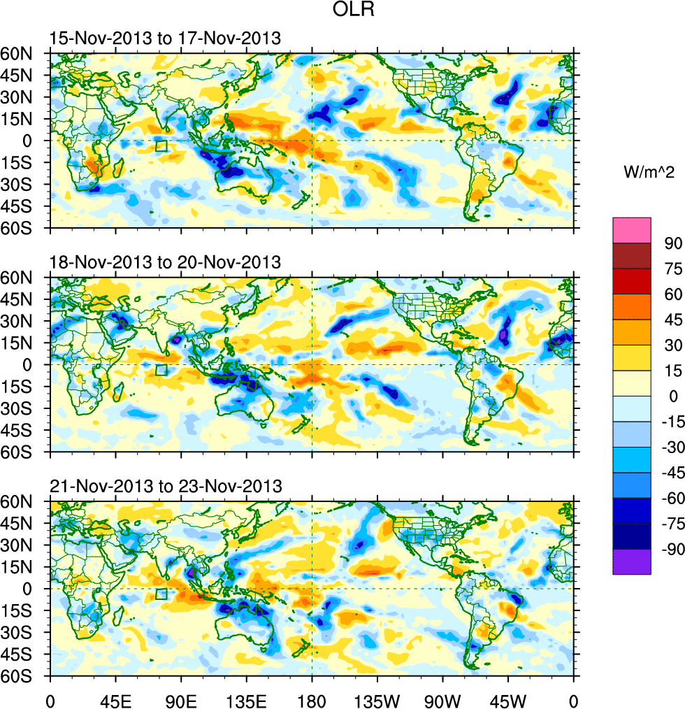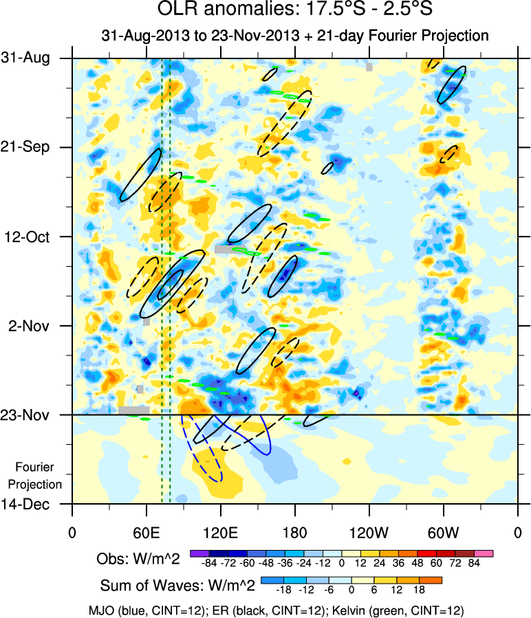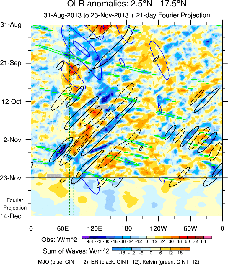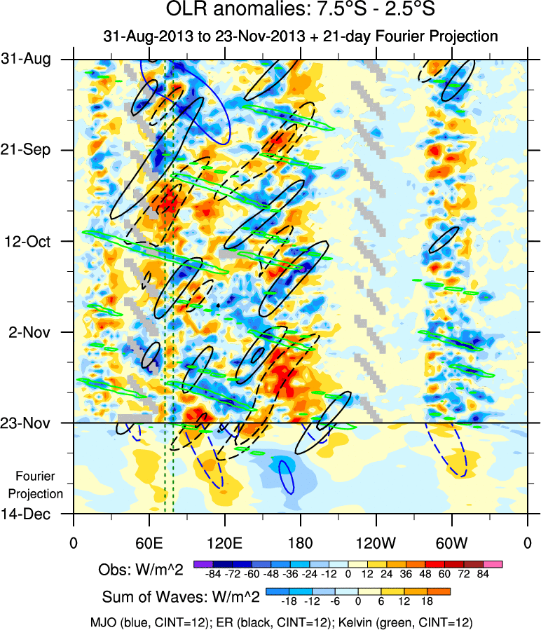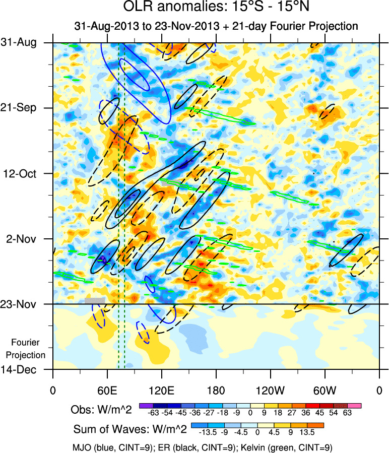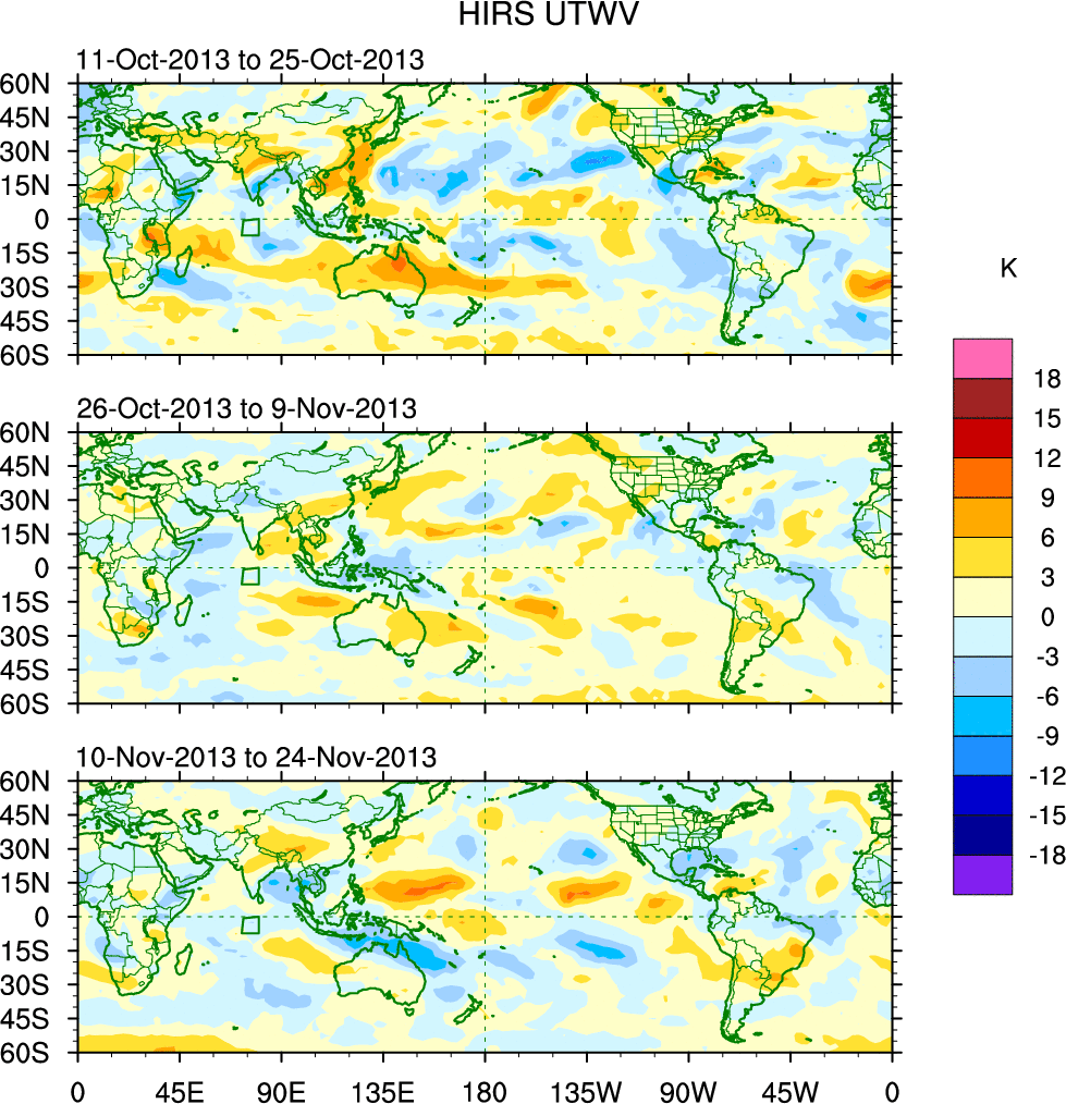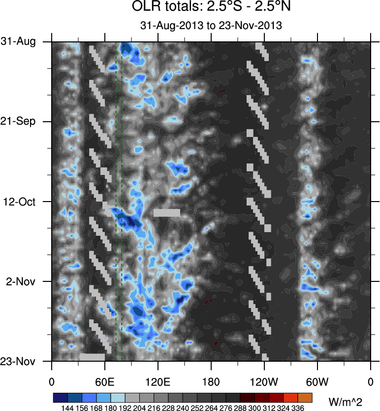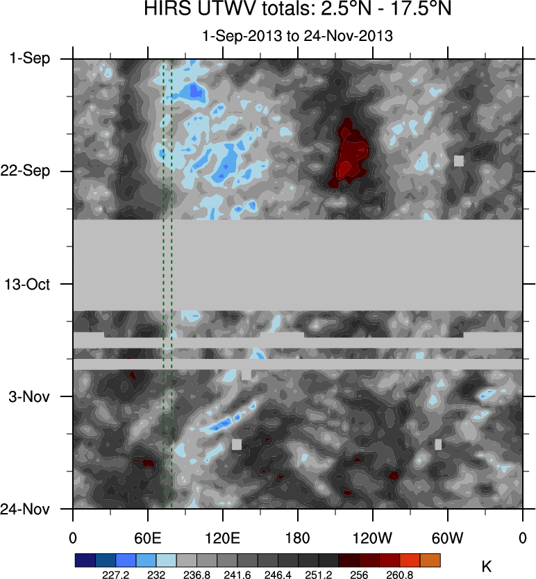 To identify tropical waves in near real-time, the OLR and UTWV data are filtered following Wheeler & Weickmann (2001 MWR). The daily anomalies are calculated using the first 3 harmonics of the seasonal cycle for 1979–2009. Missing values are then filled using linear interpolation in space and time. The most recent 365 days of anomalies are padded with 659 days of zeroes, and the result is filtered for each wave type.